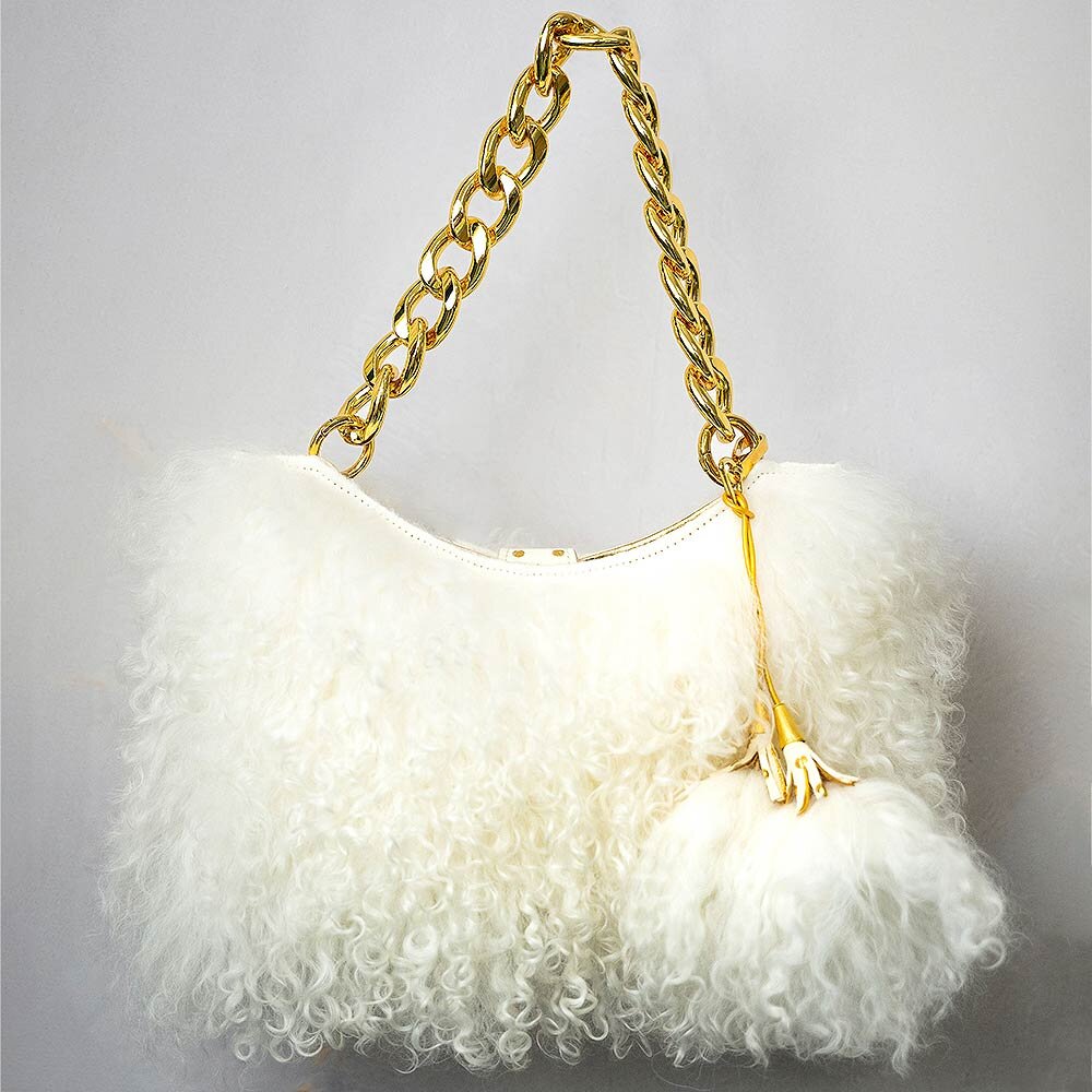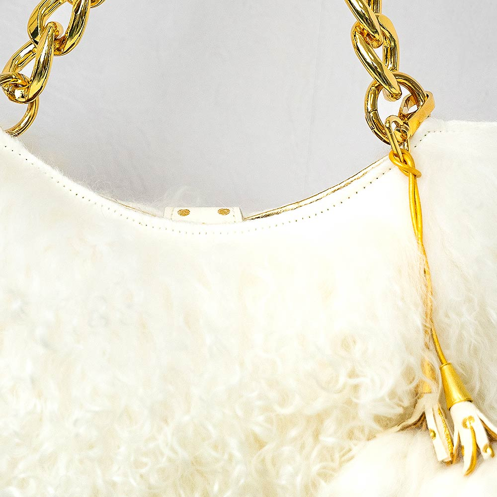 This is our most playful silhouette yet. Handcrafted using the most luxurious custom dyed crème Icelandic sheepskin, curly in texture. Created exclusively for us and lined in the most supple Italian gold lambskin. Replete with custom tasseled pom-poms crowned with 24kt gold plated tassel caps and our own 24kt gold plated Cuban statement chain.