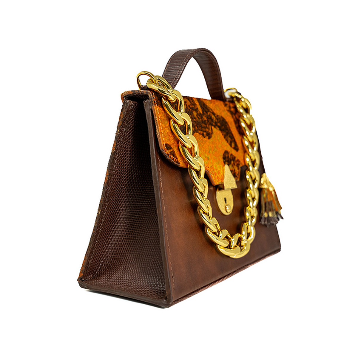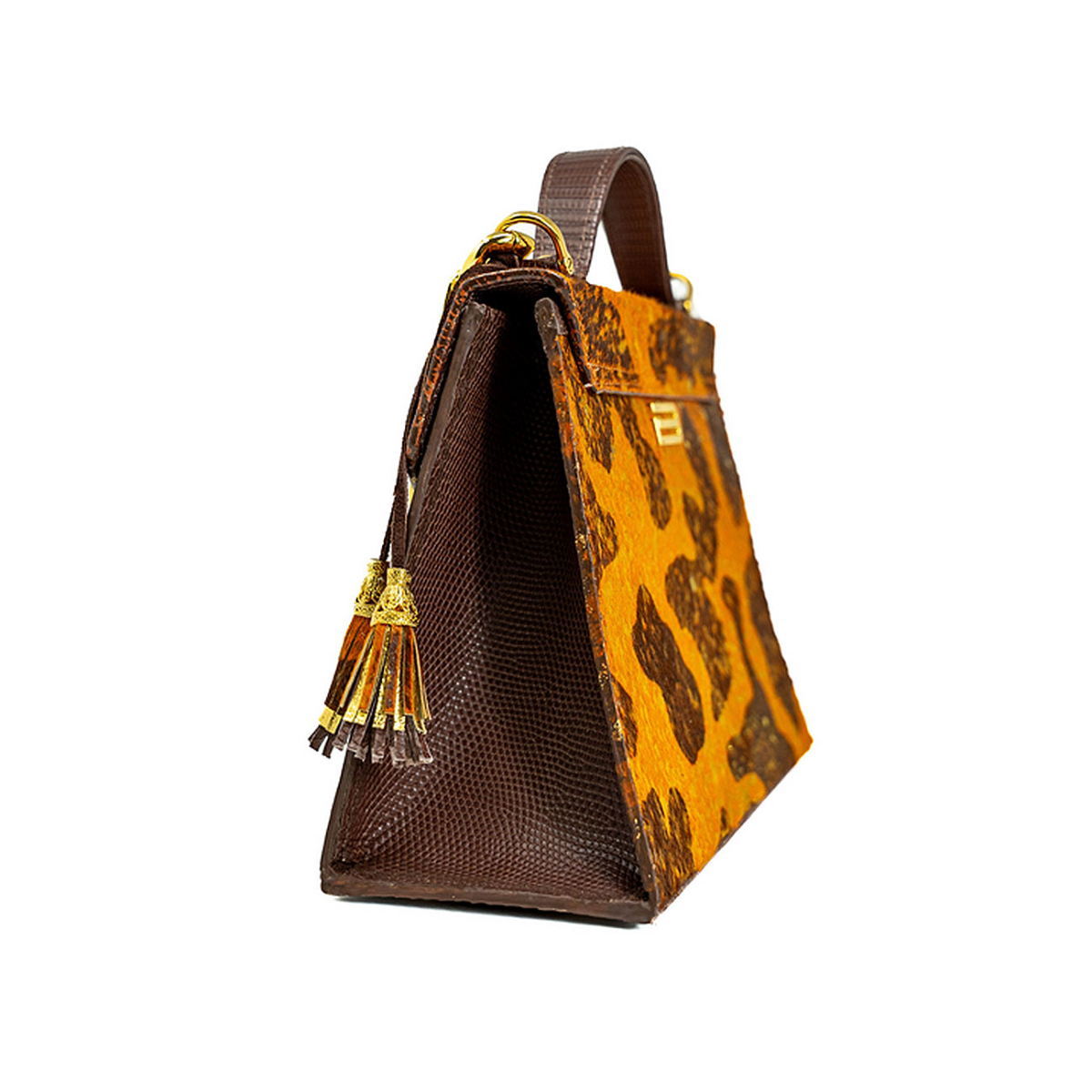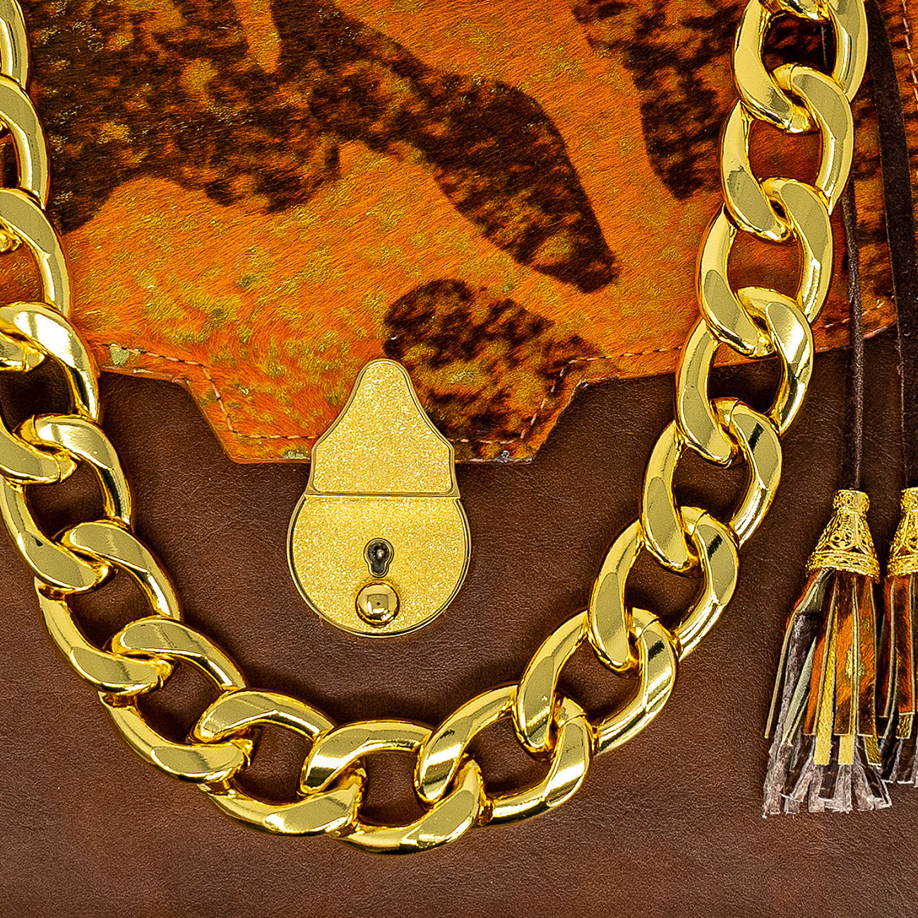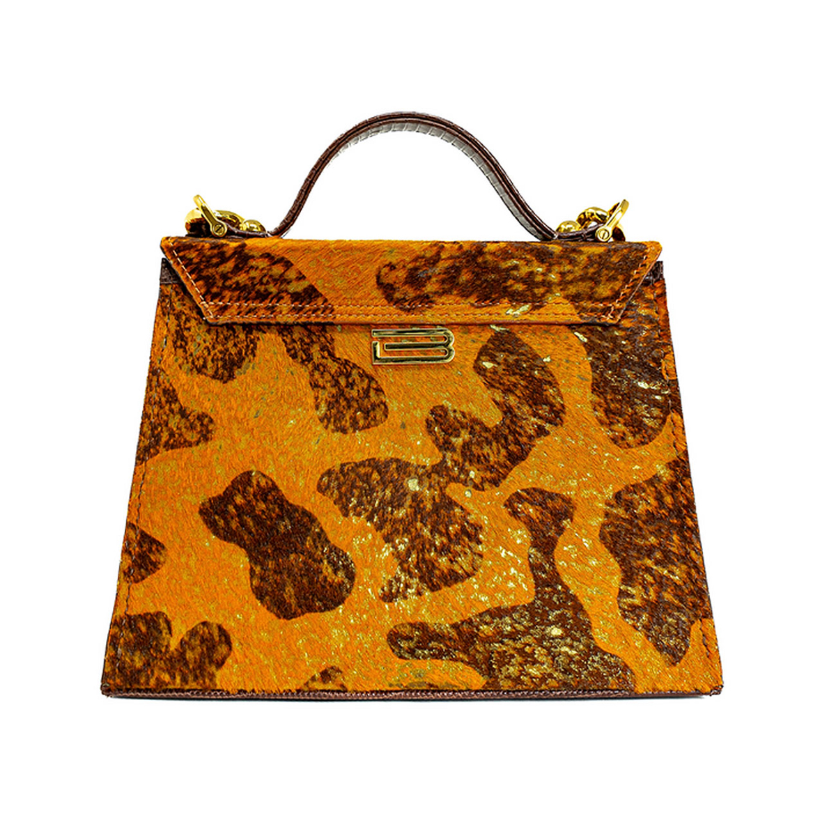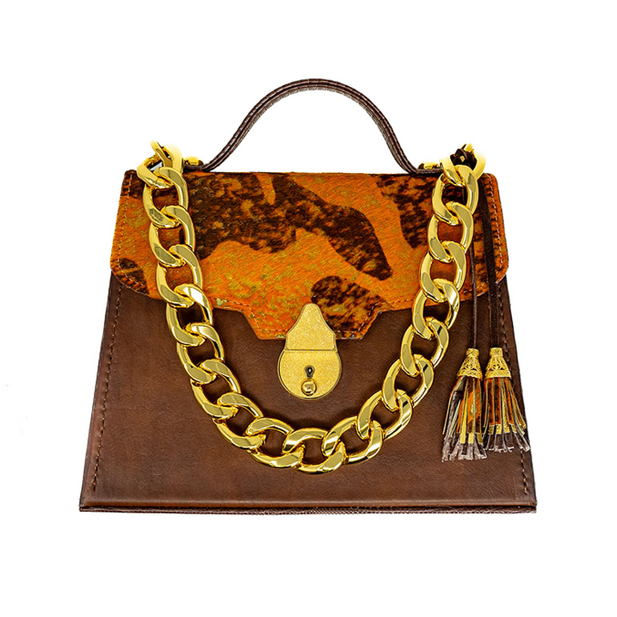 Named for the vibrant orange and brown semi precious stone that is believed by some to enhance creativity. Handcrafted in our very own workshop and made of the finest Italian marbleized chestnut and metallic hand painted hair on calf skins. This Casey can be worn either as a crossbody or by hand. Thanks to its elegant design and 24kt gold plated lock closure, this top handle bag promises to make a major entrance wherever you bring her. Lined in the most supple Italian metallic gold lambskin. Replete with our own 24kt gold plated Cuban statement chain.
