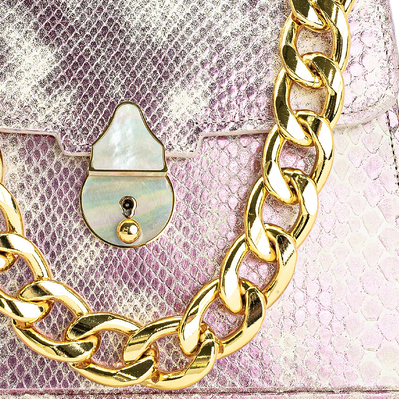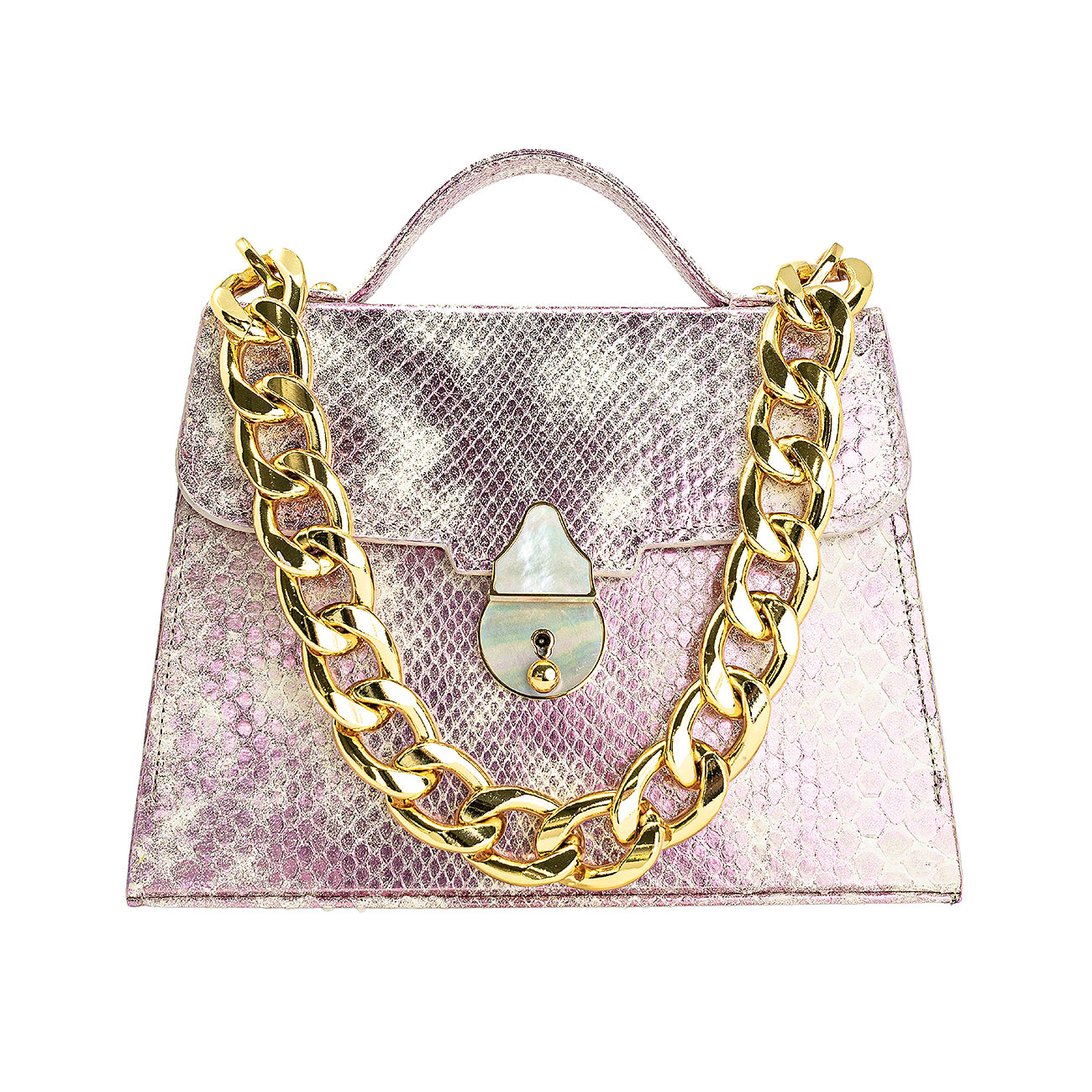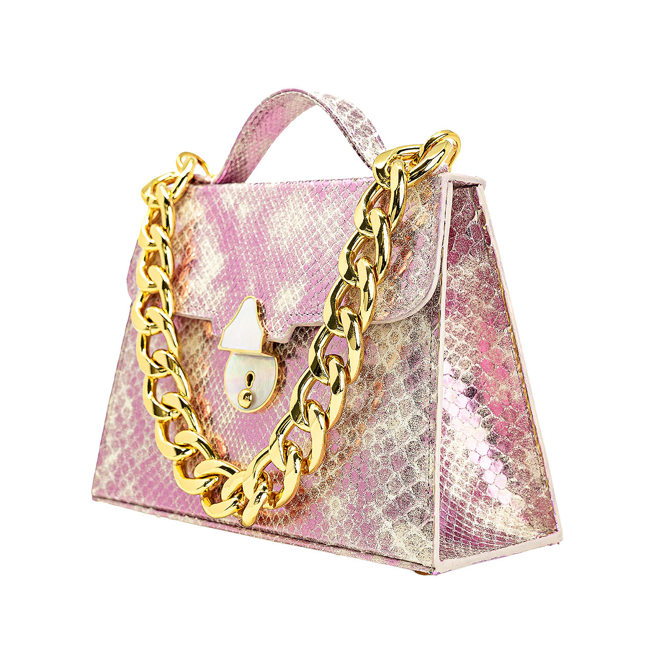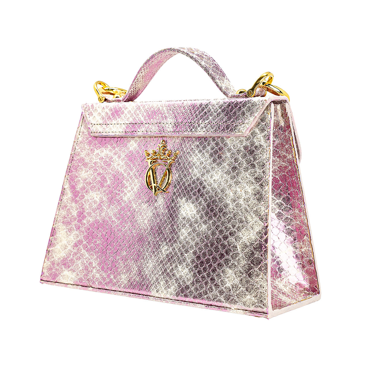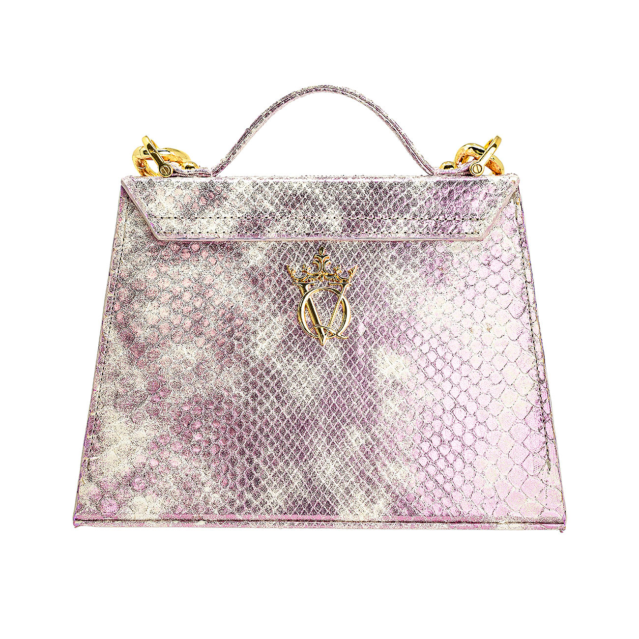 Handcrafted in our very own workshop and made of the finest rare exotic Python. This refined silhouette showcases the highly skilled intricately marbleized effect in metallic royal pink and ivory created in an exclusive boutique Italian tannery. Thanks to its elegant design and our 24kt gold plated lock closure, this top handle bag promises to make a major entrance wherever you bring her. Lined our signature Queen of Versailles metallic blush and gold Italian lambskin. Replete with 24kt gold QV Logo our own 24kt gold plated Cuban statement chain.
