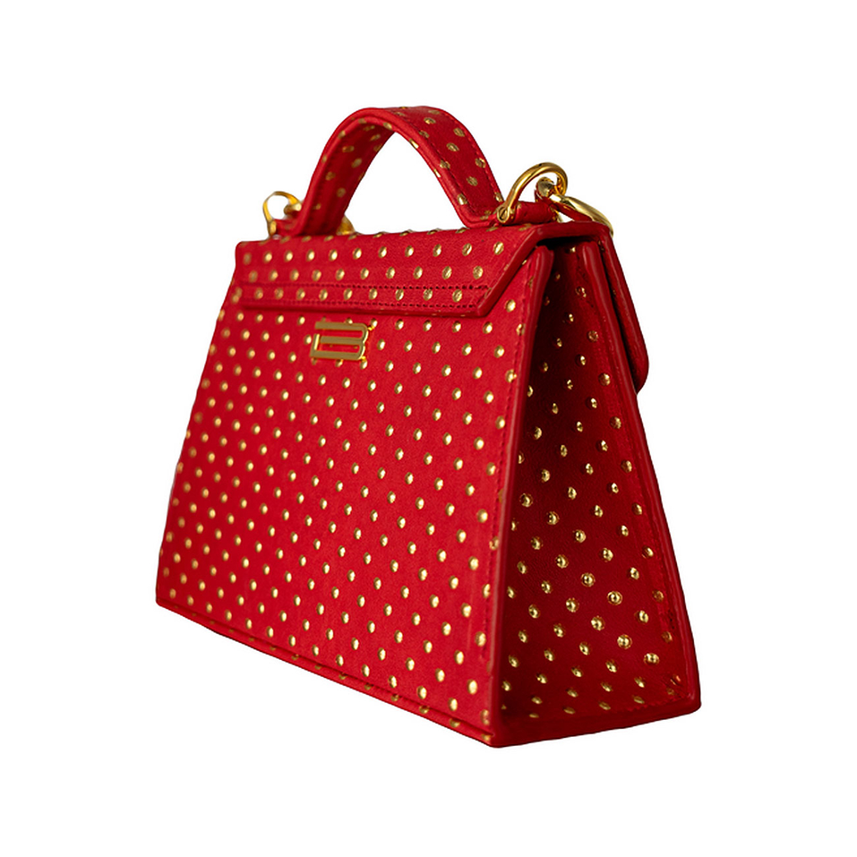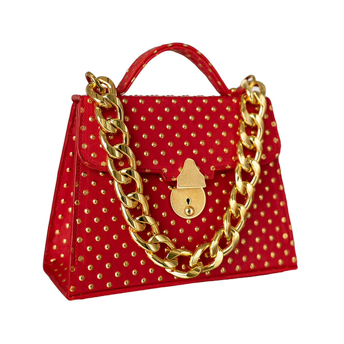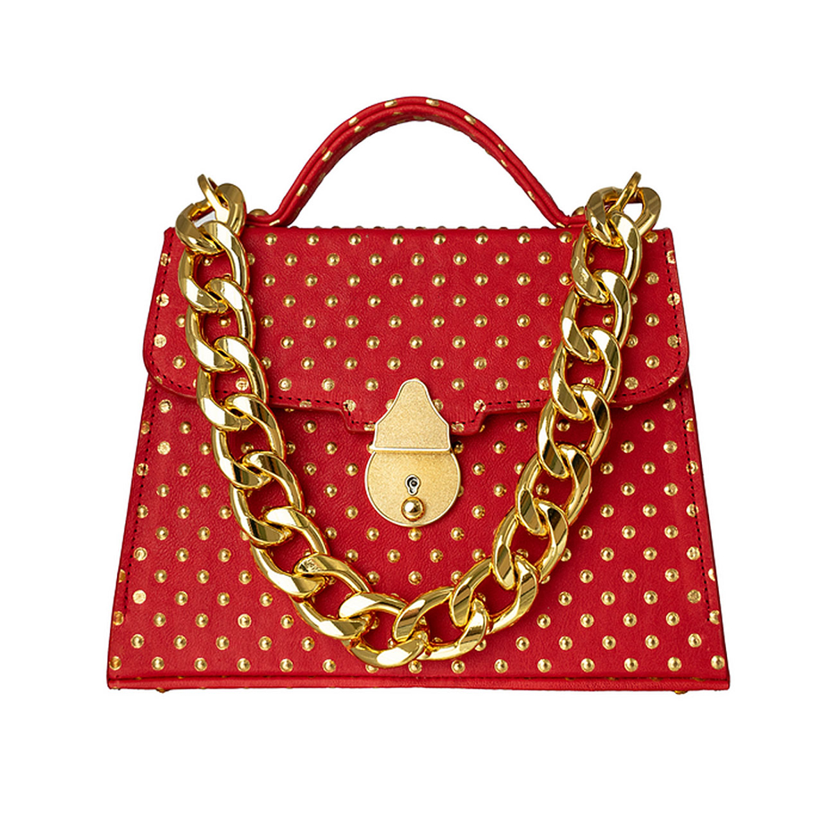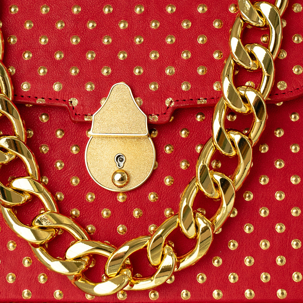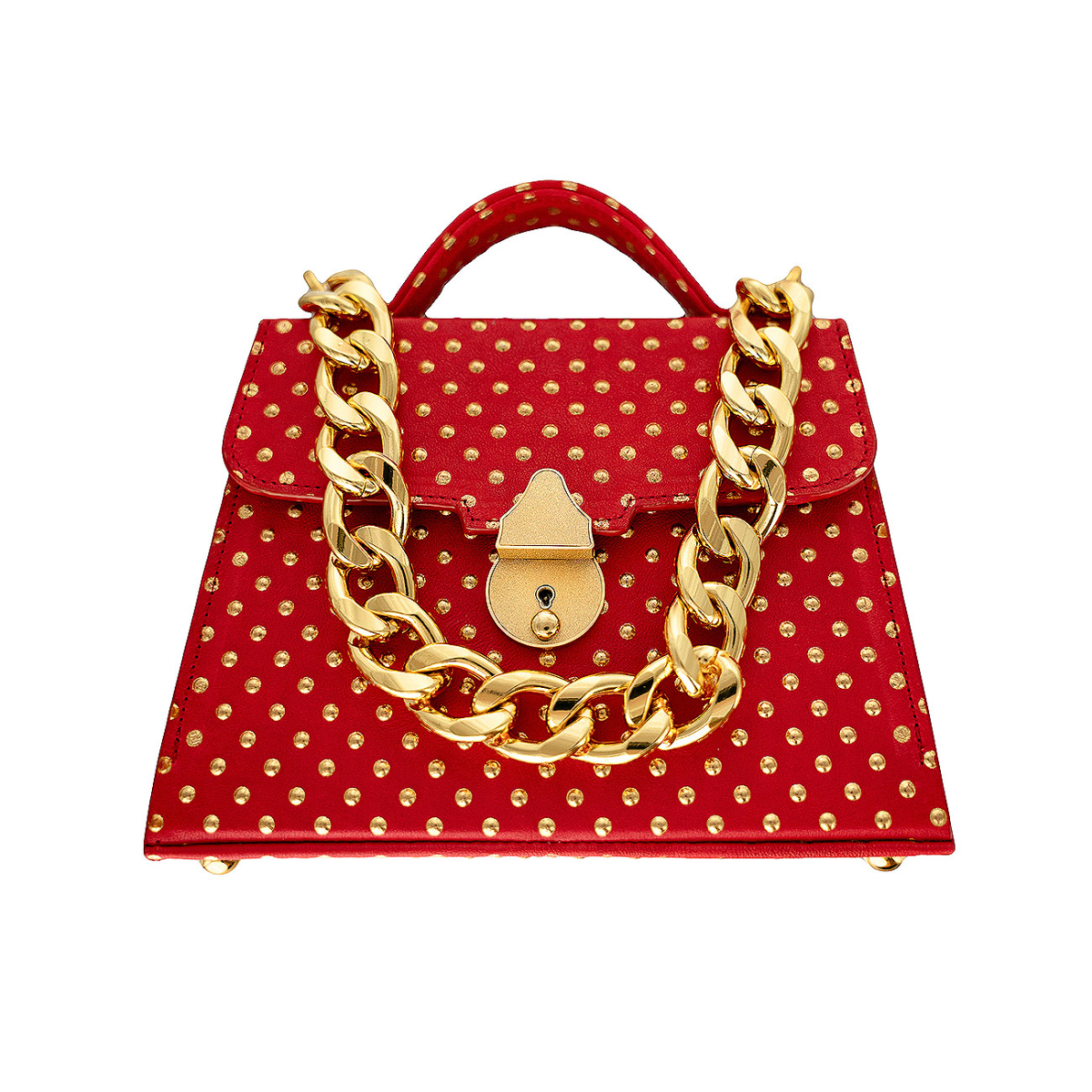 Handcrafted in our very own workshop and made of the finest Italian leather, this Casey Petite can be worn either as a crossbody or by hand. Thanks to its elegant design and 24kt gold plated lock closure, this top handle bag promises to make a major entrance wherever you bring her. Discover a seamless symphony wrapped in the most luxurious inferno calfskin embossed and artfully embellished with delicate golden rivets, sourced from an intimate boutique family tannery in the Marche region of Italy. Meticulously situated in a timeless diamond pattern, it is reminiscent of the Deco period where artists often implemented circles in repetitive patterns with a purpose to evoke elegance and sophistication. Lined in the most supple Italian metallic gold lambskin. Replete with our own 24kt gold plated Cuban statement chain.