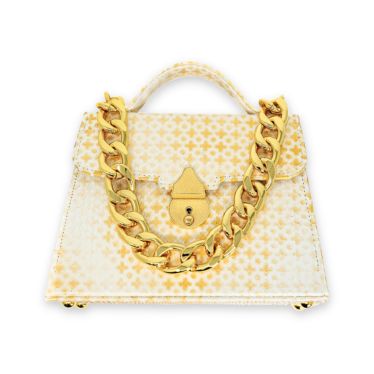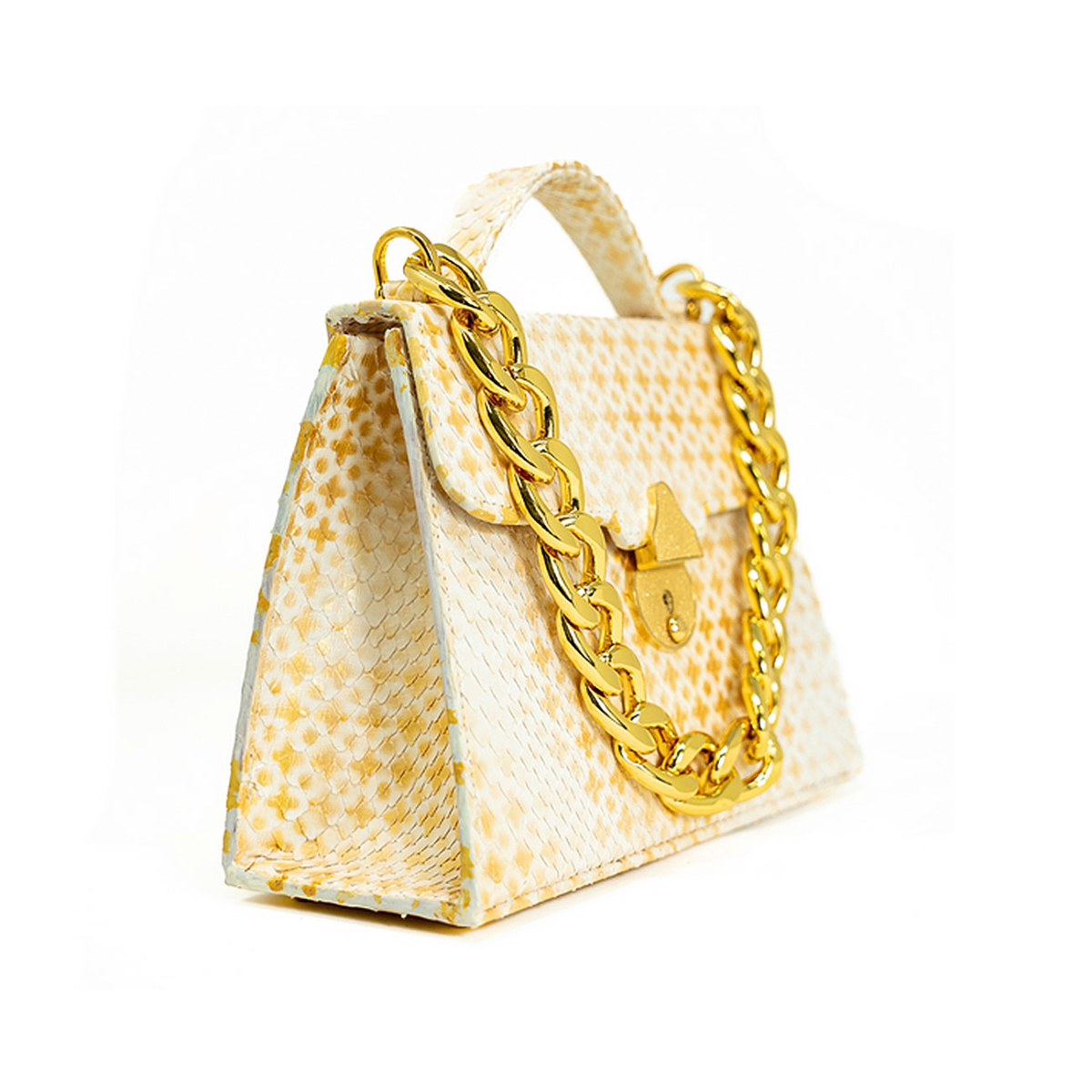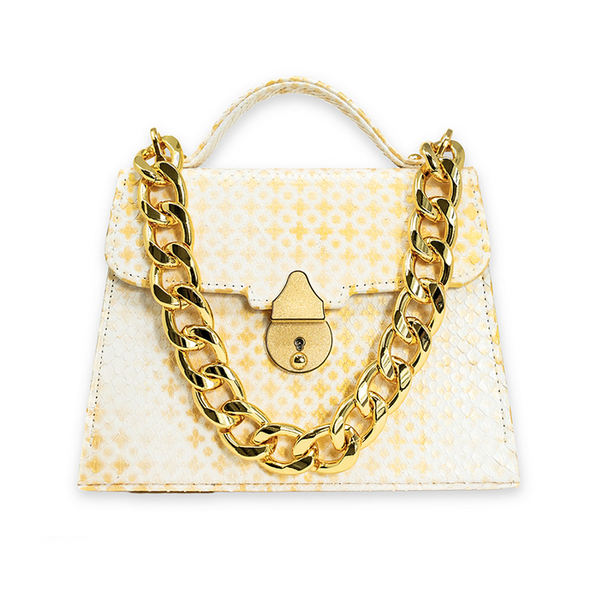 Handcrafted in our very own workshop and made of the finest exotic python, this Casey Petite can be worn either as a crossbody or by hand. Thanks to its elegant design and 24kt gold plated lock closure, this top handle bag promises to make a major entrance wherever you bring her. Discover a seamless symphony wrapped in the most luxurious batik hand block printed ivory python, artfully gilded with a diamond pattern and then finished with an masterfully applied antique patina. Replete with our own 24kt gold plated Cuban statement chain.