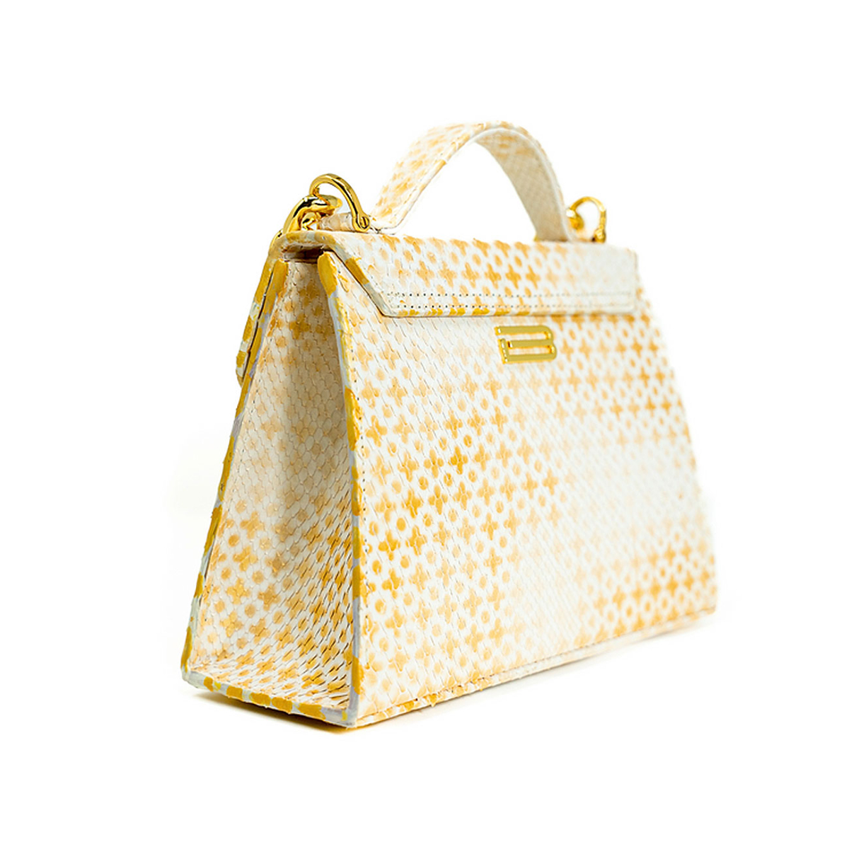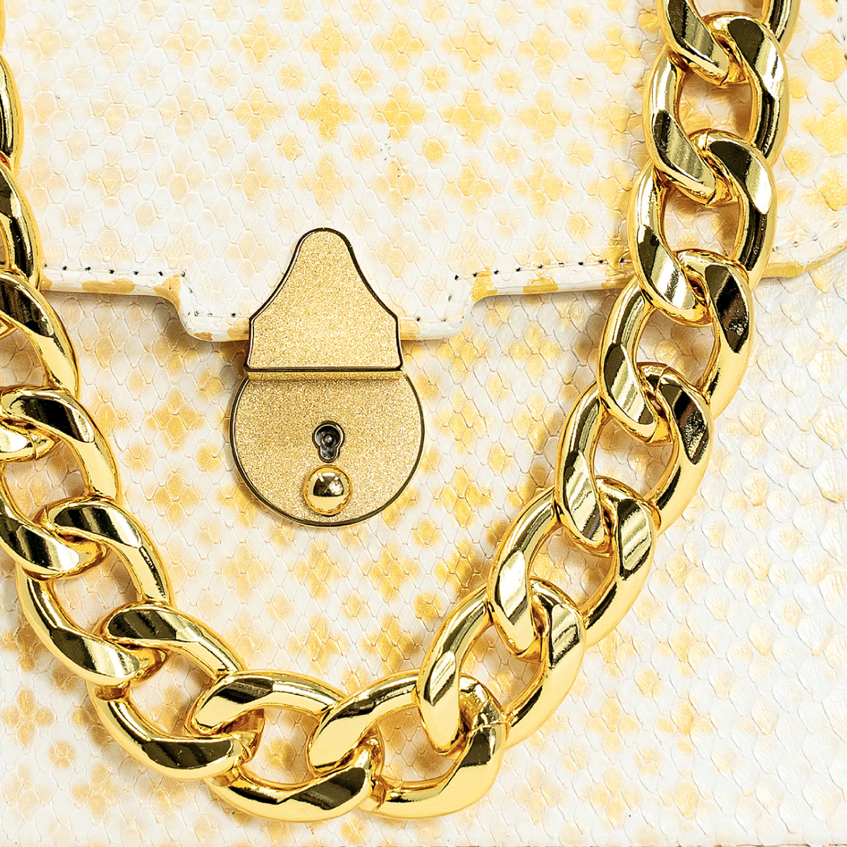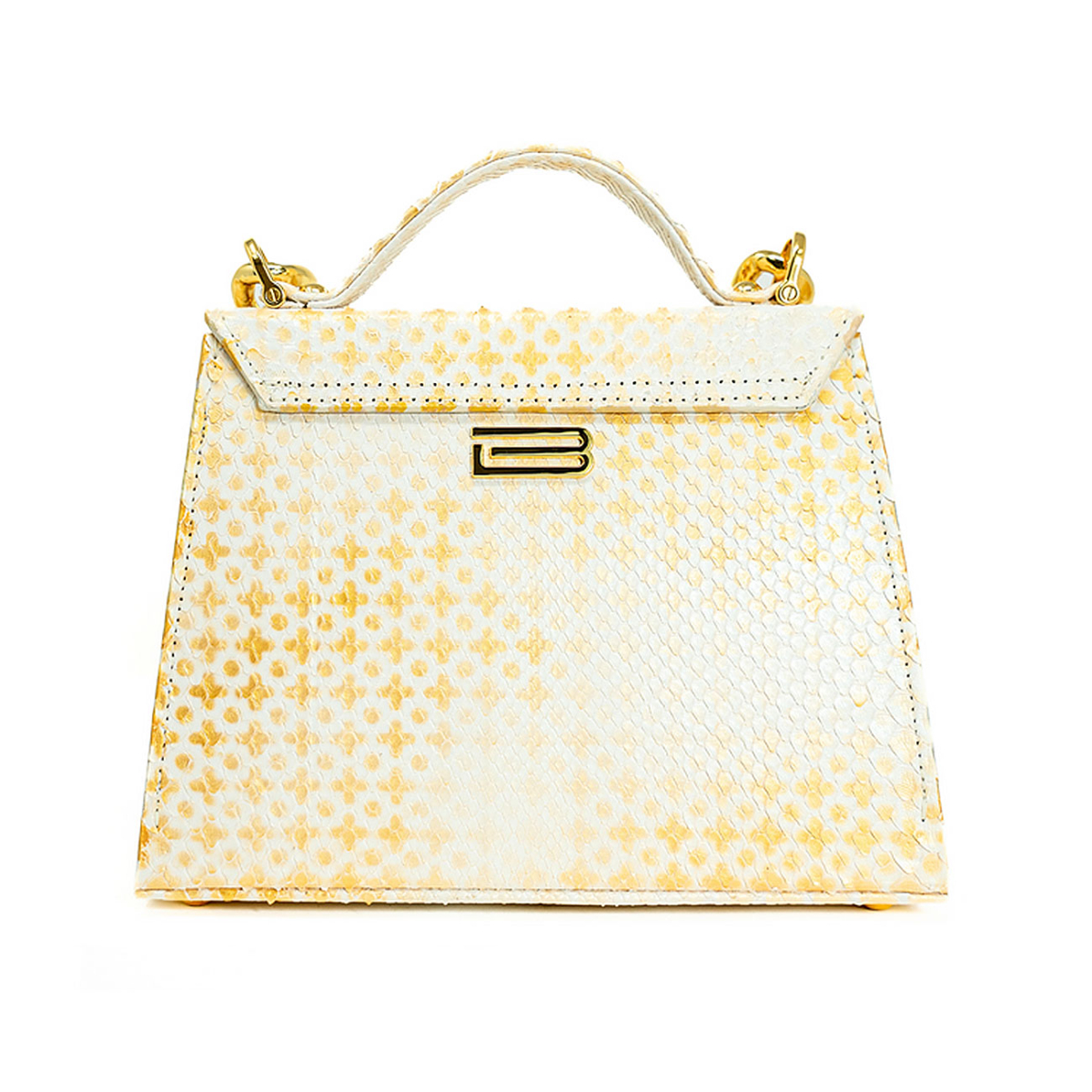 Handcrafted in our very own workshop and made of the finest exotic python, this Casey Petite can be worn either as a crossbody or by hand. Thanks to its elegant design and 24kt gold plated lock closure, this top handle bag promises to make a major entrance wherever you bring her. Discover a seamless symphony wrapped in the most luxurious batik hand block printed ivory python, artfully gilded with a diamond pattern and then finished with an masterfully applied antique patina. Replete with our own 24kt gold plated Cuban statement chain.