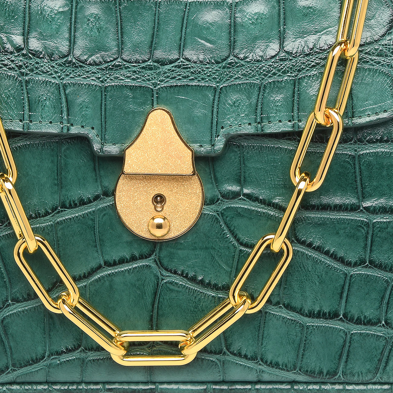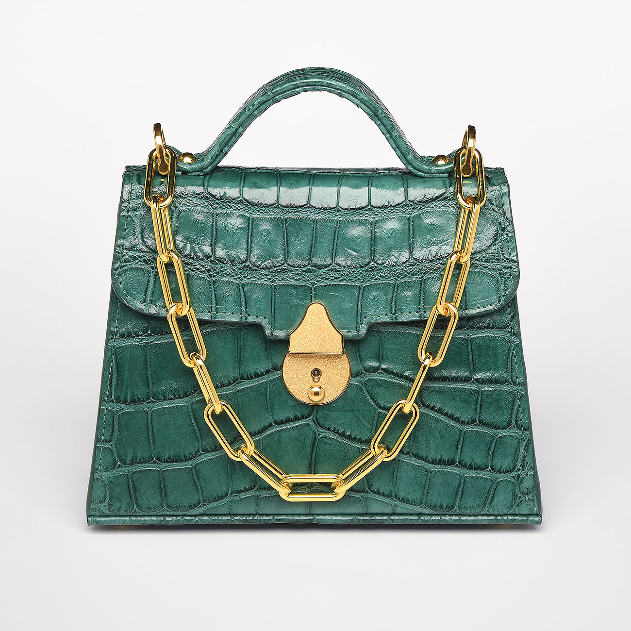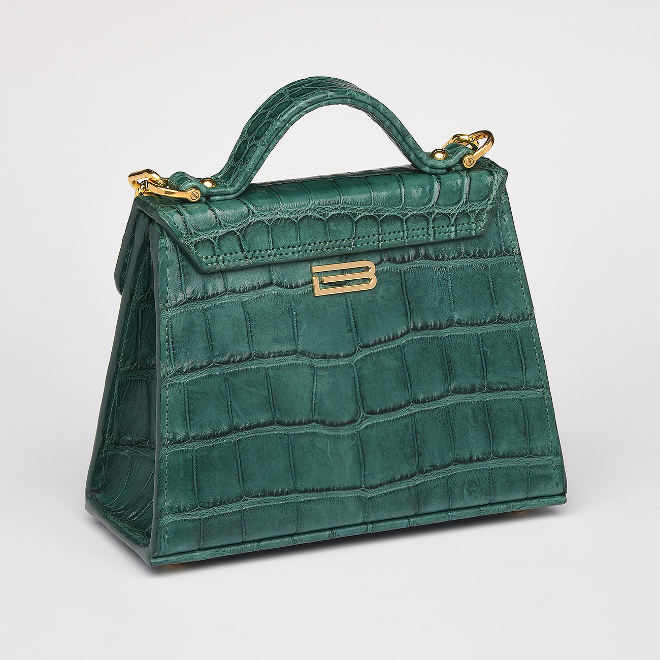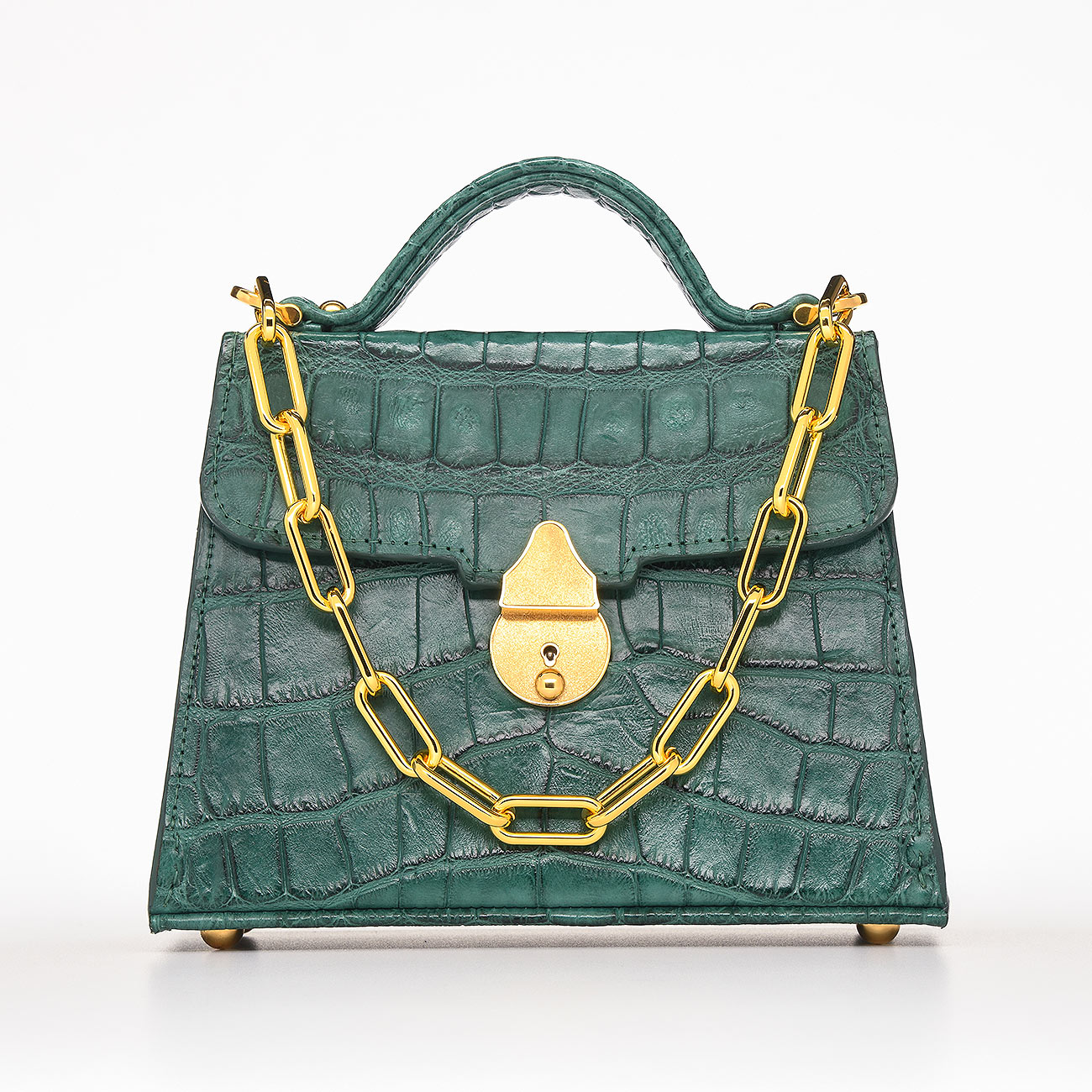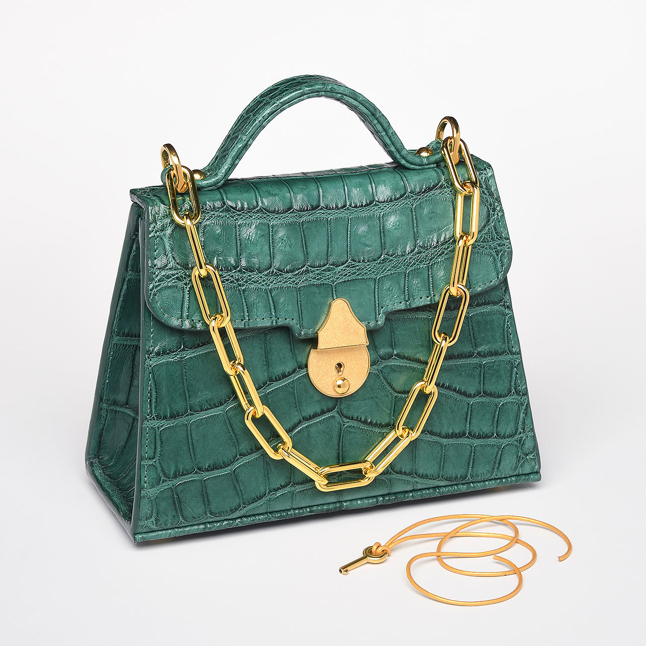 This one-of-a-kind work of art created with a genuine Florida alligator tanned in a matte jade finish. Lined in the most exquisite denim suede trimmed with gold. Replete with our custom 24k key lock closure and Venetian chain.This extraordinary alligator, harvested in the fall of 2020, exemplifies the skill of God’s Country Outfitters, the finest hunting outfit in Florida. GCO’s participation in the alligator harvest program is crucial for managing the local population and protecting our ecosystems. After enduring a stormy night, the guides’ perseverance led to a successful catch. The alligator’s skin was tanned in a hunter green color, symbolizing our dedication to preserving Florida’s lush environment and commitment to conservation. One-of-a-kind