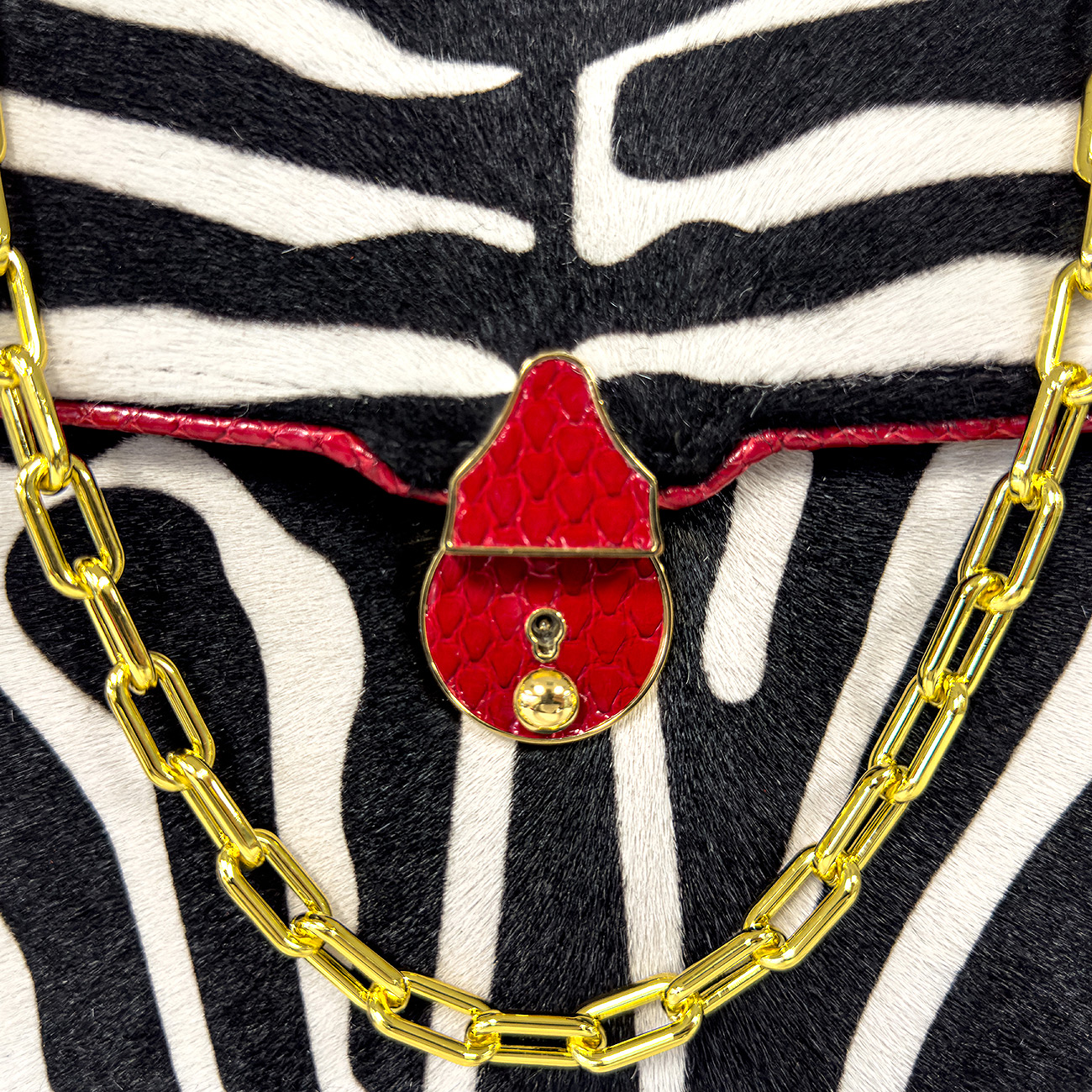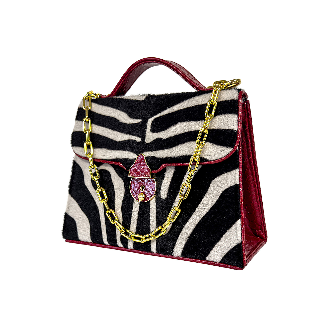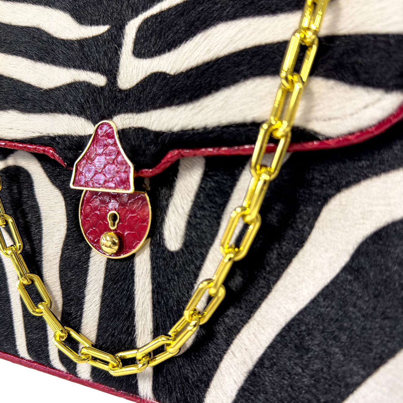 Meticulously trimmed in crimson glazed python, the design is elevated with depth, texture, and a flash of high-impact color. At its heart, a custom python-wrapped key lock closure finished in 24-karat gold plate serves as a jewel-like focal point—both functional and sculptural. The interior is lined in supple crimson suede, while a sleek stainless-steel chain completes the piece with modern polish.