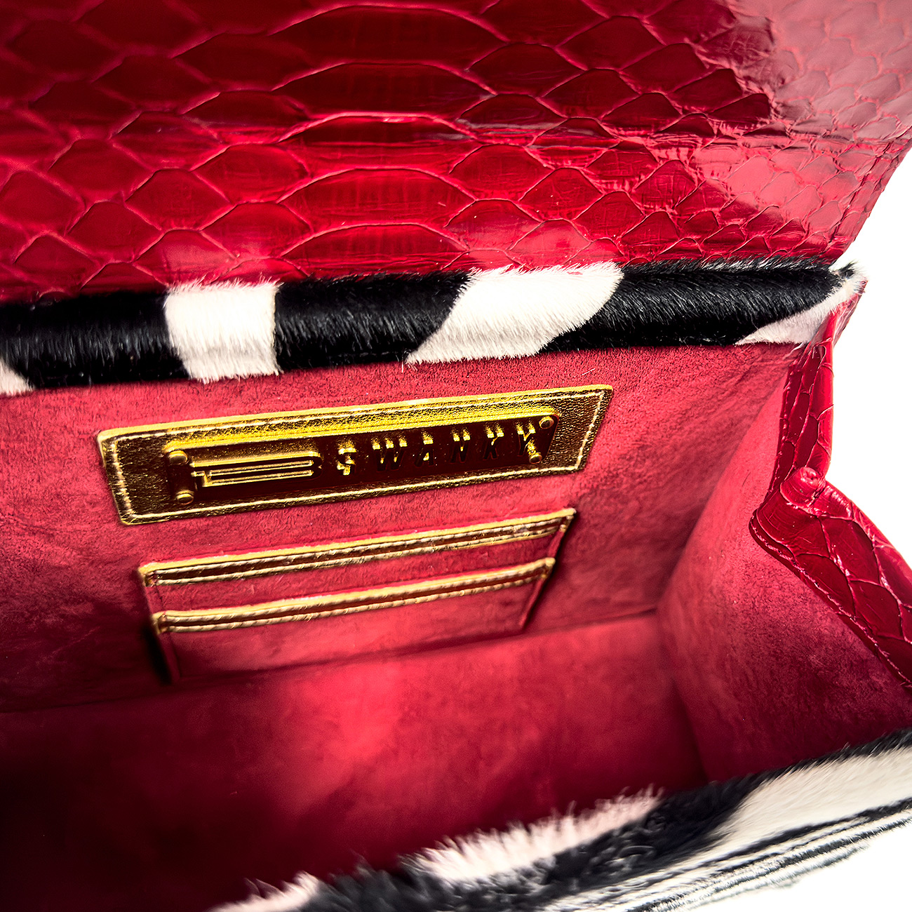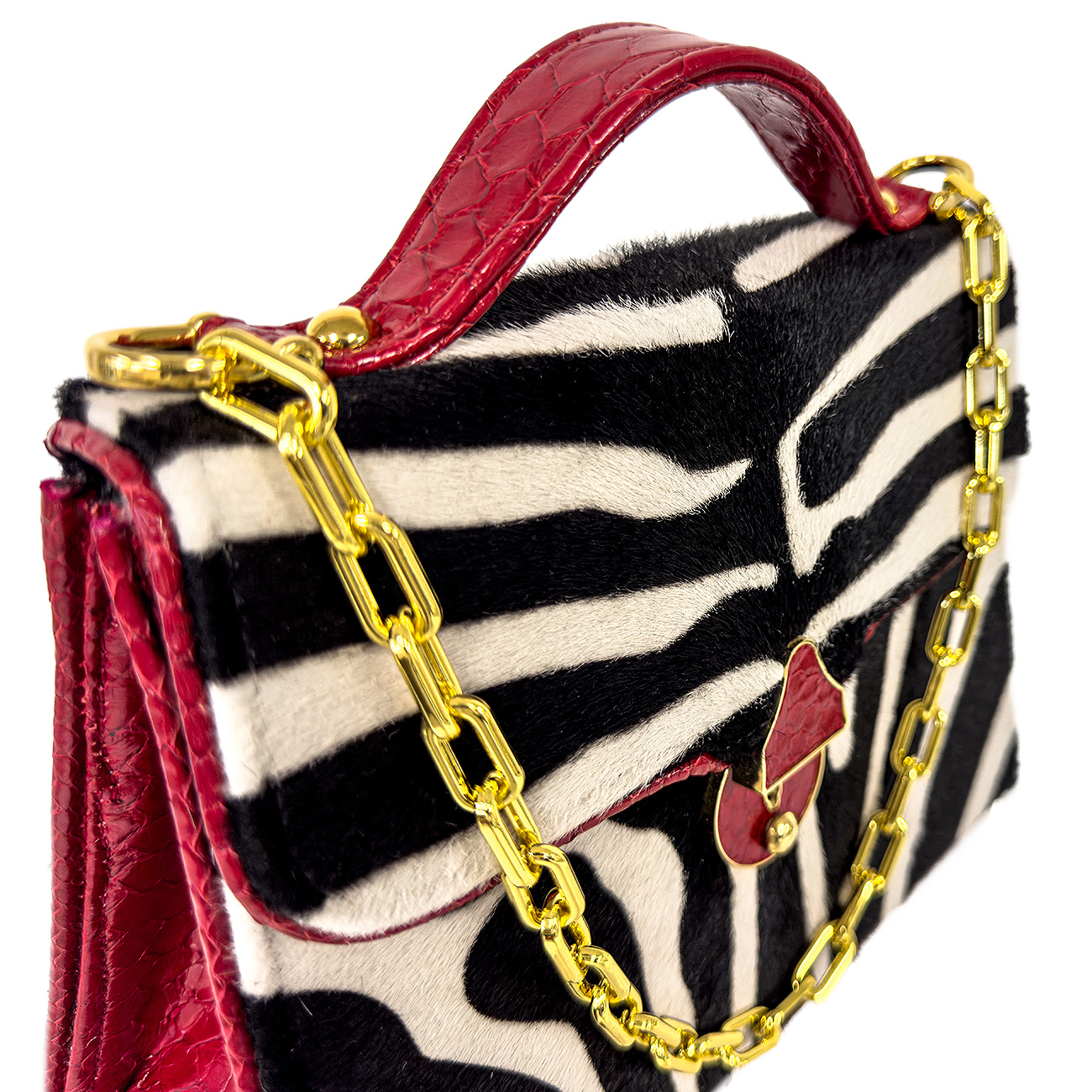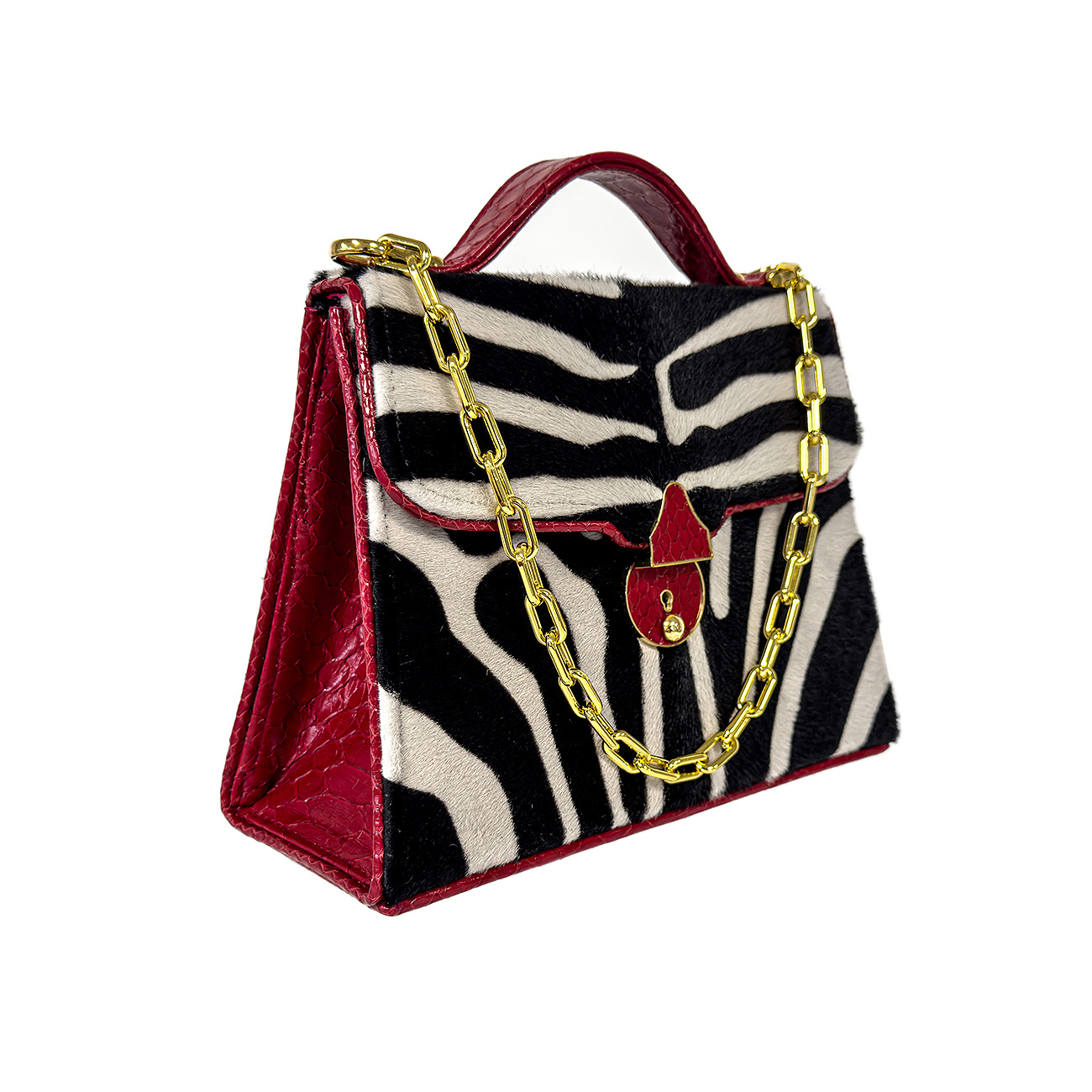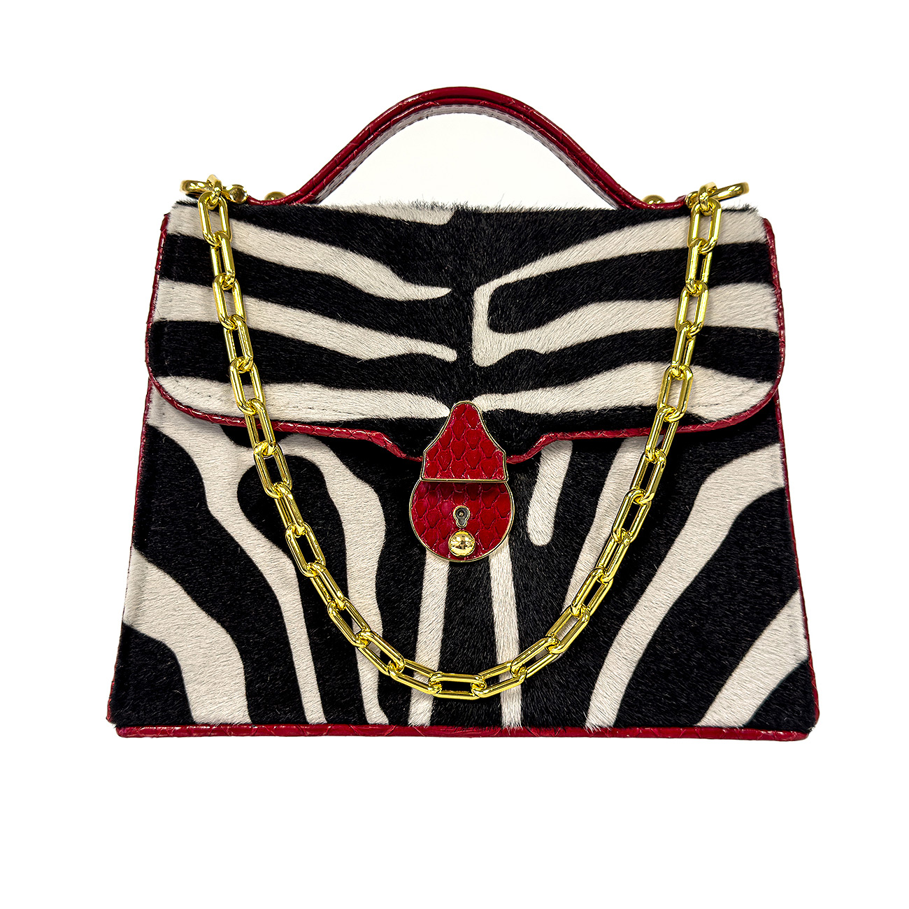 Meticulously trimmed in crimson glazed python, the design is elevated with depth, texture, and a flash of high-impact color. At its heart, a custom python-wrapped key lock closure finished in 24-karat gold plate serves as a jewel-like focal point—both functional and sculptural. The interior is lined in supple crimson suede, while a sleek stainless-steel chain completes the piece with modern polish.