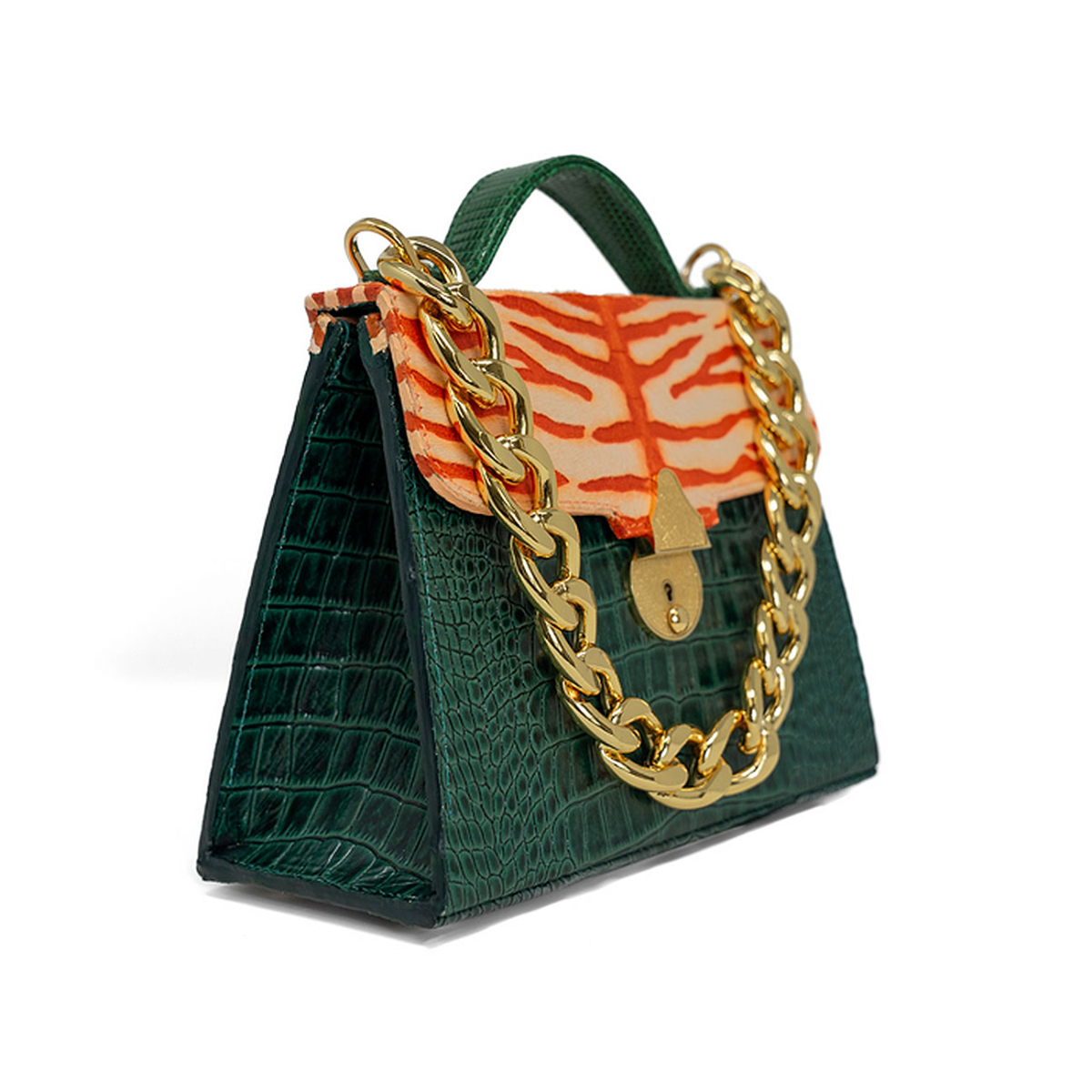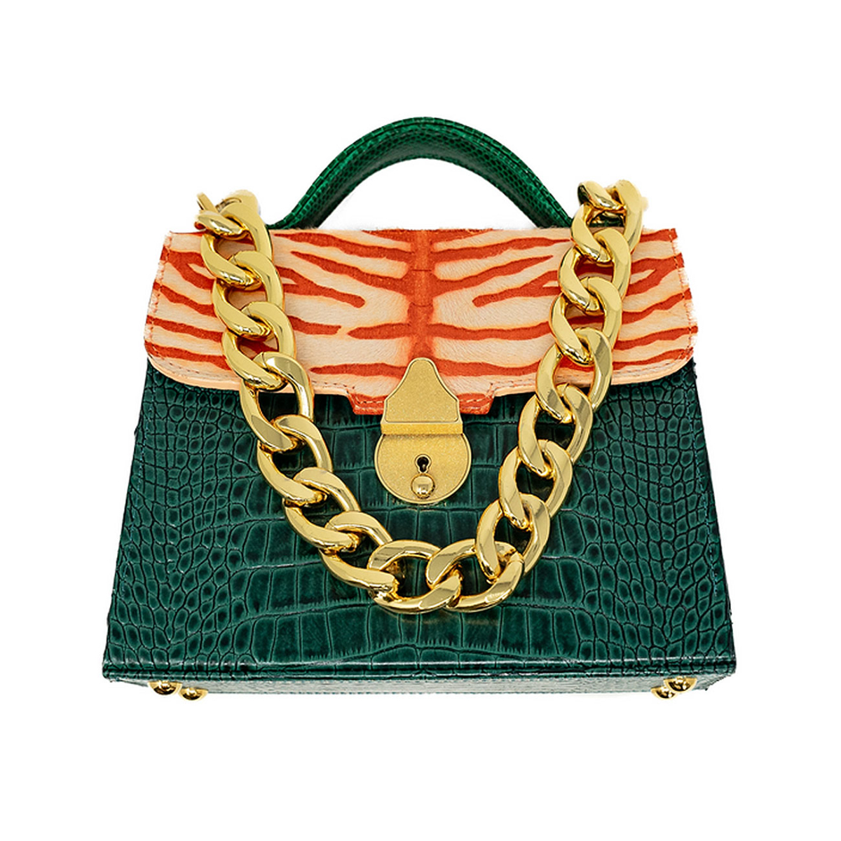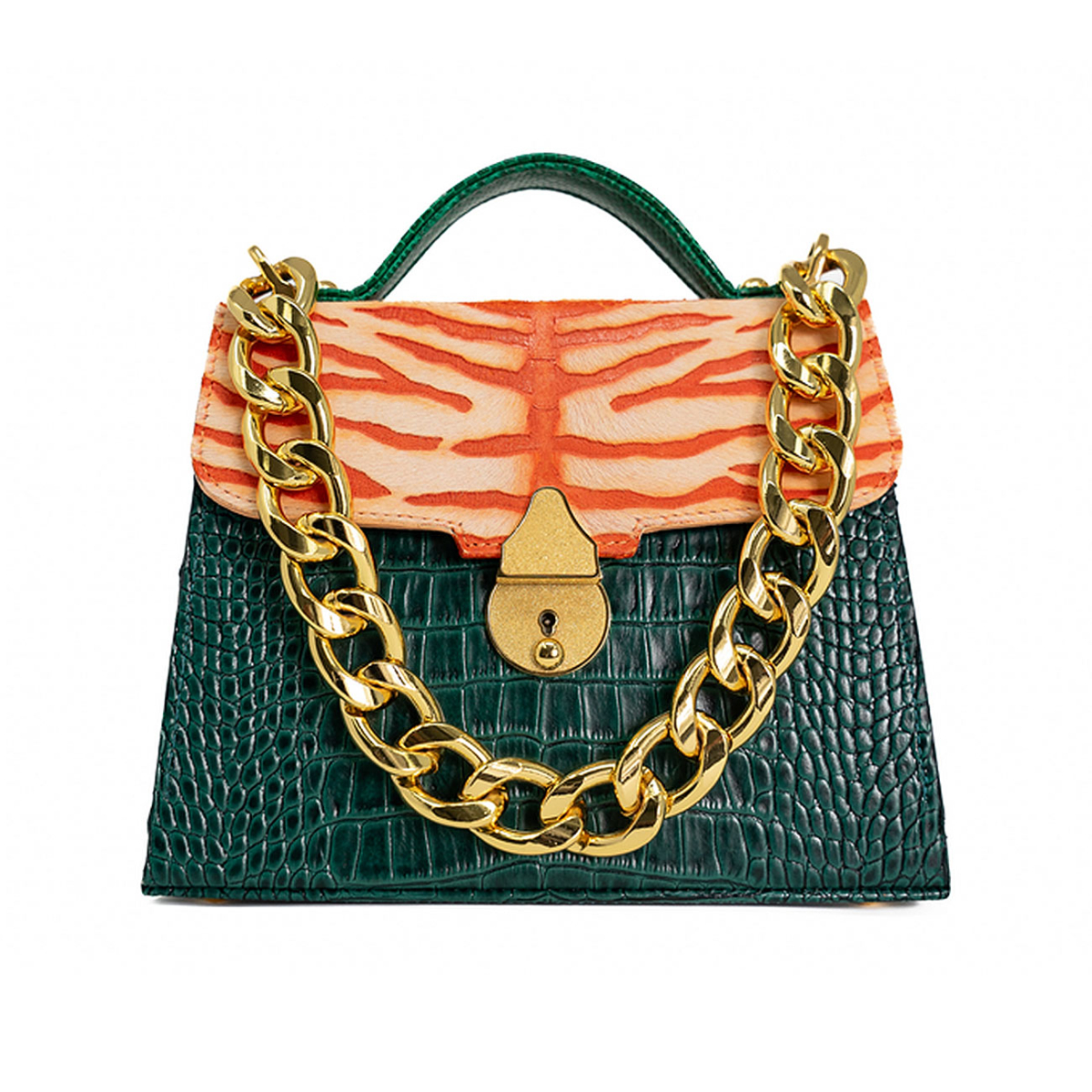 This truly unique Casey Petite is wrapped in the richest jade alligator embossed Italian calfskin. Handled with a rare flawless jade lizard skin and crowned in a creme and tangerine calfskin hand block printed with a zebra motif. A vibrant contrast of color is reminiscent of the coveted iridescent gemstone, ammolite on this one-of-a-kind Casey Petite that can be worn either as a crossbody or by hand. Thanks to its elegant design and 24kt gold plated lock closure, this top handle bag promises to make a major entrance wherever you bring her. Lined in the most supple Italian metallic gold lambskin. Replete with our own 24kt gold plated Cuban statement chain.