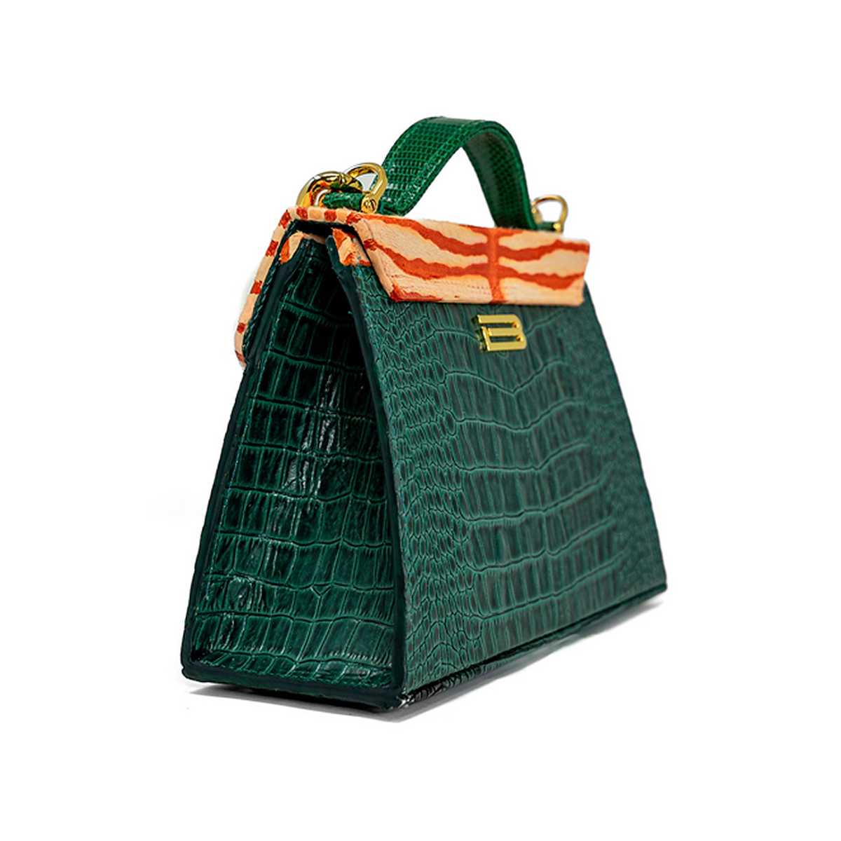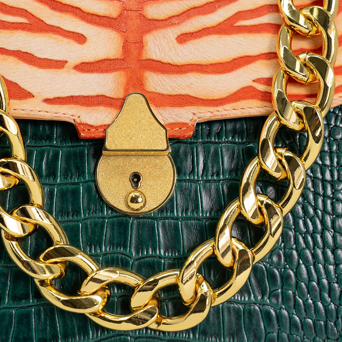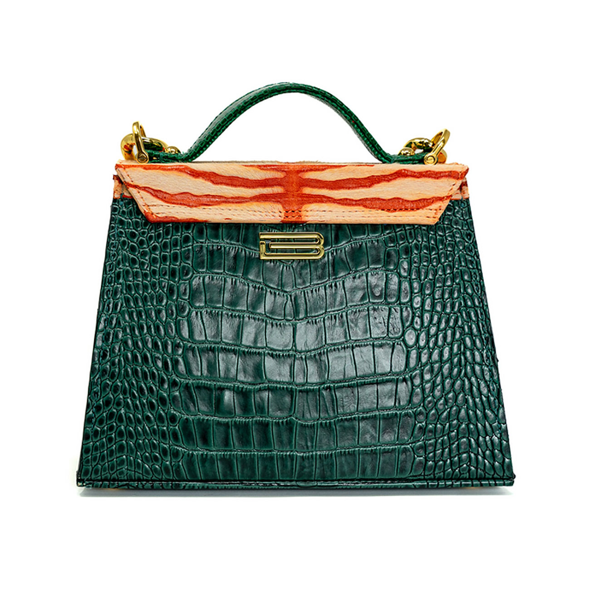 This truly unique Casey Petite is wrapped in the richest jade alligator embossed Italian calfskin. Handled with a rare flawless jade lizard skin and crowned in a creme and tangerine calfskin hand block printed with a zebra motif. A vibrant contrast of color is reminiscent of the coveted iridescent gemstone, ammolite on this one-of-a-kind Casey Petite that can be worn either as a crossbody or by hand. Thanks to its elegant design and 24kt gold plated lock closure, this top handle bag promises to make a major entrance wherever you bring her. Lined in the most supple Italian metallic gold lambskin. Replete with our own 24kt gold plated Cuban statement chain.