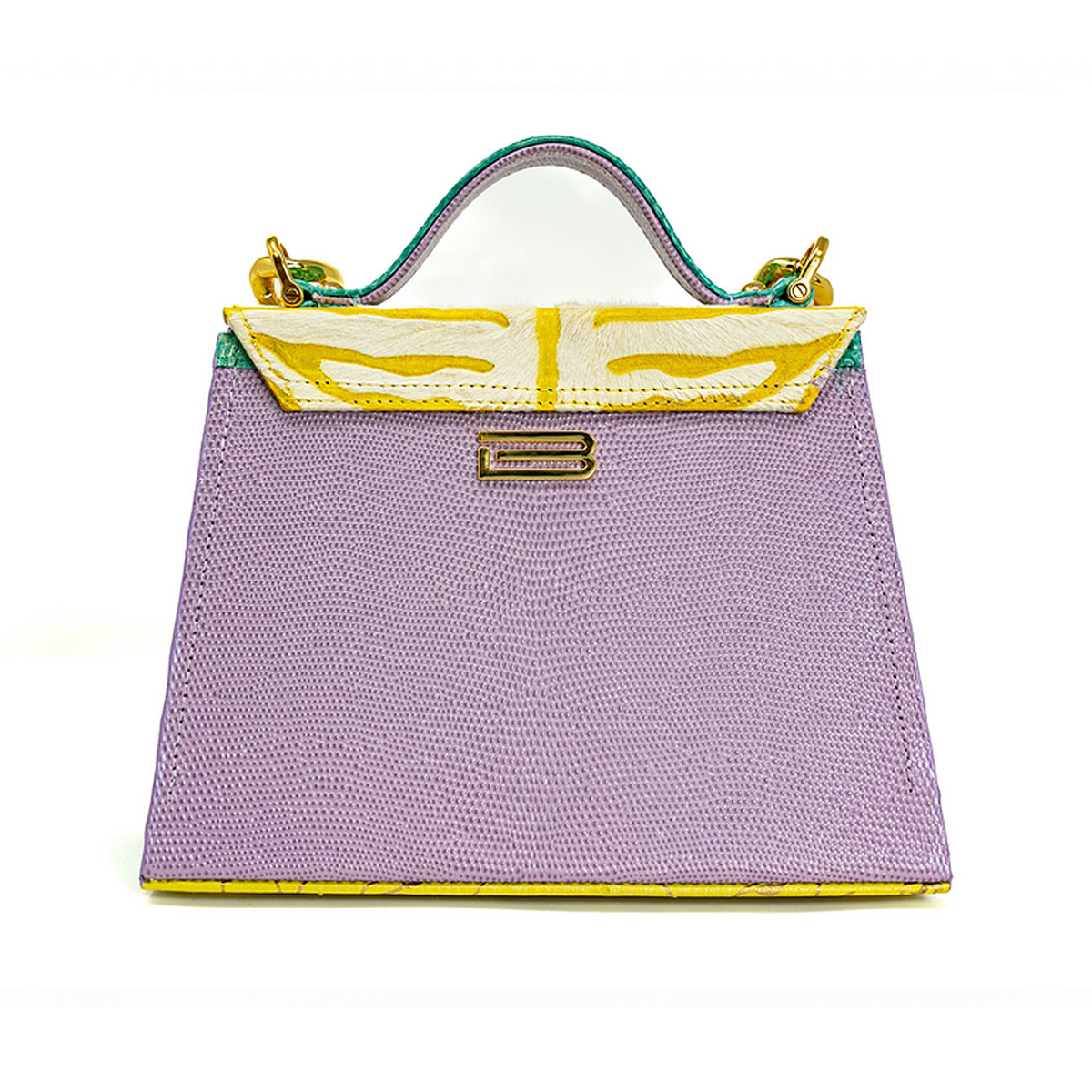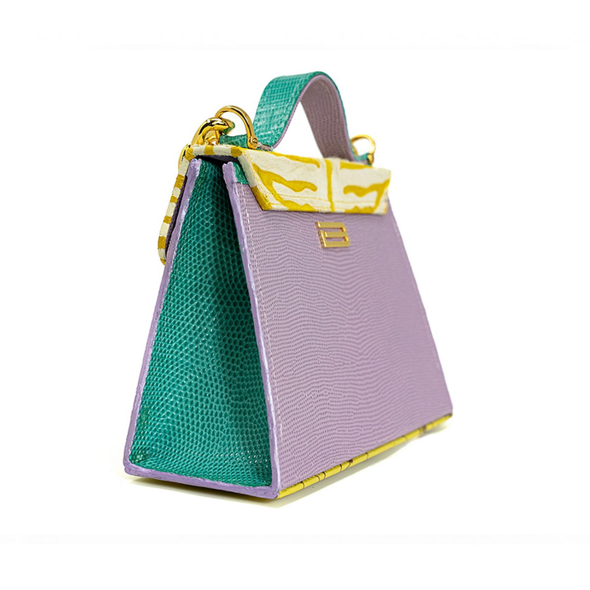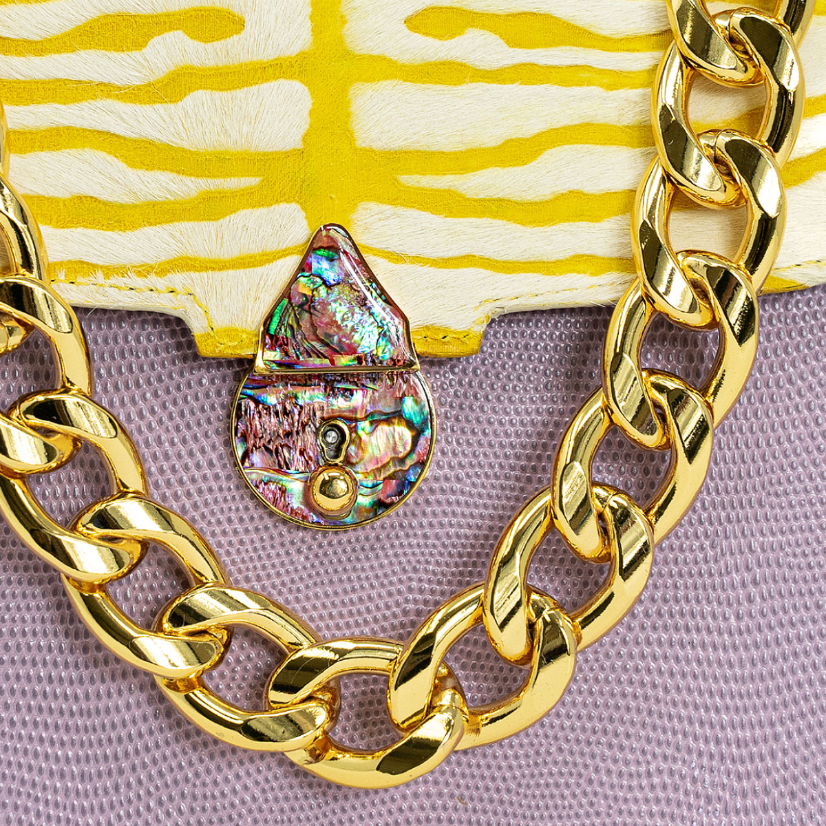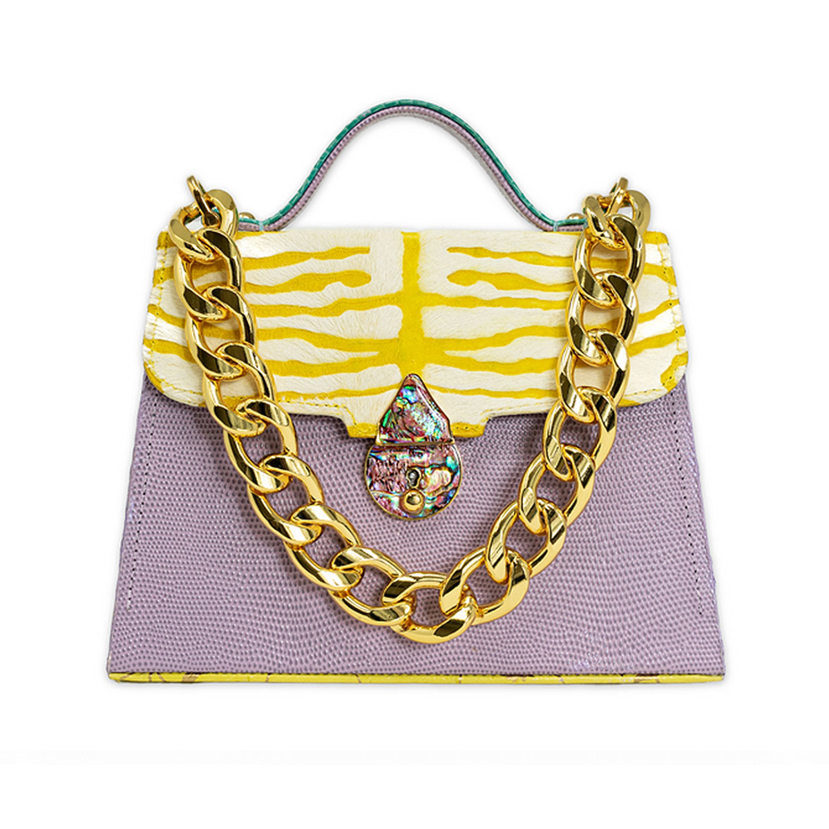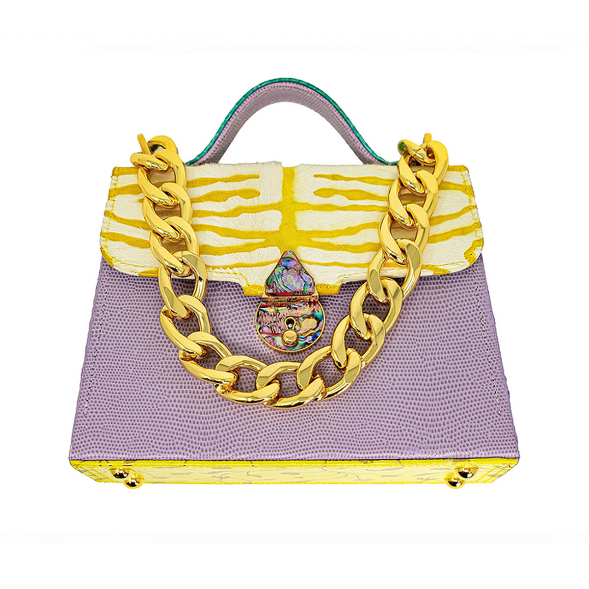 Handcrafted in our very own workshop and made of the finest exotic ostrich, lizard and calfskin, this Casey Petite can be worn either as a crossbody or by hand. Thanks to its elegant design and hand selected multicolor shell and 24kt gold plated lock closure, this top handle bag promises to make a major entrance wherever you bring her. Neutral has never been so refined. She boasts an amethyst Italian calfskin on her front and back, flanked with flawless lizard in turquoise, crowned with a bold yellow zebra hair on calfskin and flanked and handled in the rarest Parisienne flattened pearl gold leaf yellow ostrich. Lined in the most supple Italian metallic turquoise lambskin. Replete with our own 24kt gold plated Cuban statement chain.