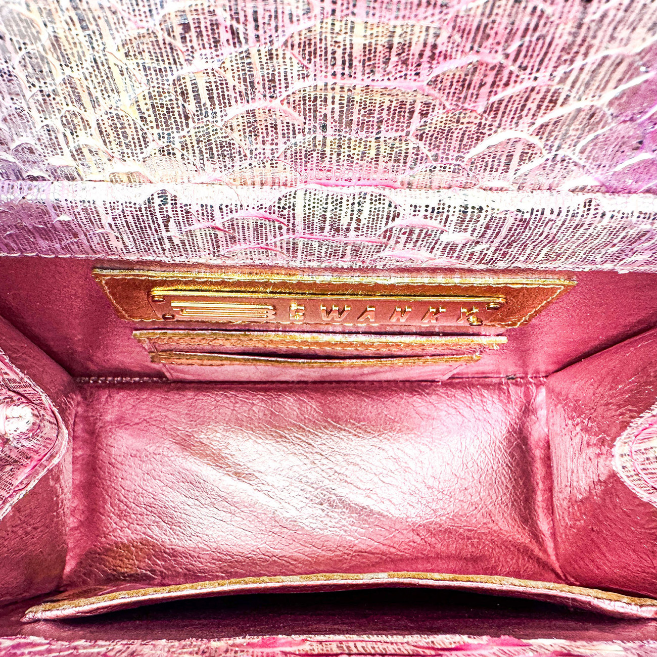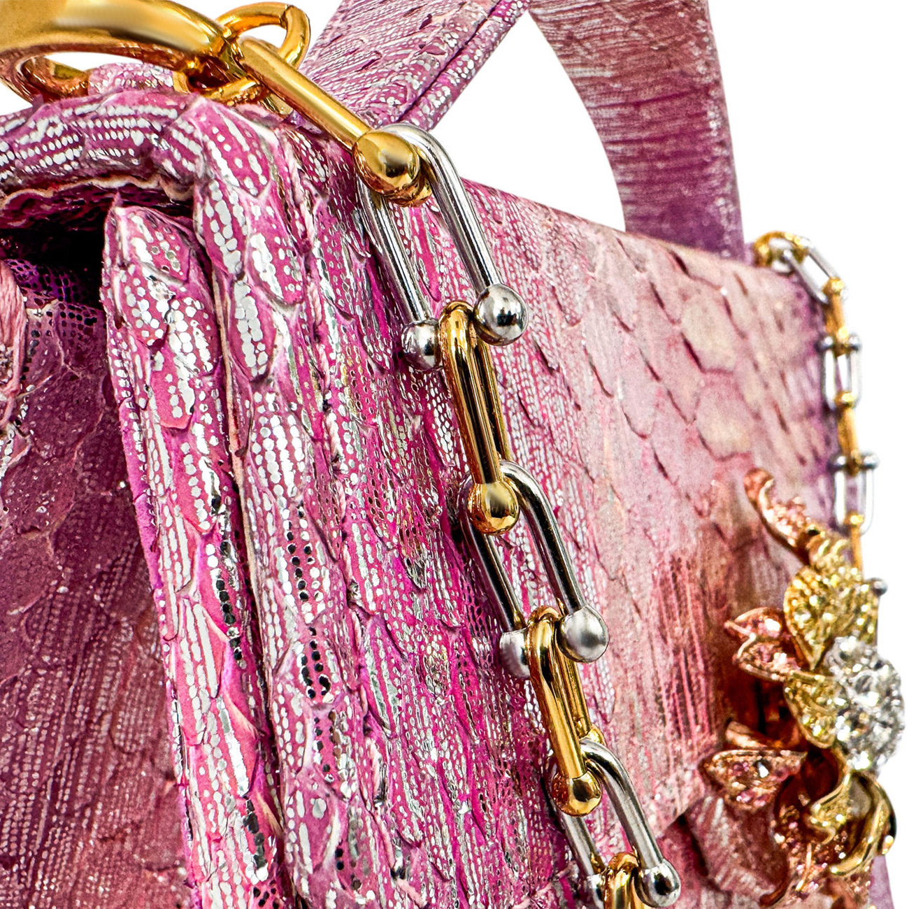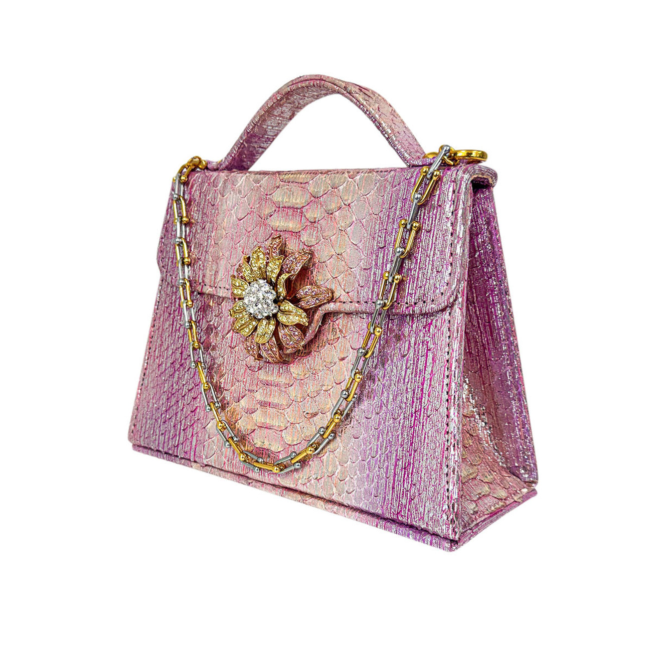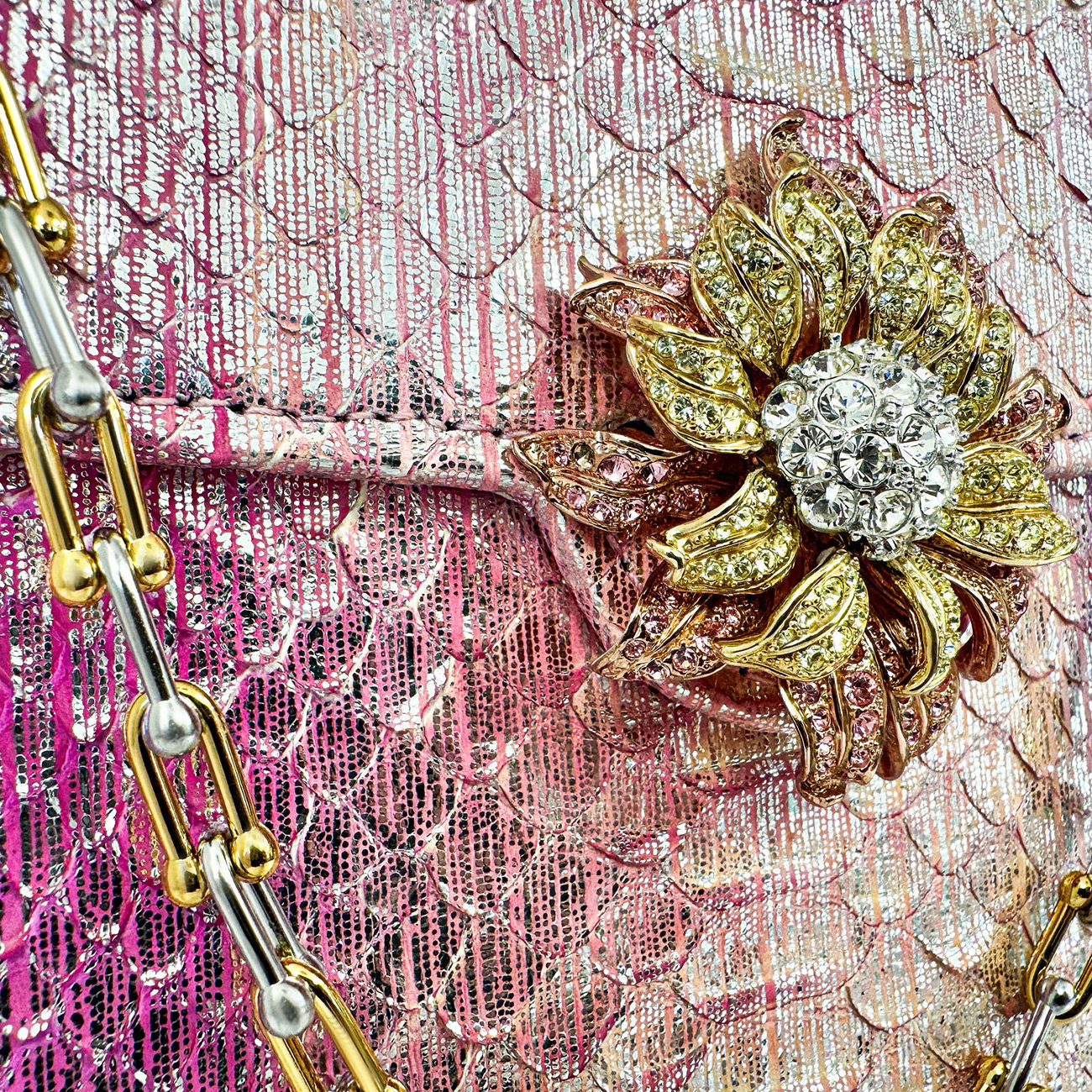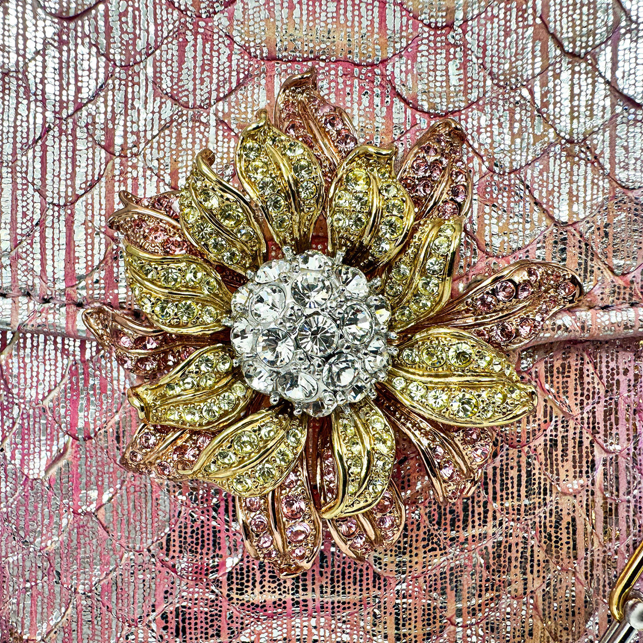 The Casey Très Petite Dahlia in Blush Prismatic Python is a jewel-like expression of couture craftsmanship, created from the most exquisite and rare python, expertly finished in Italy in a luminous blend of silver-pink and gold metallic tones. Elegant yet commanding, its petite scale is elevated by extraordinary detail.Adorning the silhouette is a vintage Nolan Miller floral crystal brooch, approximately 50 years old, with each crystal meticulously handset—an heirloom accent that transforms the piece into a true objet d’art. The design is finished with BSWANKY’s signature two-tone equestrian chain, combining 24-karat gold plating with polished stainless steel.The interior is luxuriously lined in both silver and gold metallic lambskin, completing a handbag designed not merely to be worn, but to be collected. One-of-a-kind