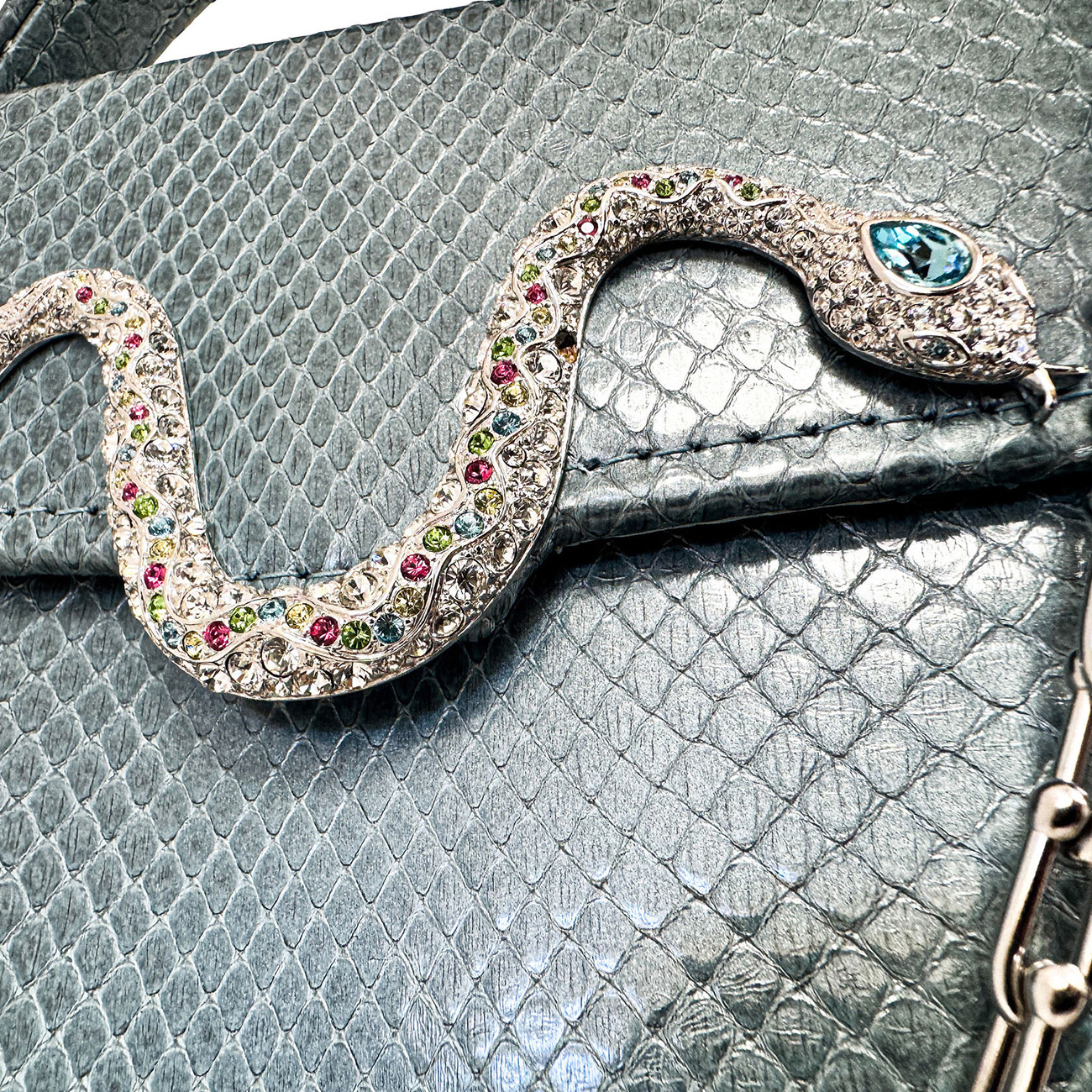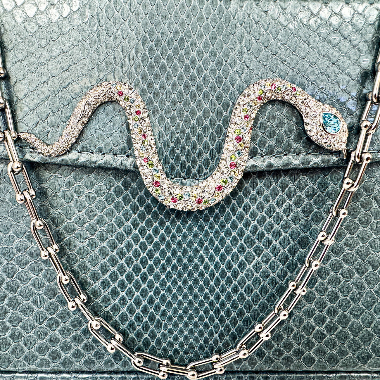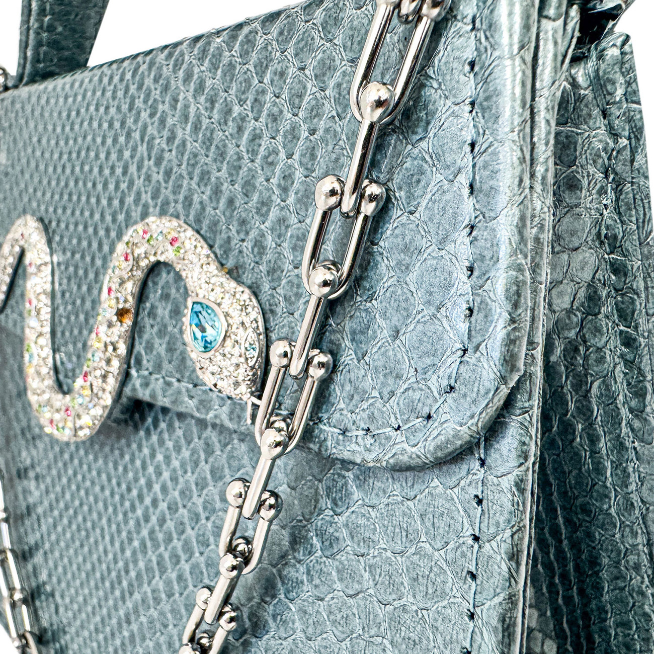 The handbag is finished with BSWANKY’s signature stainless steel equestrian chain, providing a modern counterpoint to the vintage artistry. A seamless fusion of heritage and contemporary craftsmanship, this Casey Très Petite Serpentine in Ocean Blue Python is designed not only to be worn—but to be treasured. One-of-a-kind