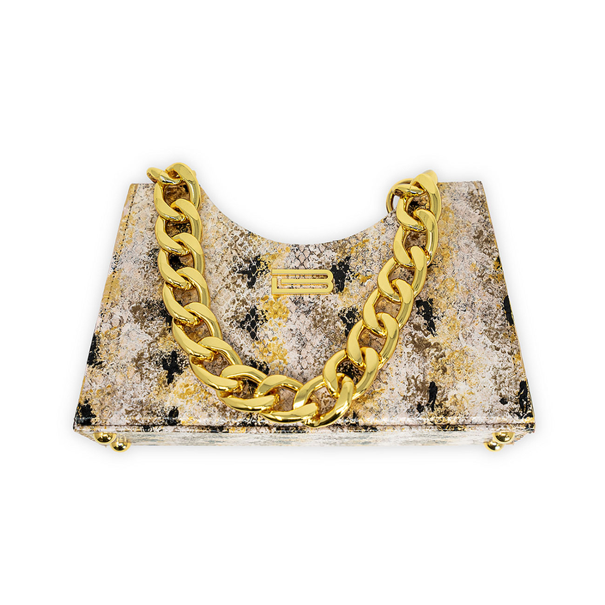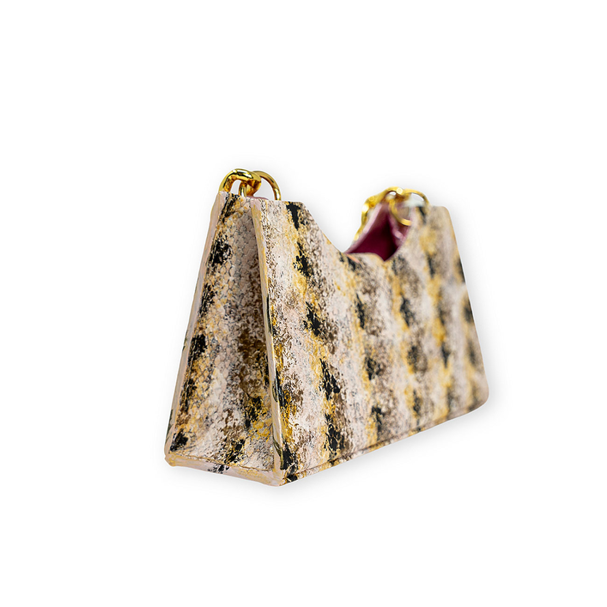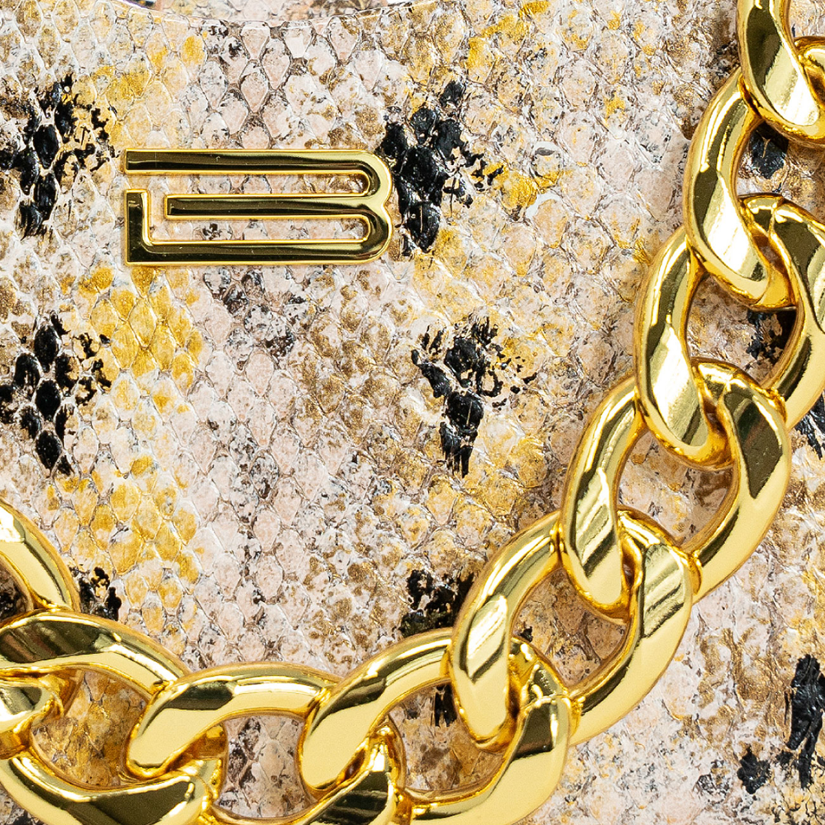 This is our perfect little must have silhouette, Named for the rare mineral rhodonite that bears her name, this unique masterpiece is meticulously hand wrapped in the rarest Italian hand painted blush python that features artfully placed golden and jet flecks that capture the light from every angle. Lined in the most supple Italian metallic blush lambskin. Replete with our own 24kt gold plated Cuban statement chain.