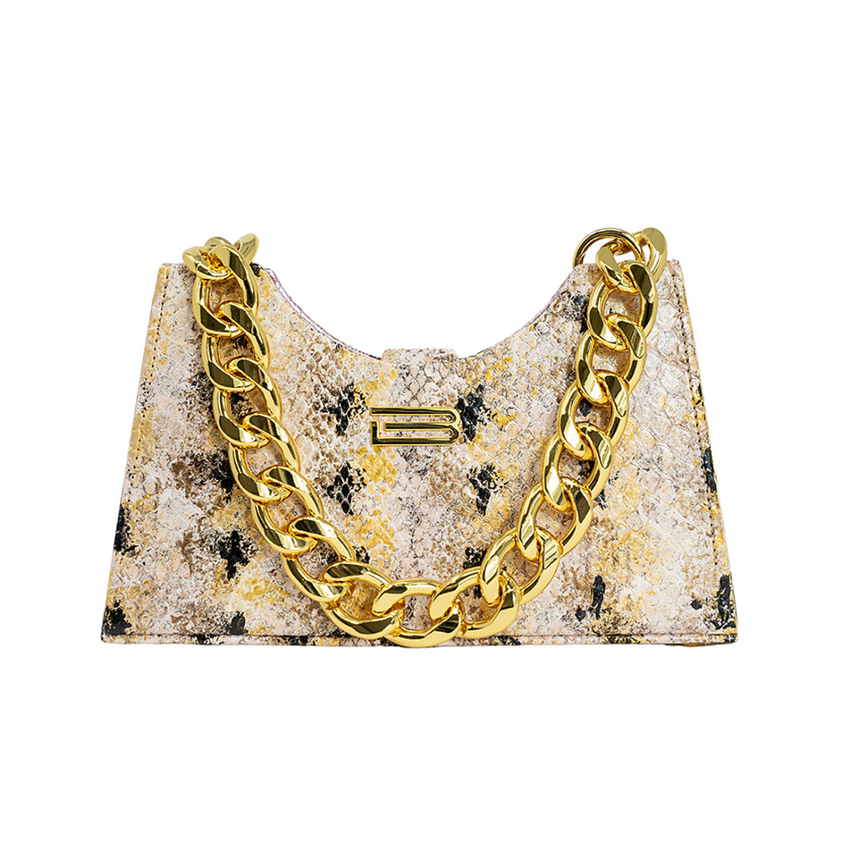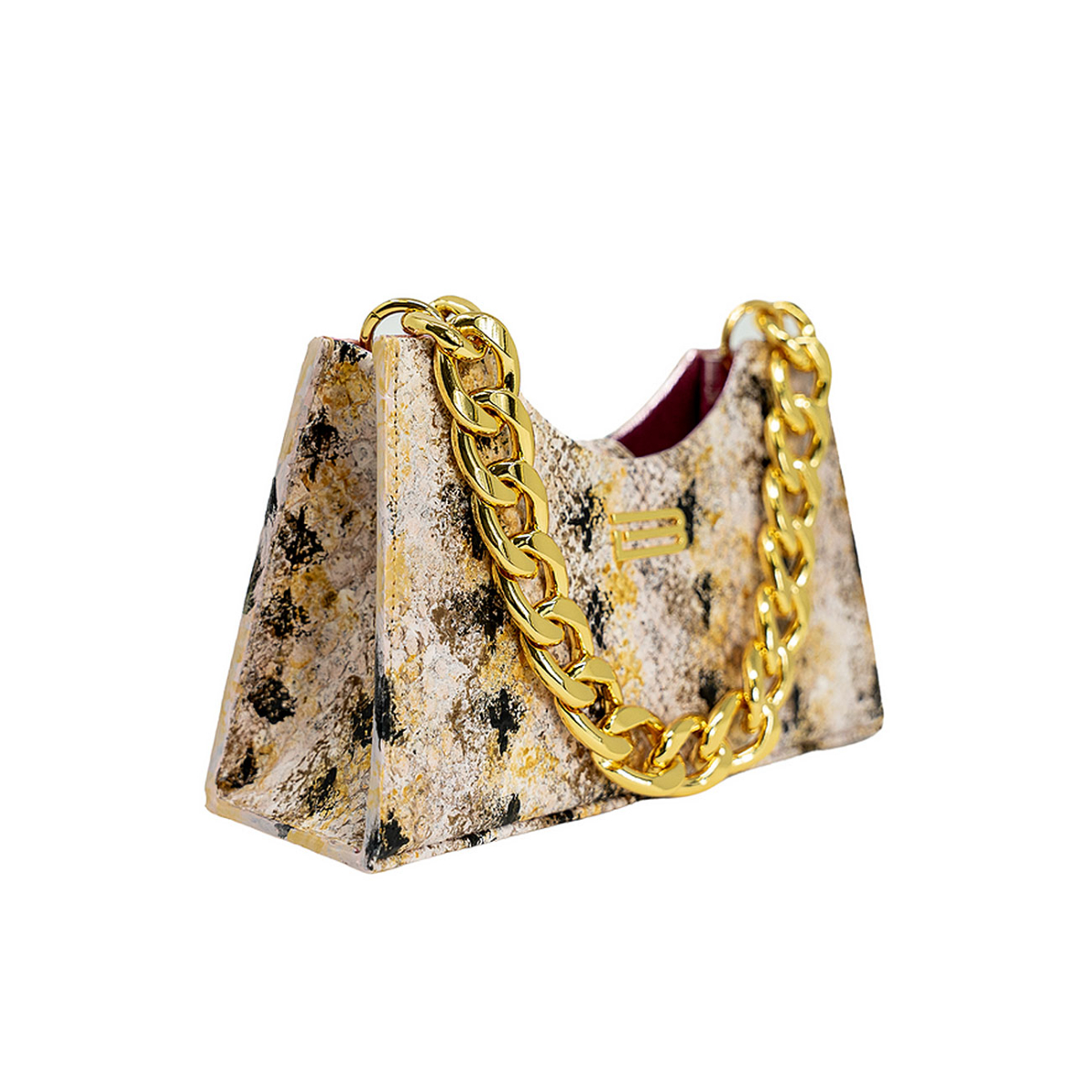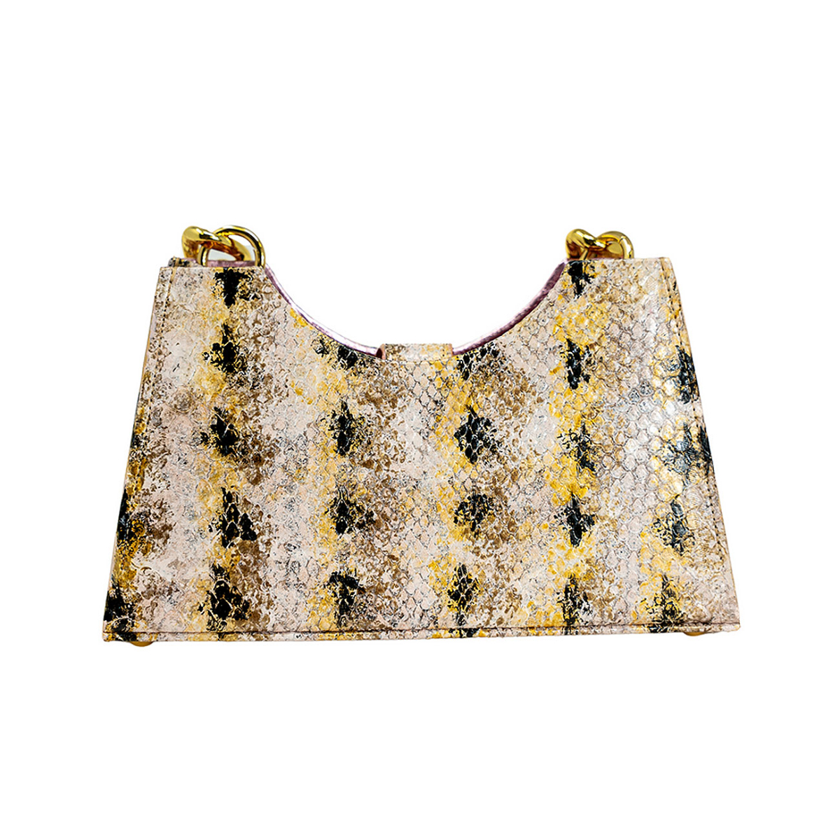 This is our perfect little must have silhouette, Named for the rare mineral rhodonite that bears her name, this unique masterpiece is meticulously hand wrapped in the rarest Italian hand painted blush python that features artfully placed golden and jet flecks that capture the light from every angle. Lined in the most supple Italian metallic blush lambskin. Replete with our own 24kt gold plated Cuban statement chain.