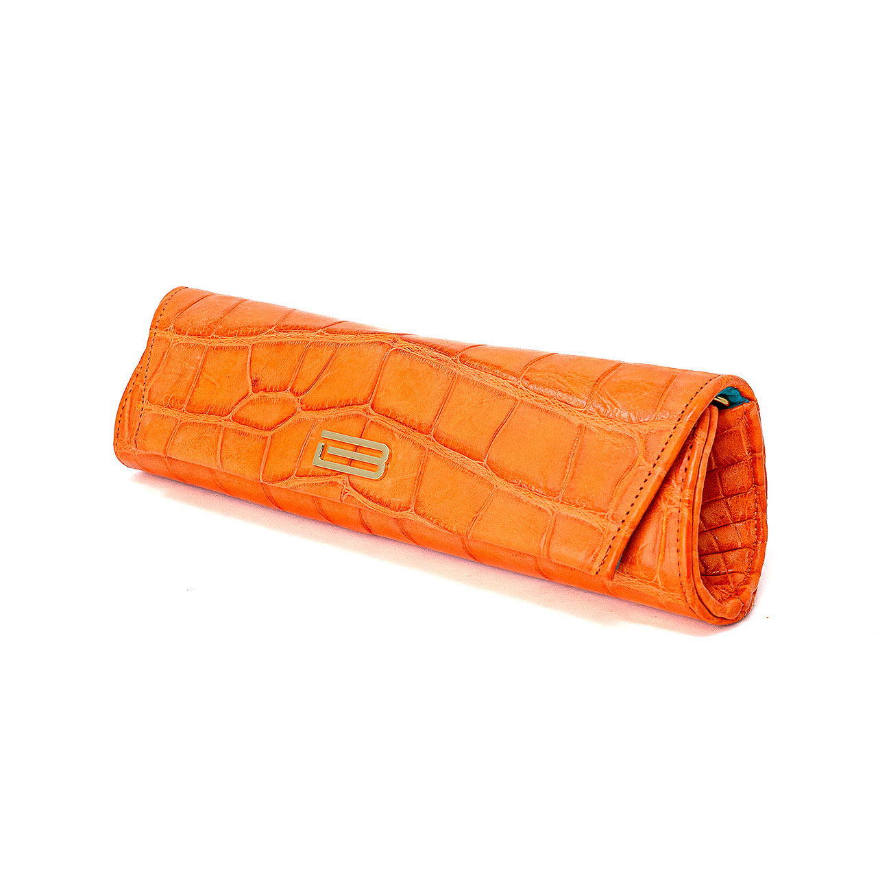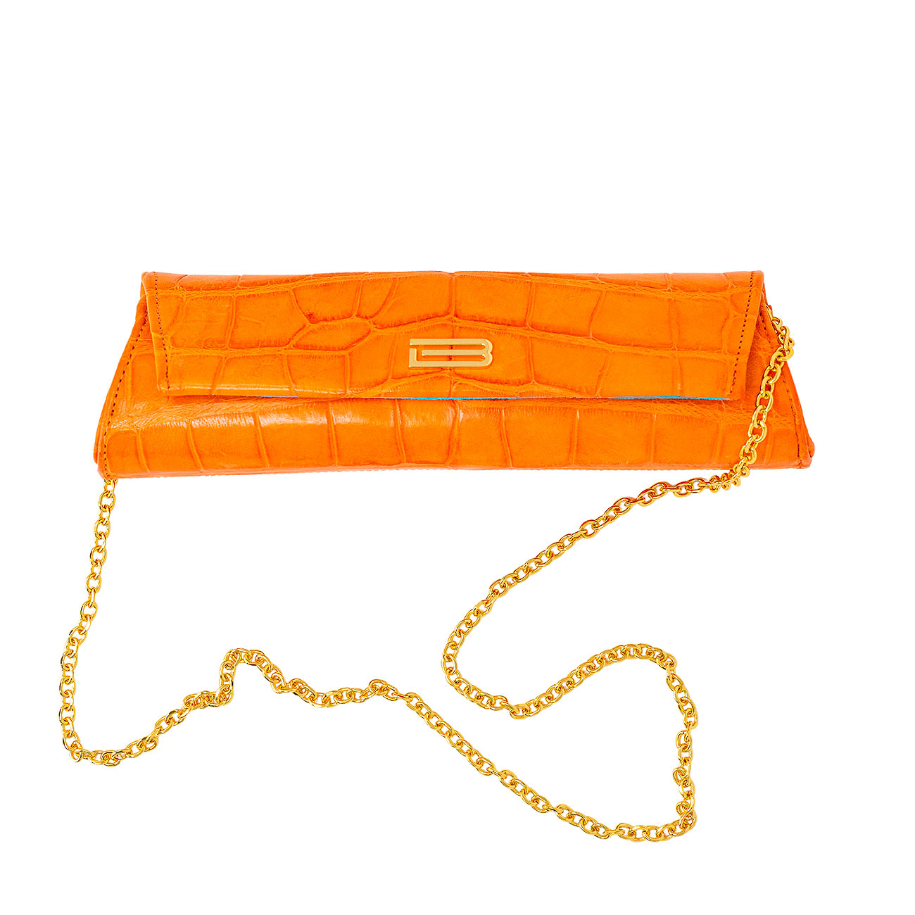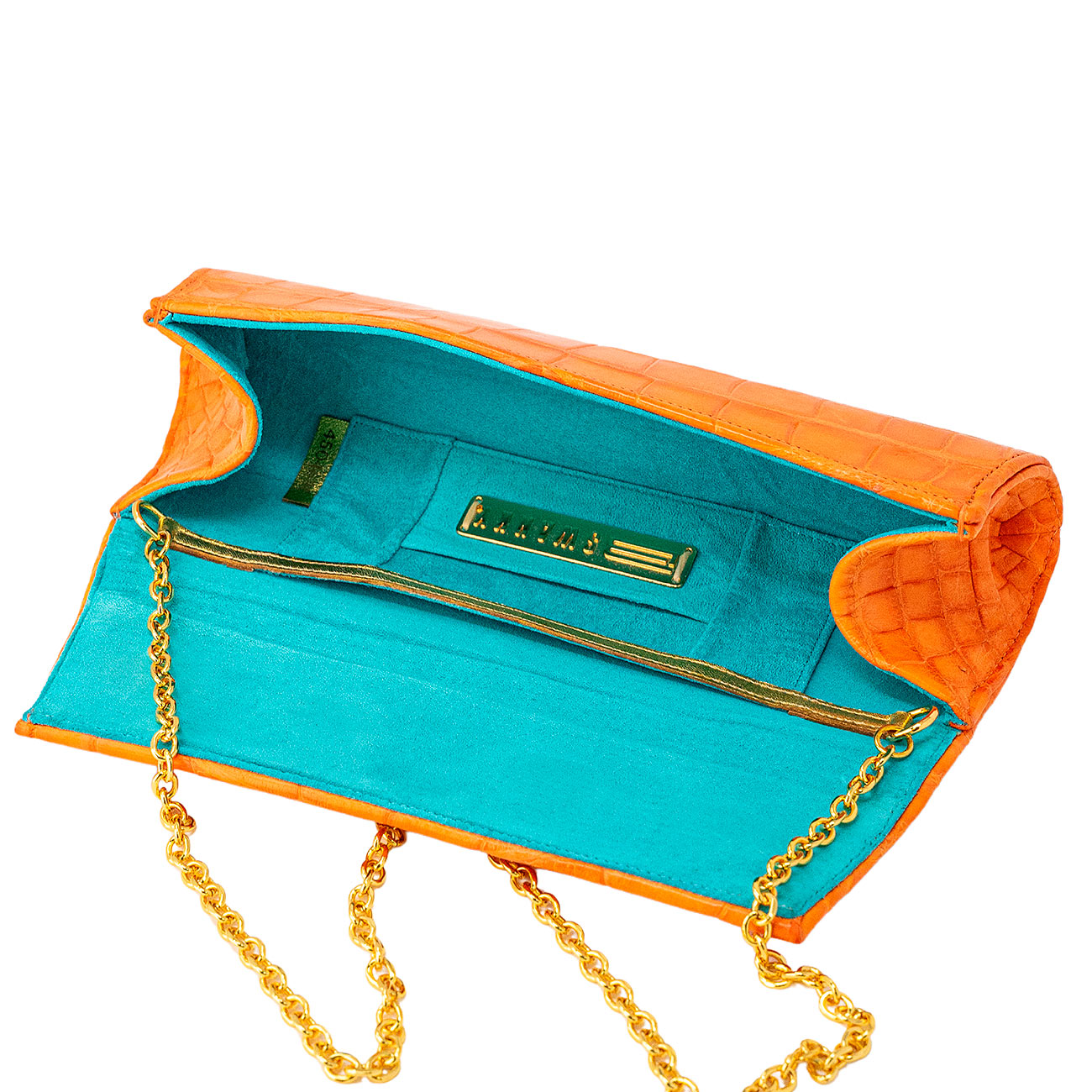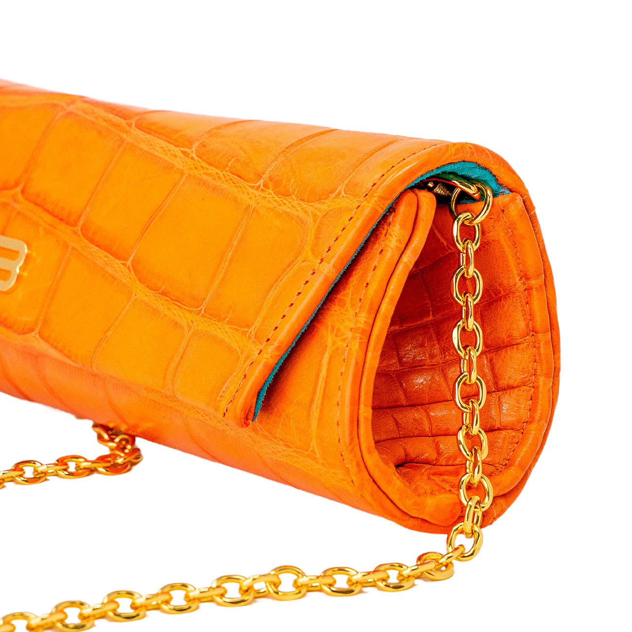 Elevate your collection with our exclusive orange alligator baguette clutch, beautifully lined with Italian turquoise suede. Experience the elegance of ethically sourced genuine Florida Alligator. Explore the allure of the coveted alligator belly scales, where functionality meets aesthetic appeal. These scales are not only vital for protection but also showcase the stunning artistry found in the animal kingdom. Each item is crafted with care, honoring both the environment and the artistry of nature. Inspired by the Lamborghini Urus, this clutch embodies the perfect blend of luxury and innovation. Stand out with this exceptional accessory.Replete with long pocket suitable for currency, small credit card/id pocket and faceted crossbody chain in 24k gold plated. One-of-a-kind