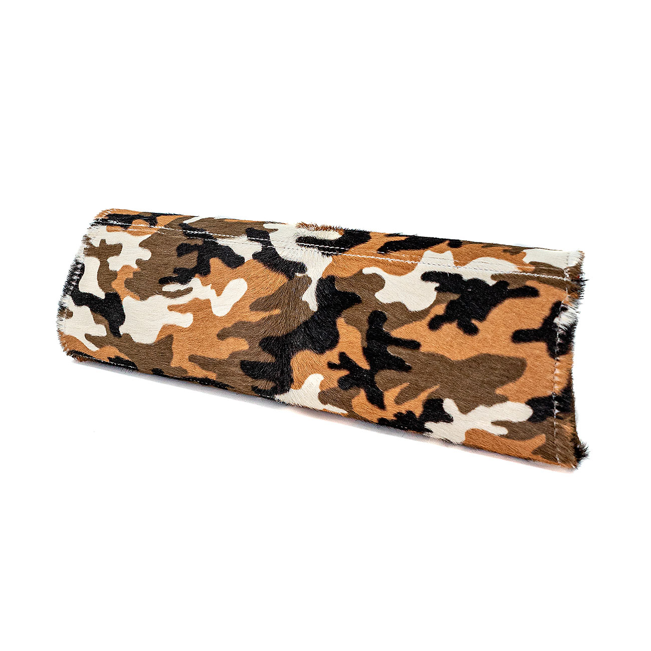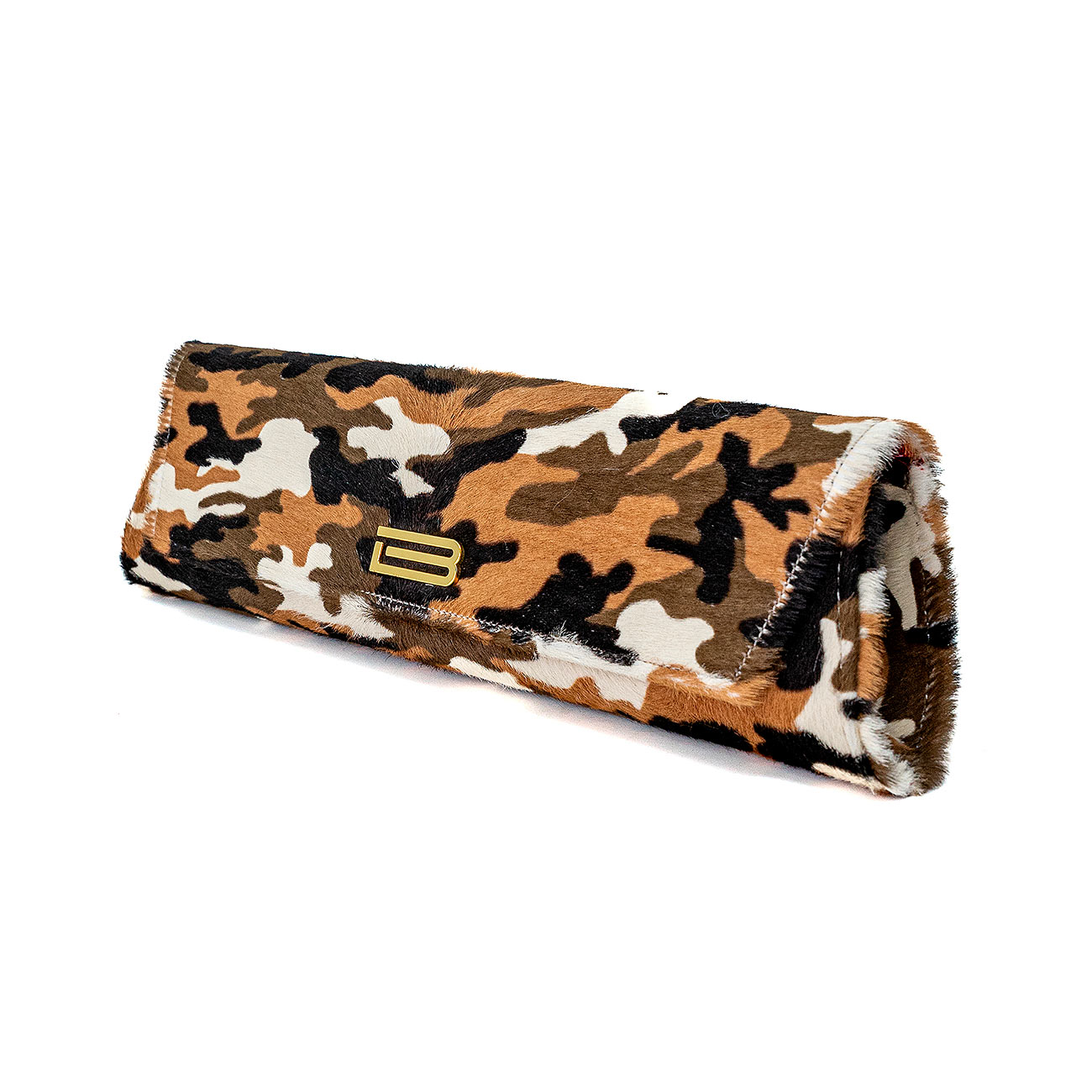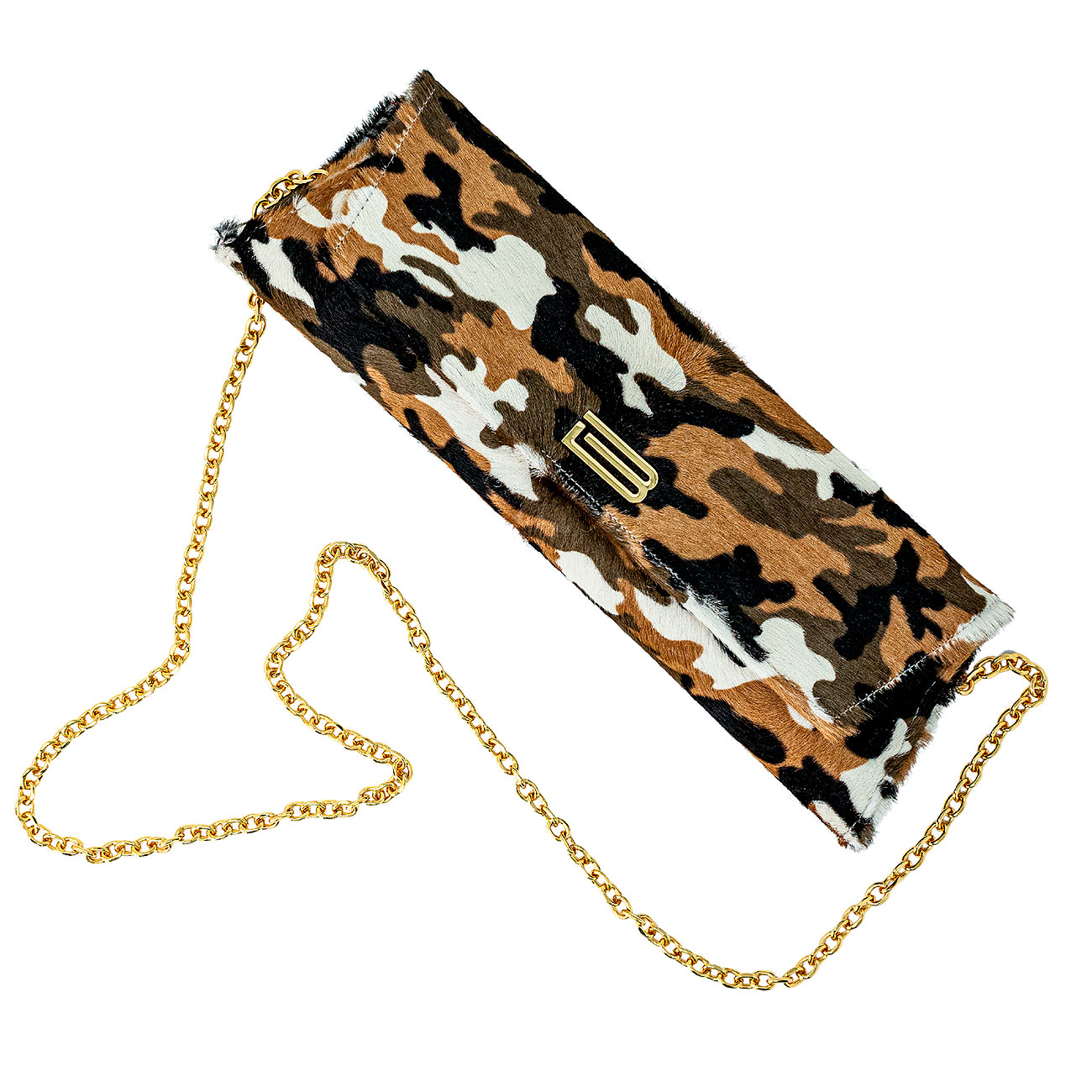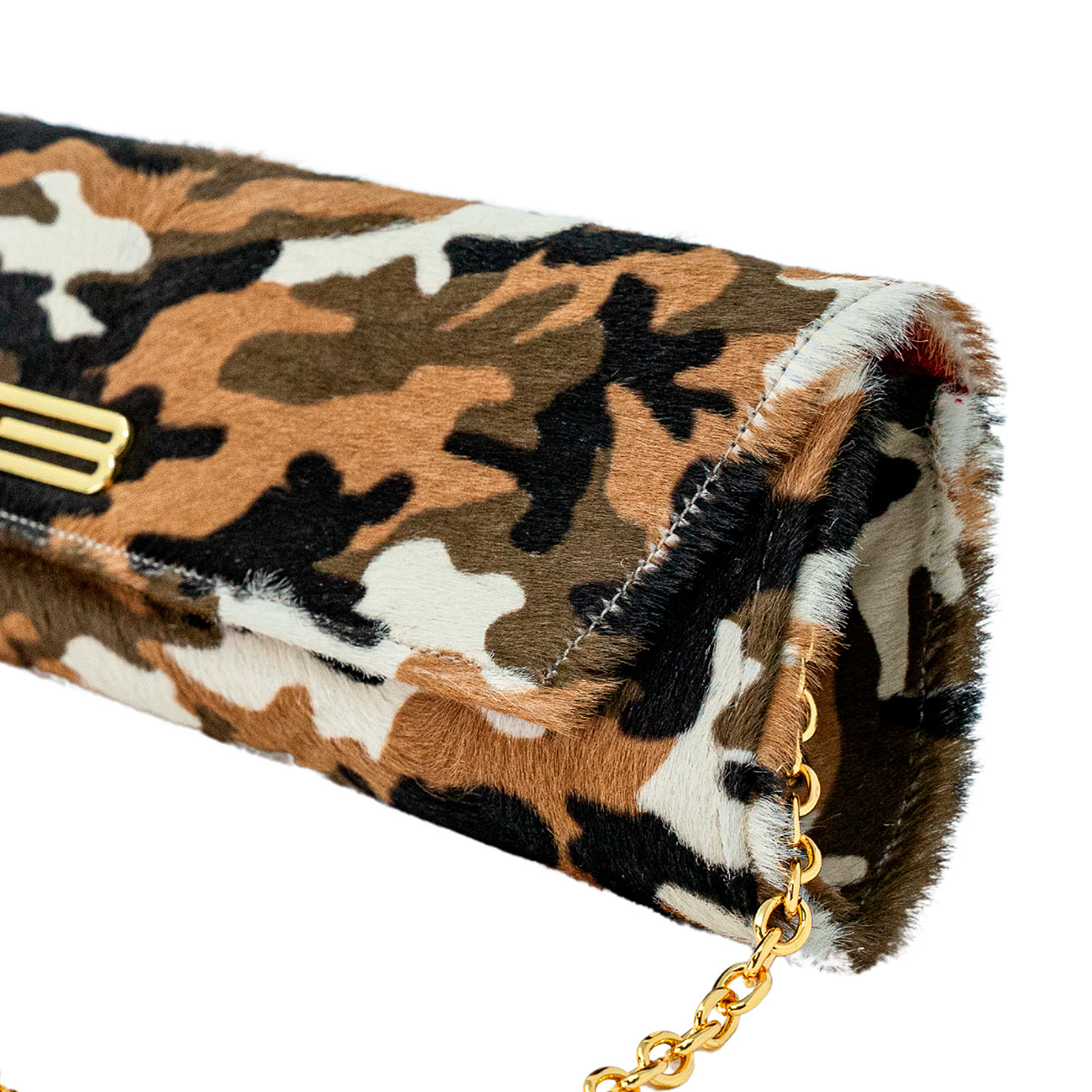 The ultimate neutral camouflage print brings the adventurous element to your wardrobe with our newest Wisteria clutch. Beige, olive and cream accent this beautiful hair-on calfskin boldly lined with a contrasting deep red Italian lambskin suede. Replete with long pocket suitable for currency, small credit card/id pocket and faceted crossbody chain in 24k gold plated.