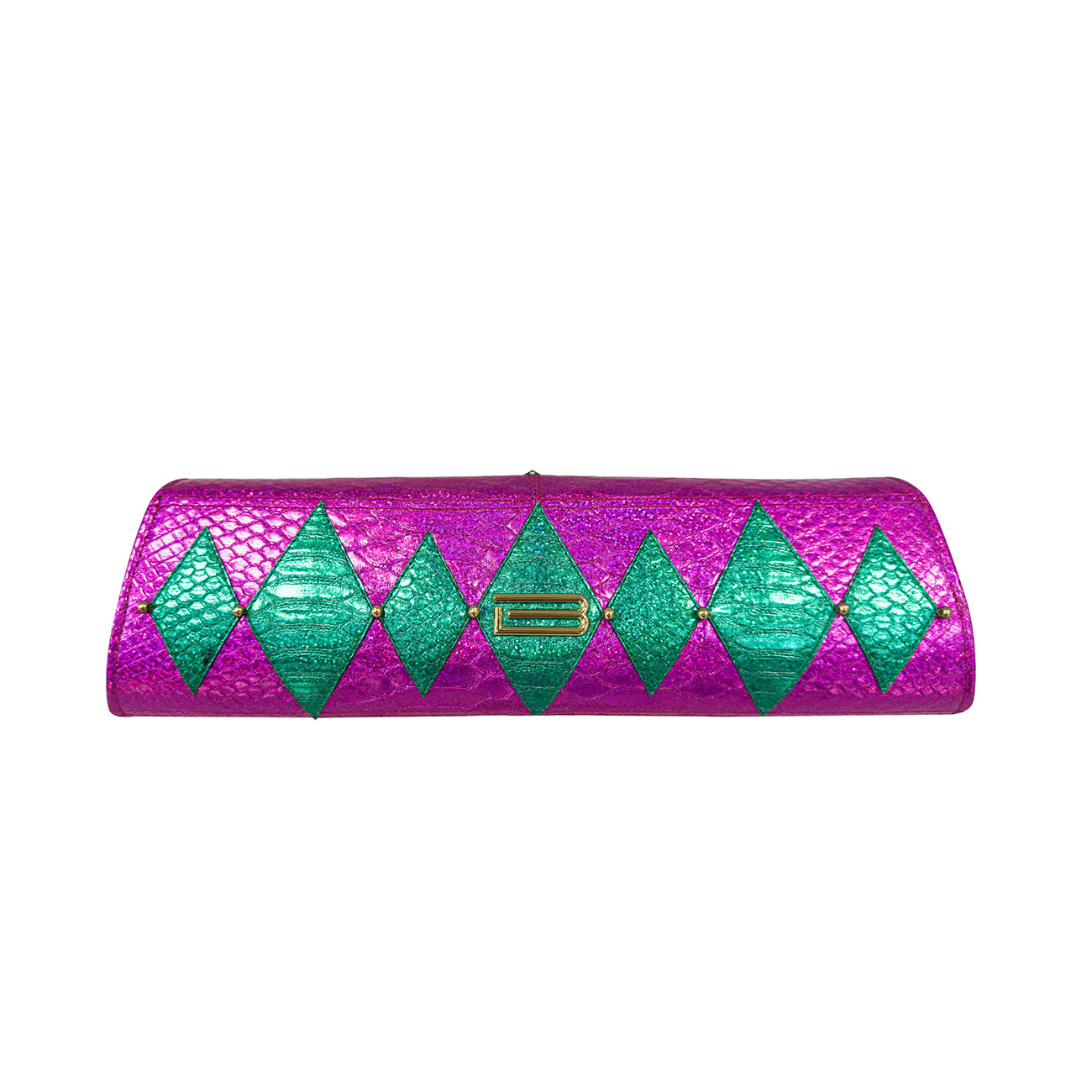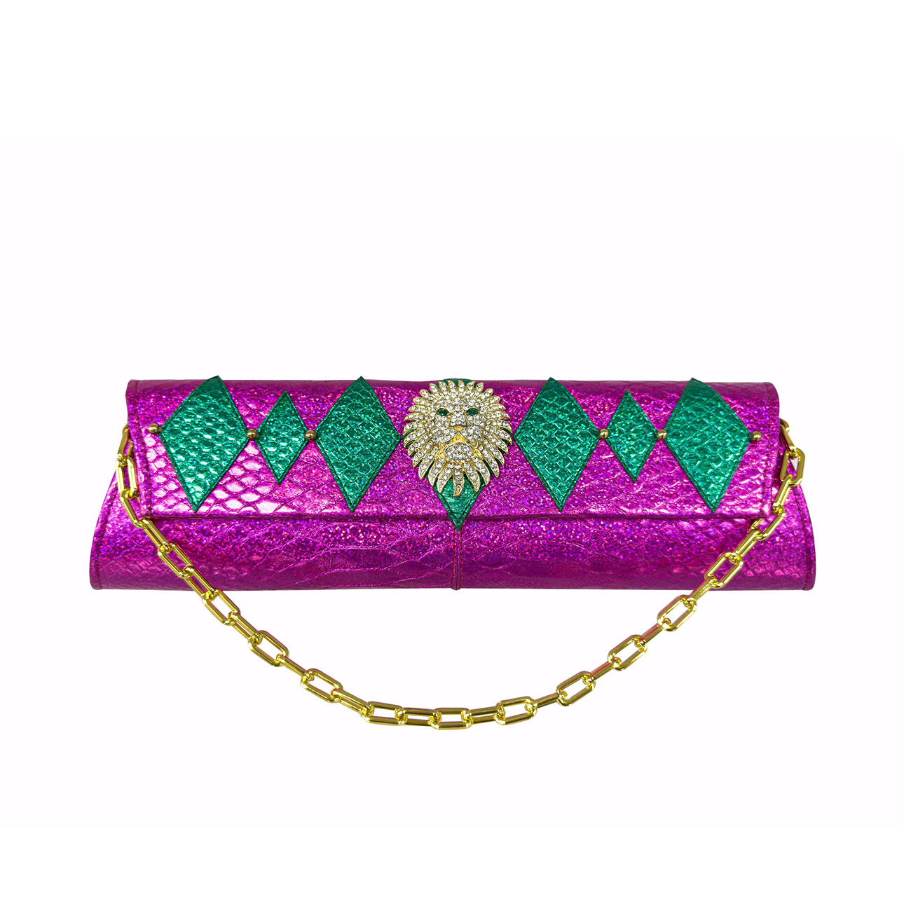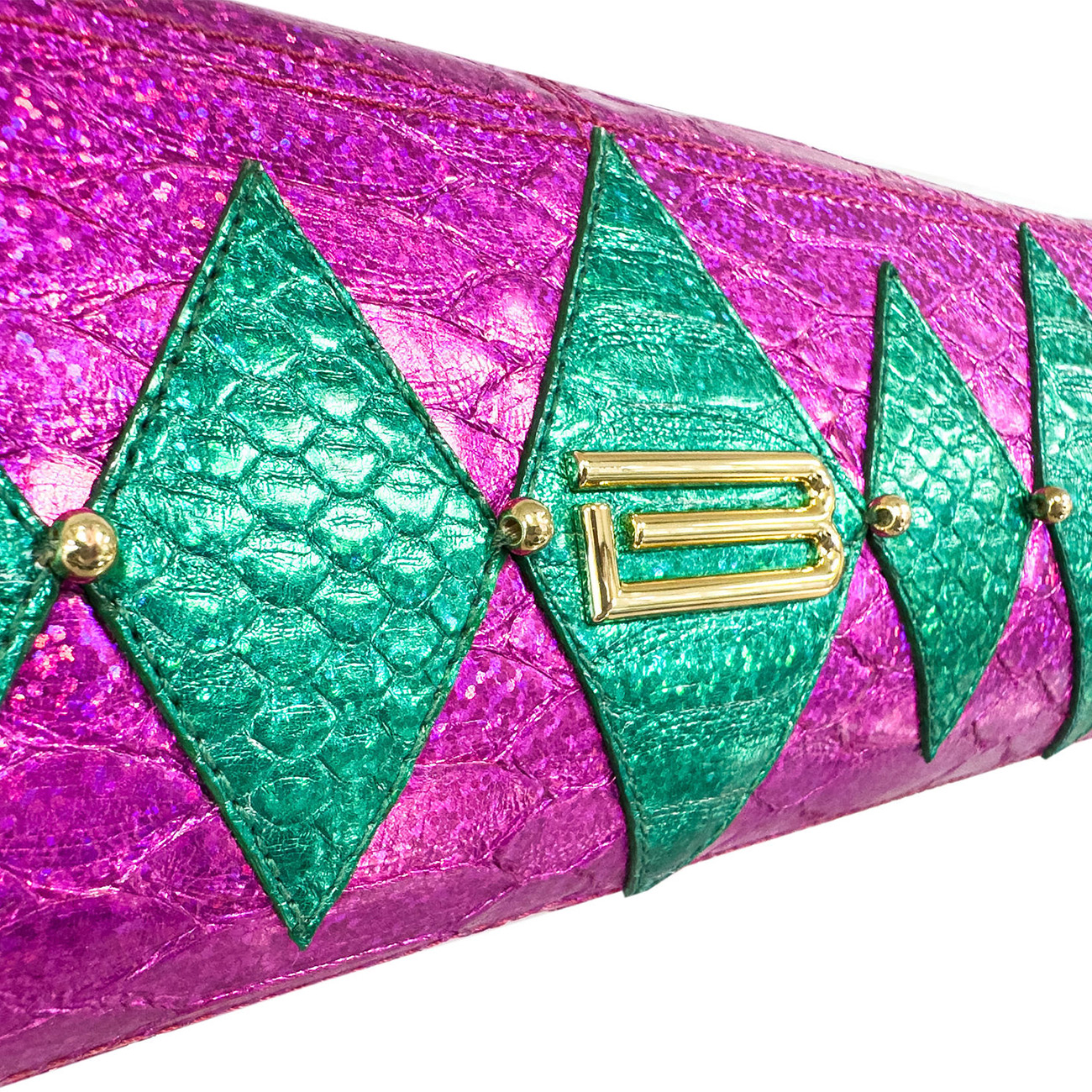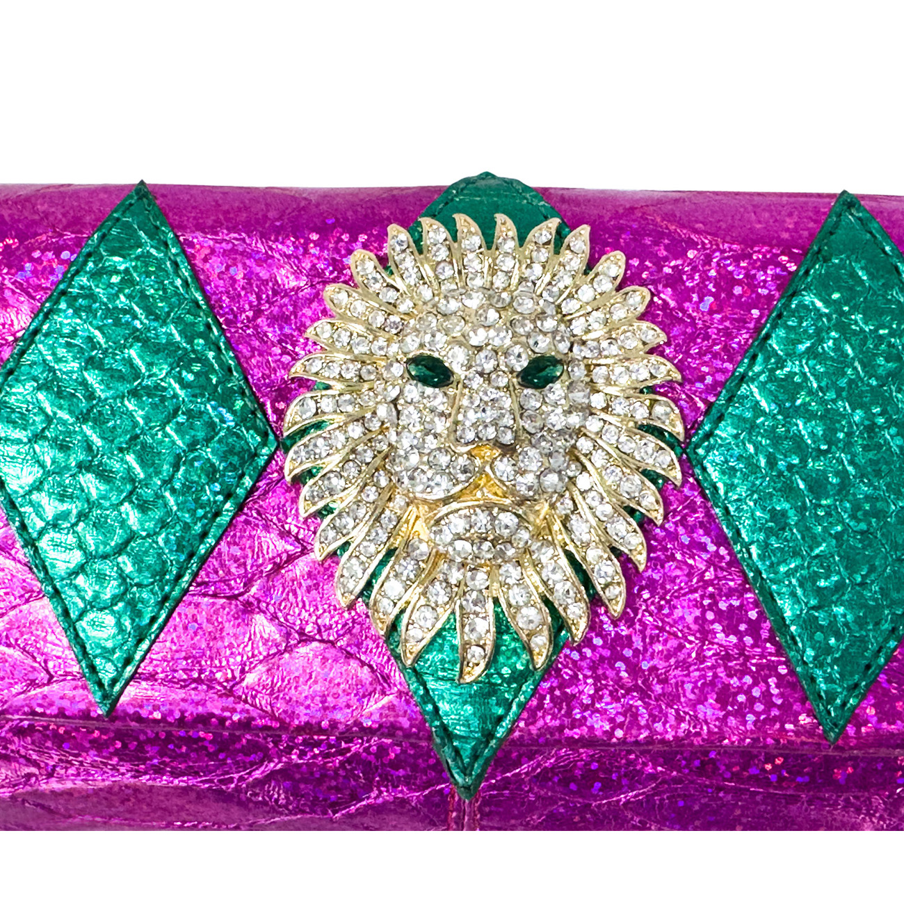 The BSWANKY Grande Carnivàle Wisteria Clutch is a fearless celebration of color, craftsmanship, and vintage artistry. Handcrafted from prismatic python foiled in France, the skin shimmers in vivid shades of green and pink and is meticulously hand-cut into a Harlequin pattern, creating a kaleidoscopic effect that shifts beautifully with the light.At its center is an exceptionally rare vintage lion head brooch, signed JB and dating to circa 1960.
