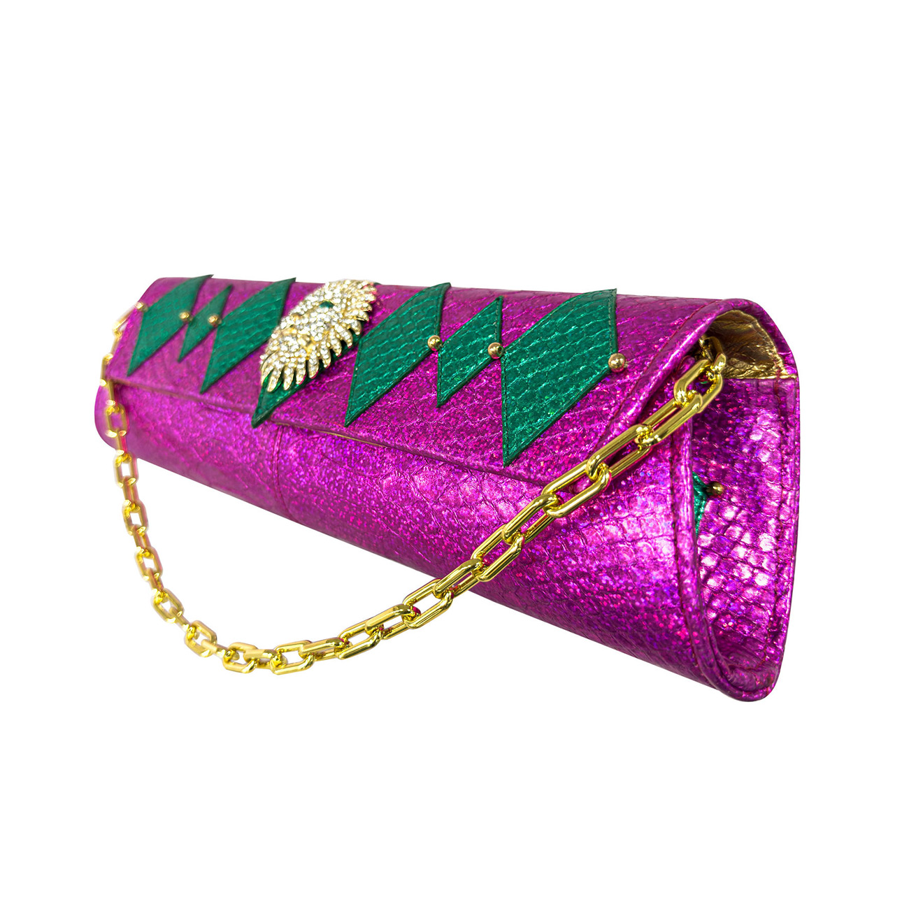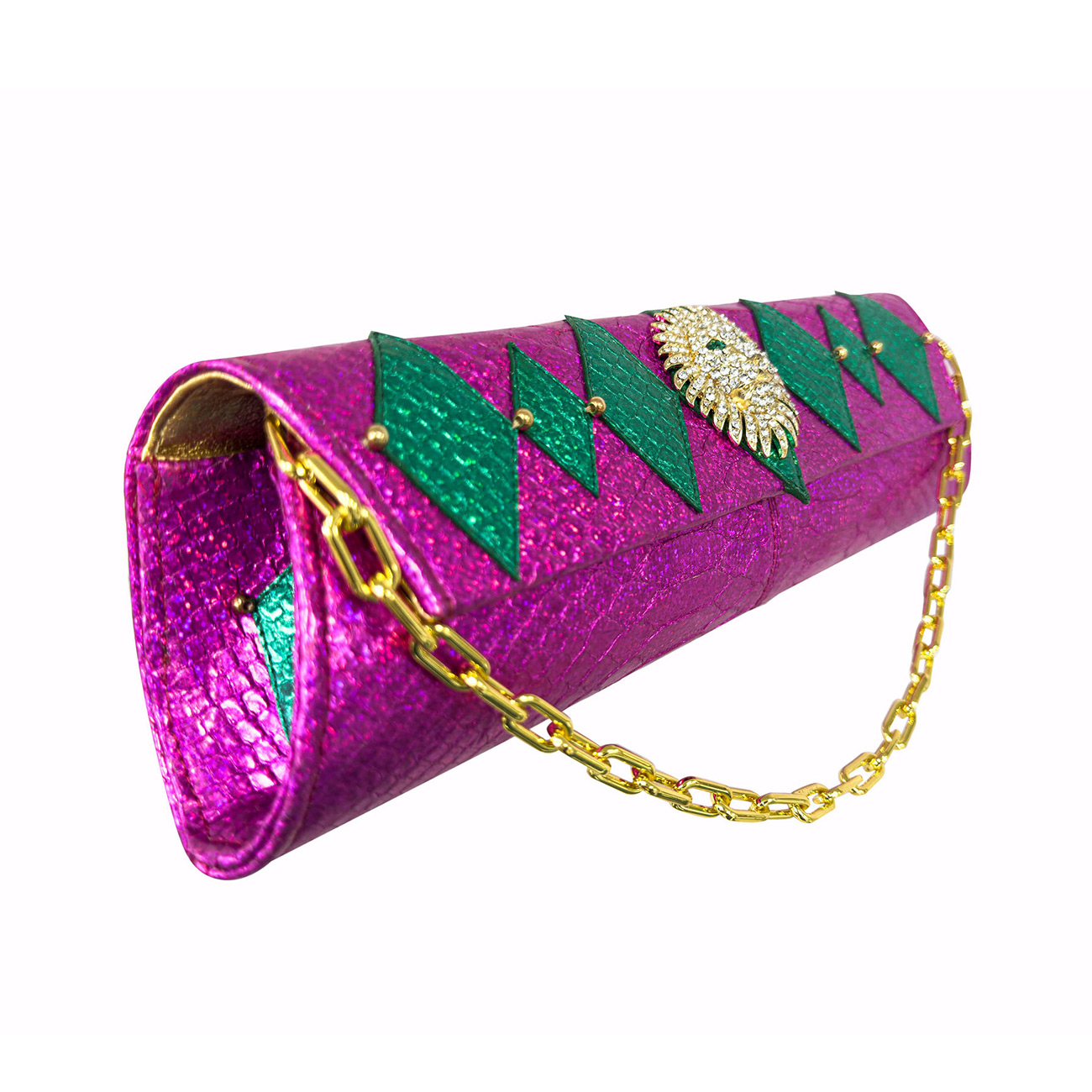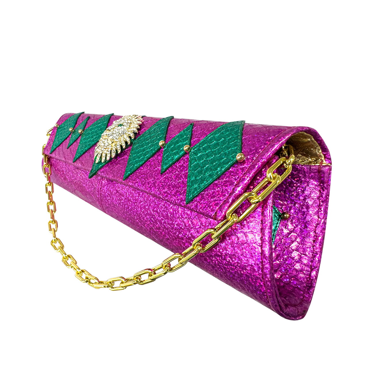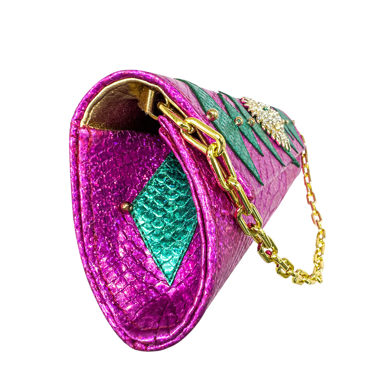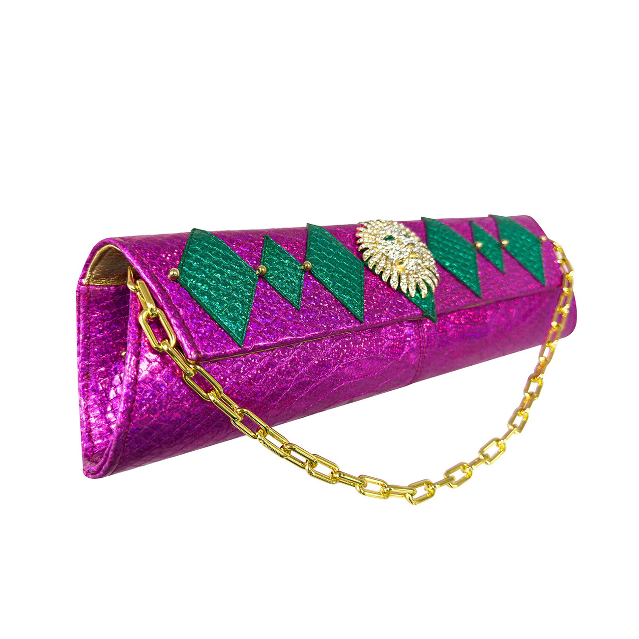 The BSWANKY Grande Carnivàle Wisteria Clutch is a fearless celebration of color, craftsmanship, and vintage artistry. Handcrafted from prismatic python foiled in France, the skin shimmers in vivid shades of green and pink and is meticulously hand-cut into a Harlequin pattern, creating a kaleidoscopic effect that shifts beautifully with the light.At its center is an exceptionally rare vintage lion head brooch, signed JB and dating to circa 1960.
