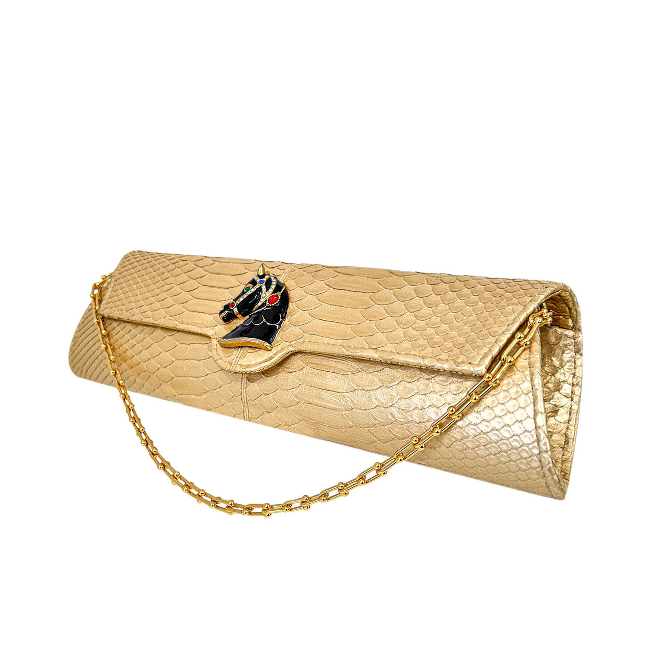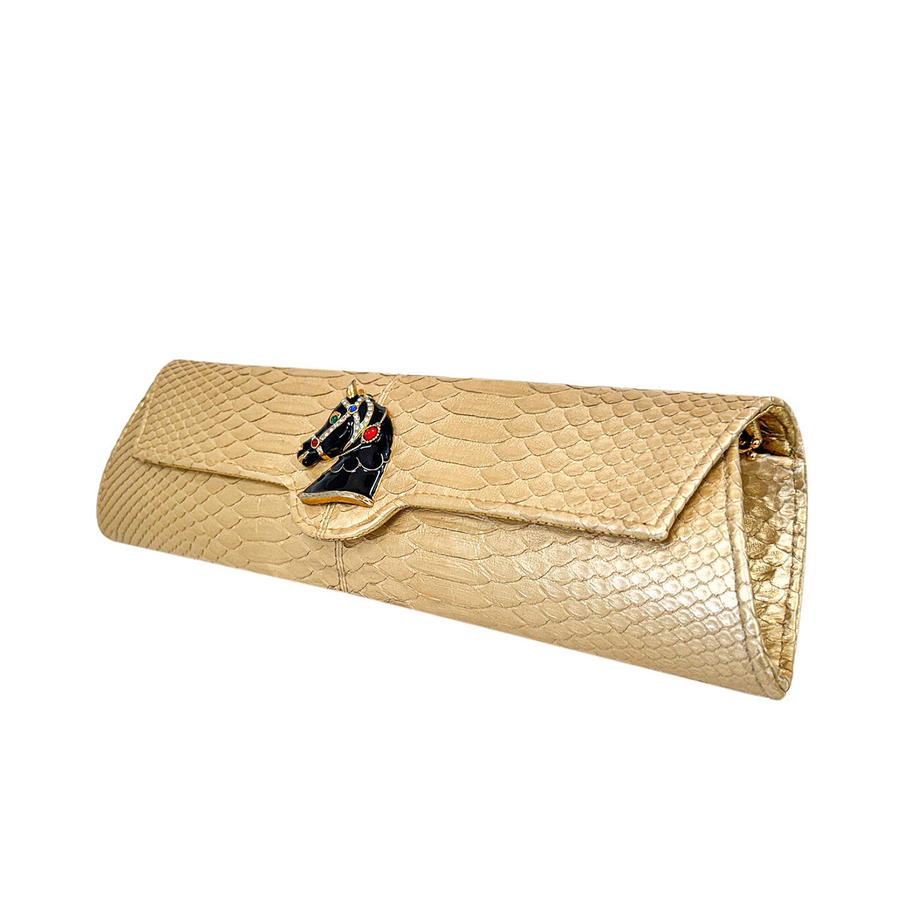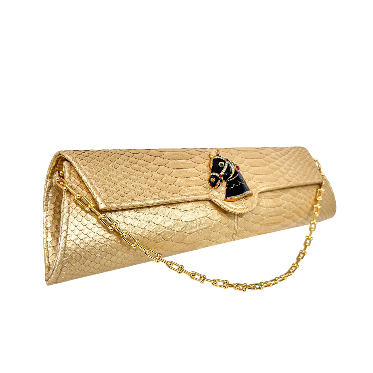 The brooch’s sculpted contours echo the refined geometry of fine tack, pairing beautifully with the python’s molten gold patina. Enhancing this artistry, the clutch is embellished with a 24-karat gold-plated equestrian chain, reminiscent of gilded stirrup hardware and the polished metalwork of elite show jumping arenas. Together, these elements create an interplay of brilliance and heritage-a fusion where couture craftsmanship meets the timeless pageantry of the arena.