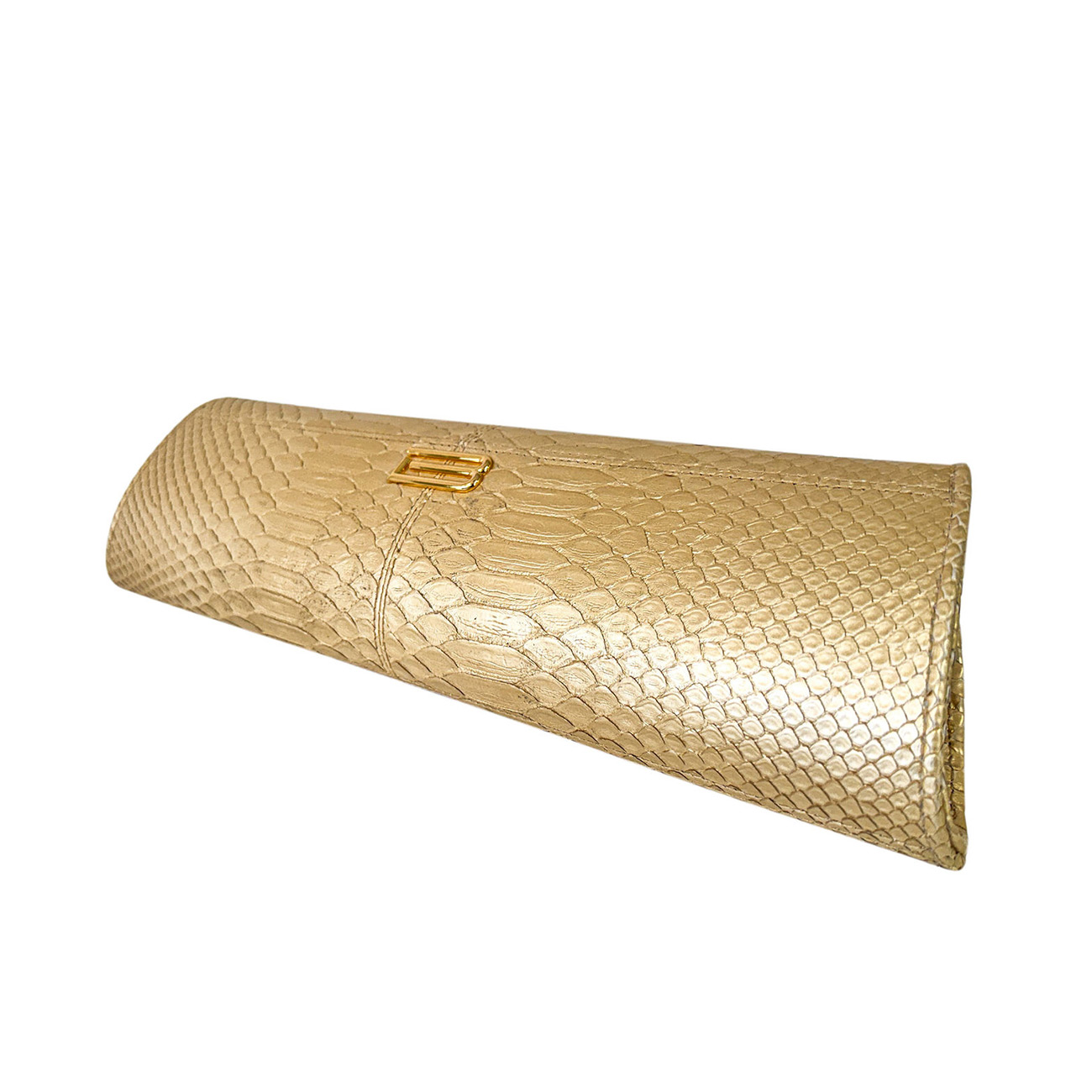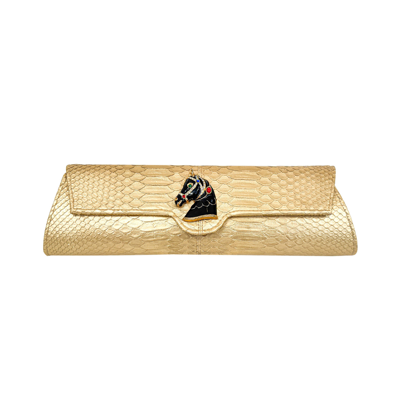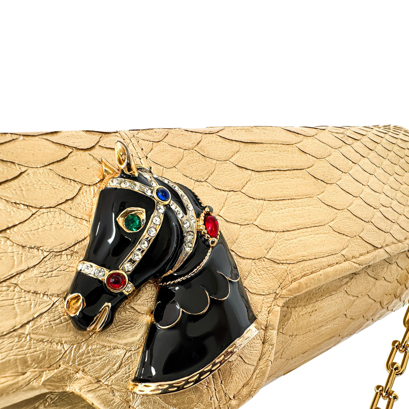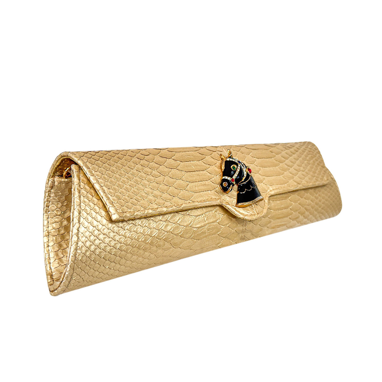 The brooch’s sculpted contours echo the refined geometry of fine tack, pairing beautifully with the python’s molten gold patina. Enhancing this artistry, the clutch is embellished with a 24-karat gold-plated equestrian chain, reminiscent of gilded stirrup hardware and the polished metalwork of elite show jumping arenas. Together, these elements create an interplay of brilliance and heritage-a fusion where couture craftsmanship meets the timeless pageantry of the arena.