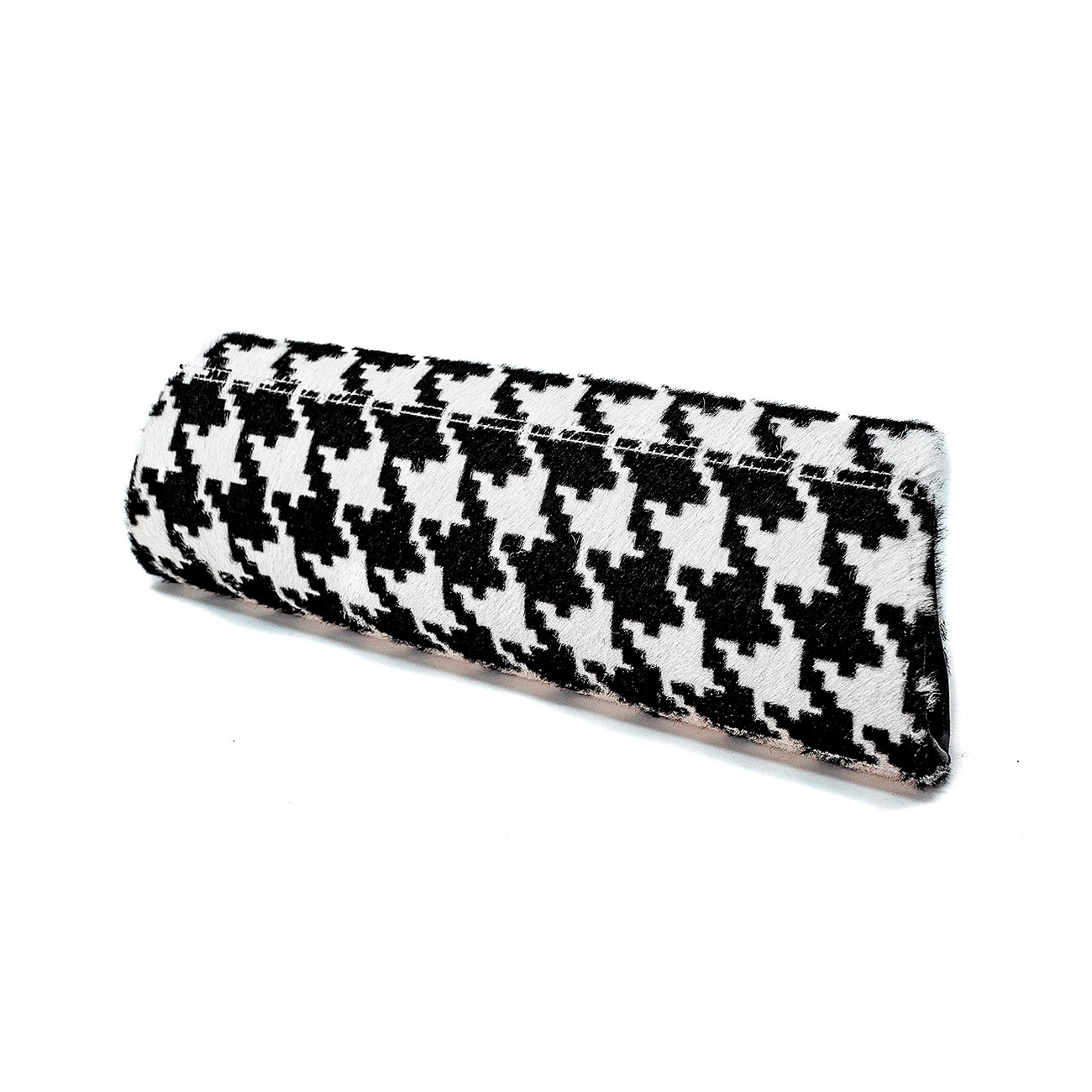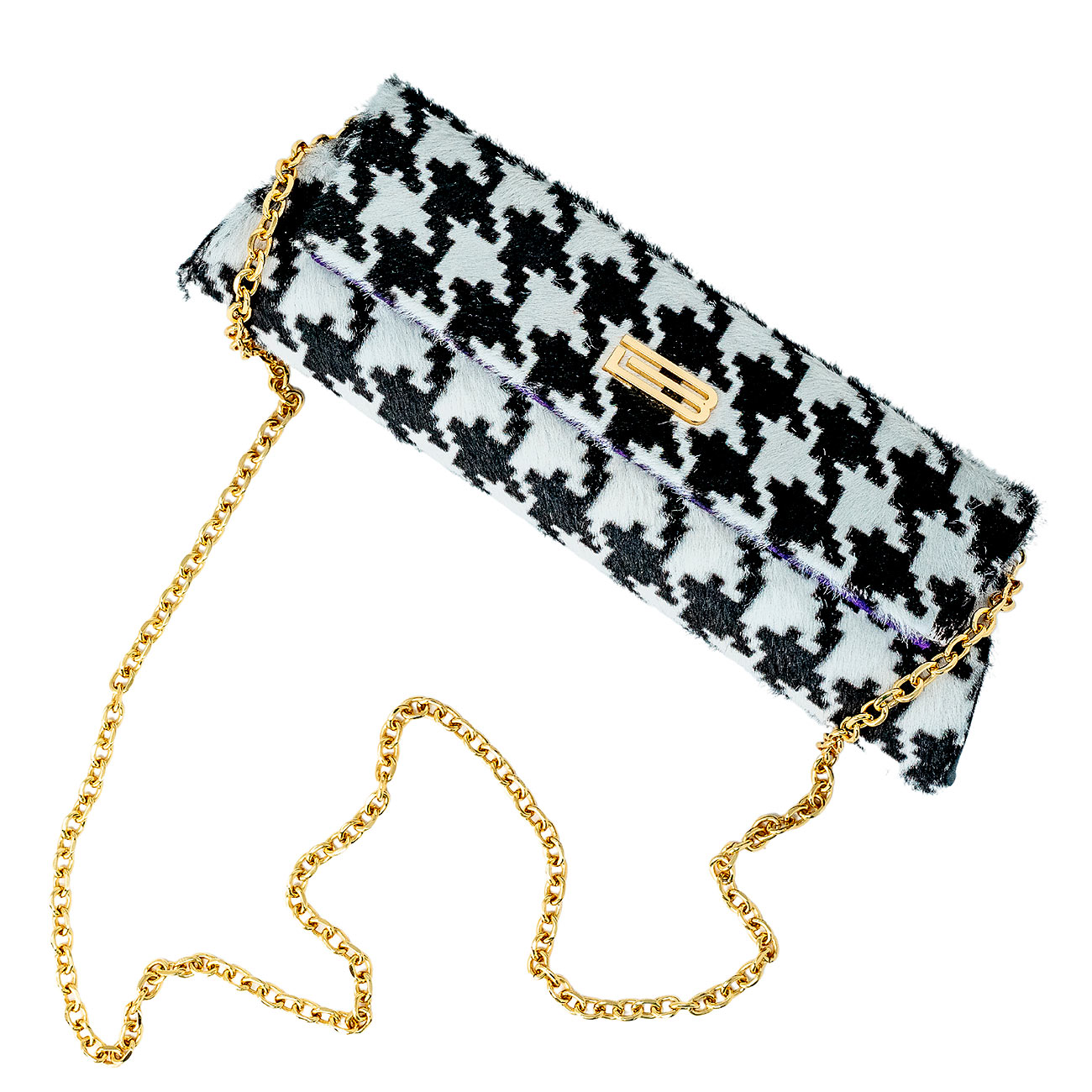 When traditional becomes modern, our black and white houndstooth hair-on calfskin Wisteria clutch is all that. Flanked in sleek jet Italian lambskin and lined in a supple regal purple Italian lambskin suede. Replete with long pocket suitable for currency, small credit card/id pocket and faceted crossbody chain in 24k gold plated.