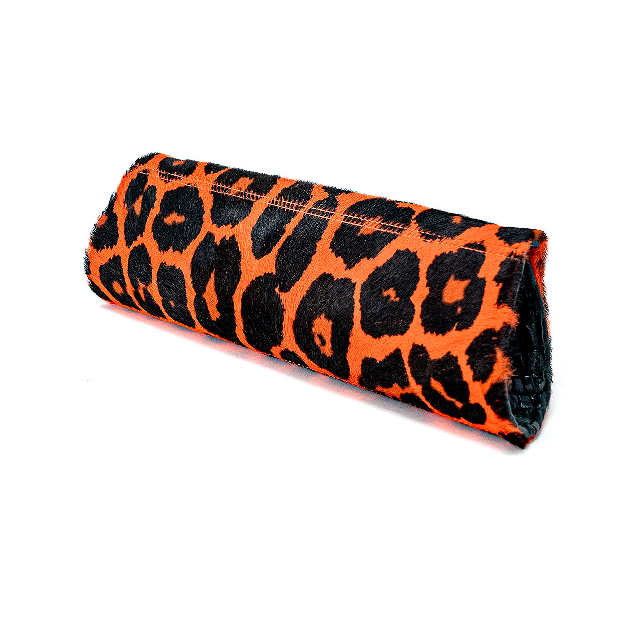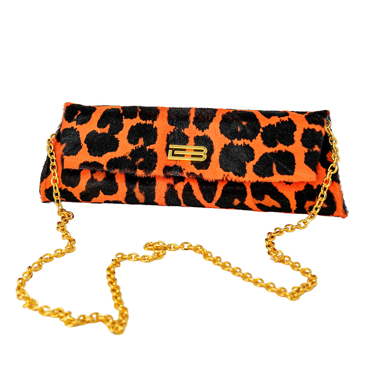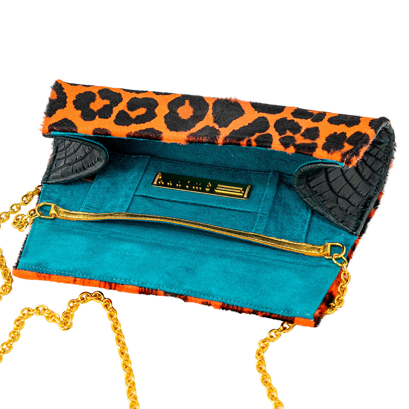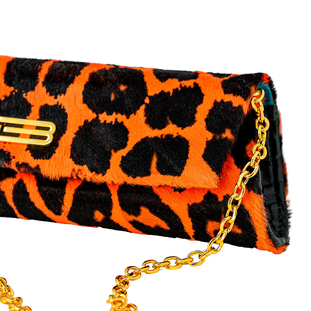 Discover the allure of luxury with our one-of-a-kind exotic orange and black hair-on calfskin leopard baguette clutch. Featuring exquisite jet Florida alligator adorning the sides this luxurious detail elevates any ensemble. Lined with sumptuous black Italian suede, this piece is inspired by the bold design of the Lamborghini Urus. Elevate your style with a touch of elegance. Replete with long pocket suitable for currency, small credit card/id pocket and faceted crossbody chain in 24k gold plated.