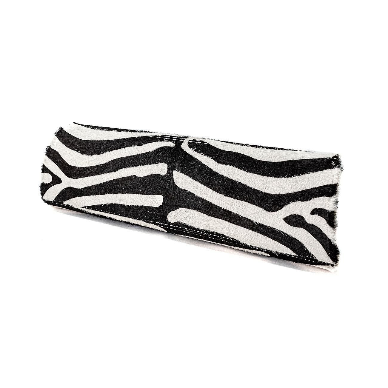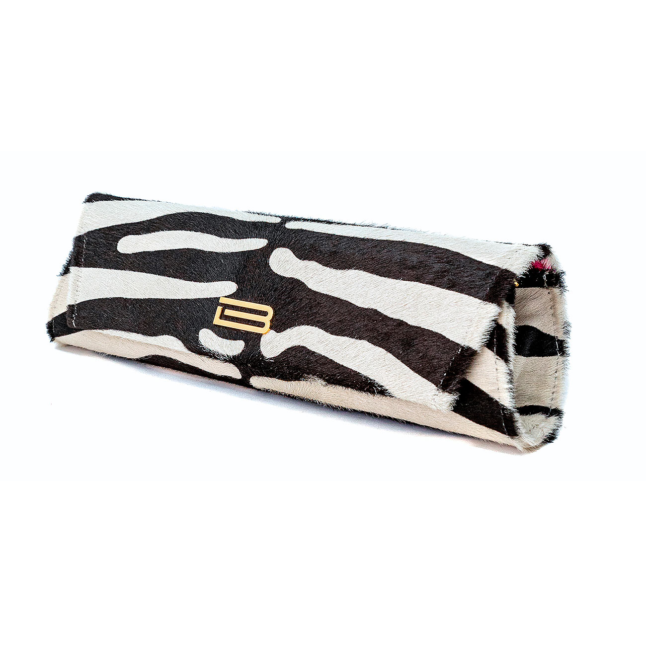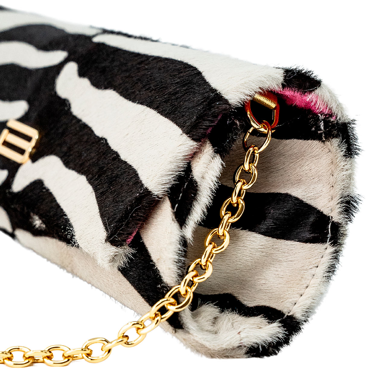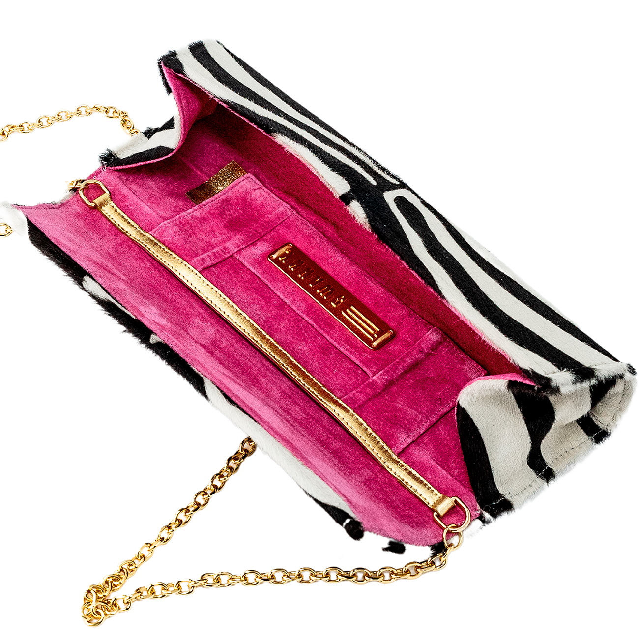 This playful bold safari rendition of our baguette clutch is a must have for any trendsetter's wardrobe. Crafted from the most luxurious hair-on calfskin zebra print and lined in pink Italian lambskin suede. Replete with long pocket suitable for currency, small credit card/id pocket and faceted crossbody chain in 24k gold plated.