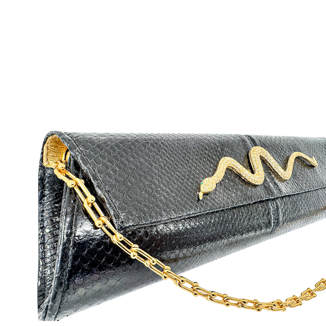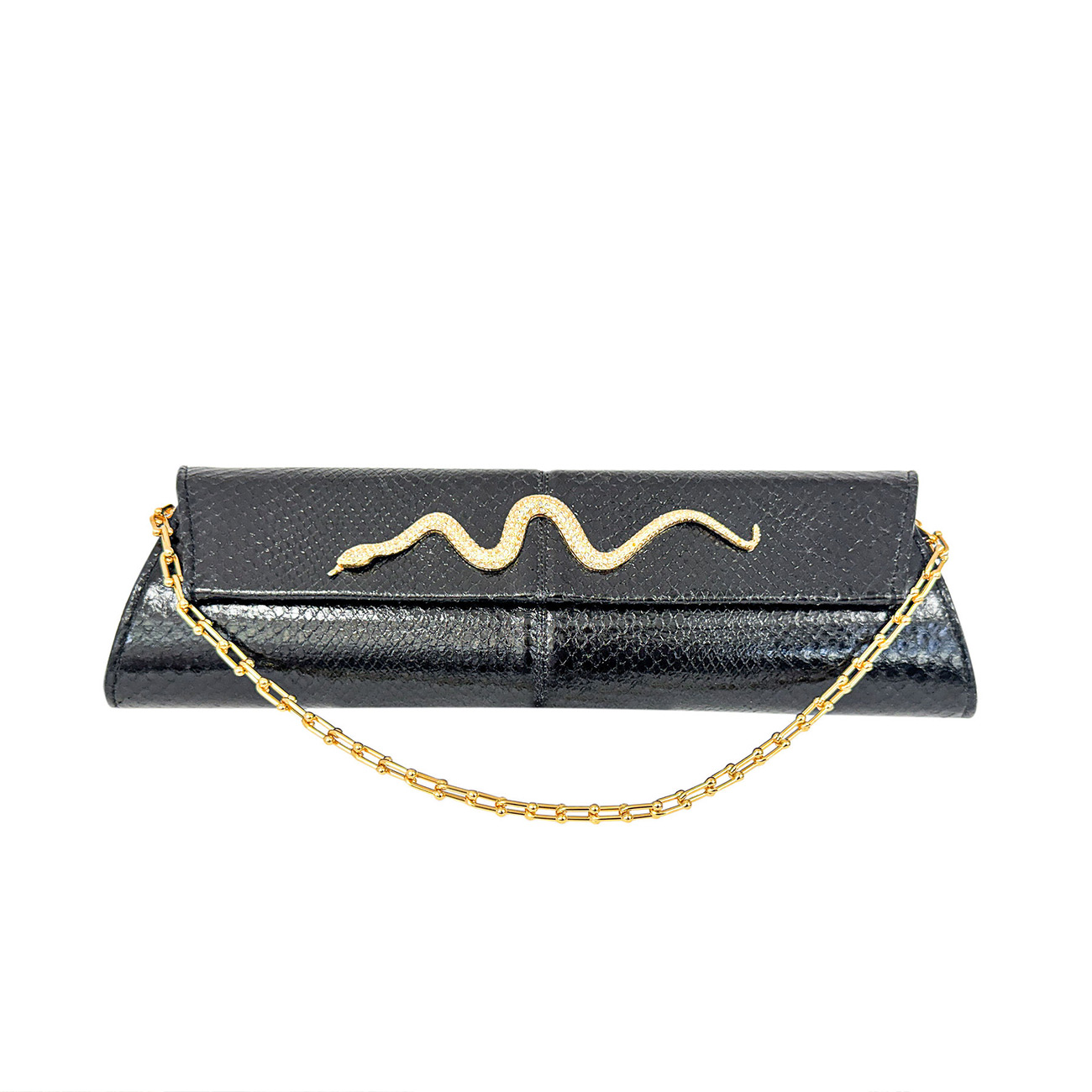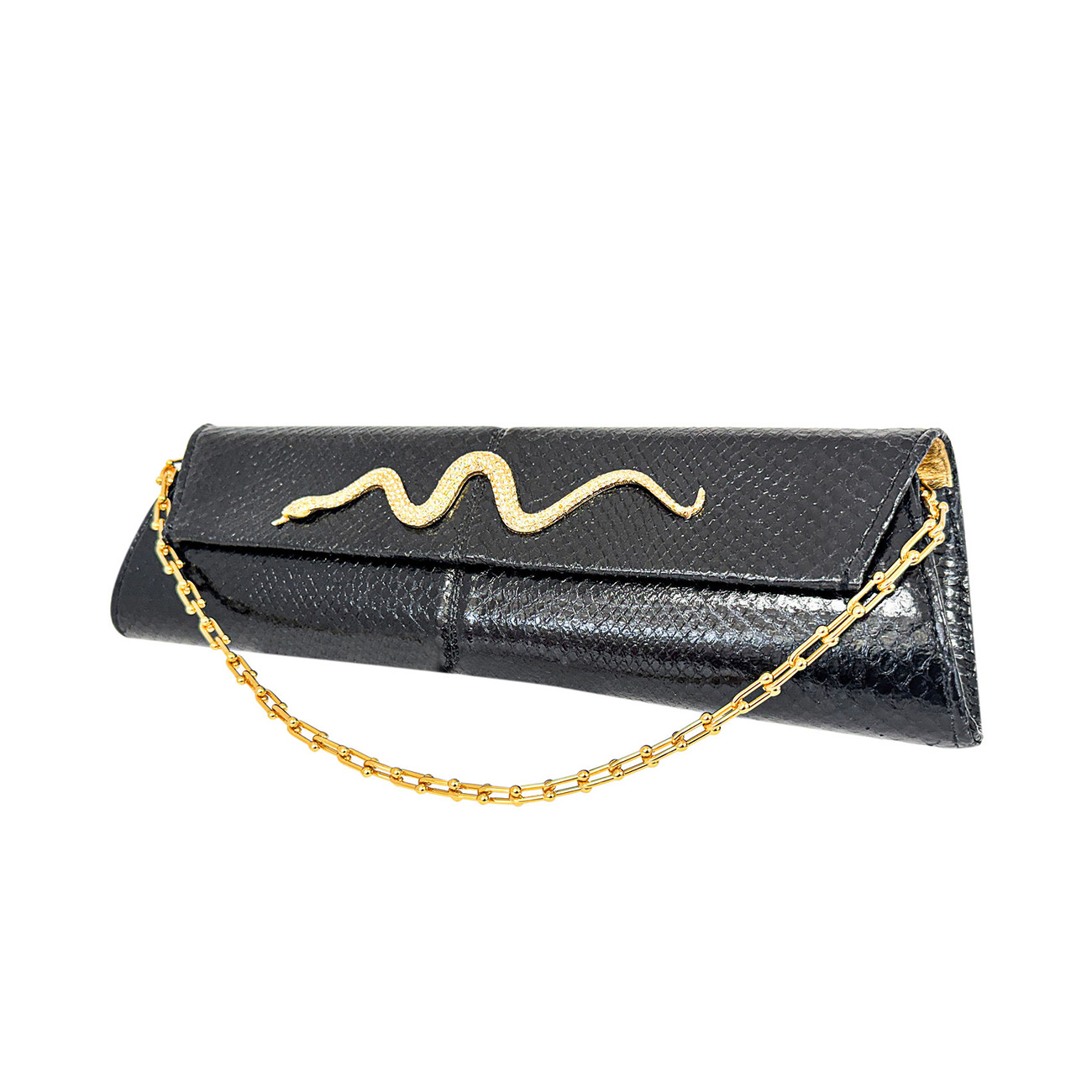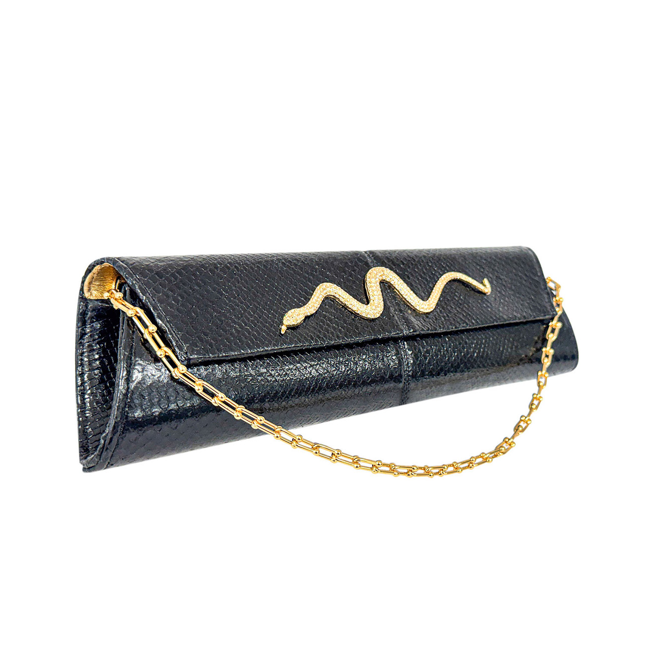 At its center rests a 50-year-old vintage Kenneth Jay Lane gold serpentine brooch, exquisitely handset with brilliant crystals, coiling across the clutch as a symbol of power, protection, and enduring allure. The sculptural serpent brings a sense of movement and heritage, seamlessly merging iconic design with modern luxury.