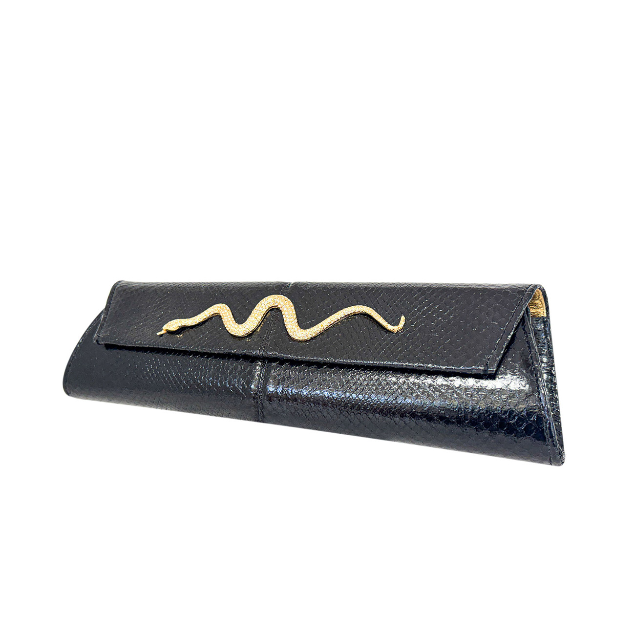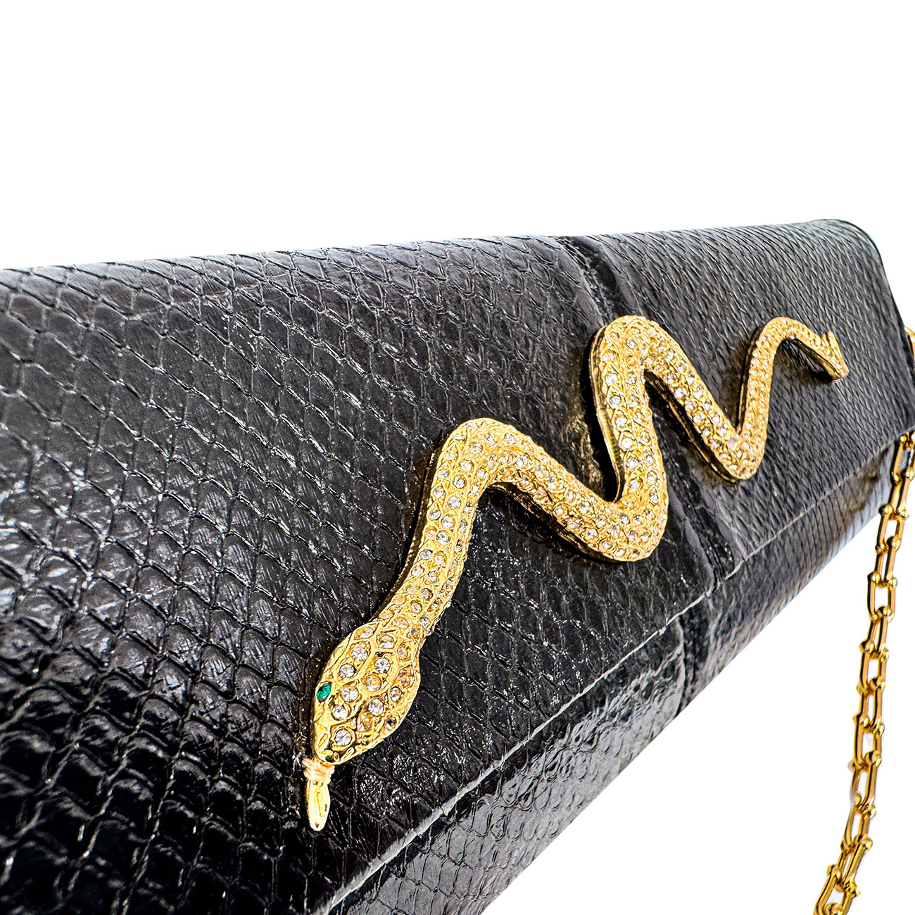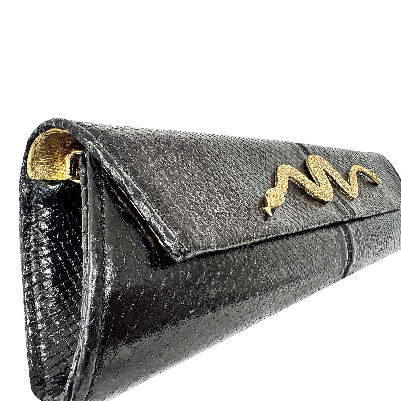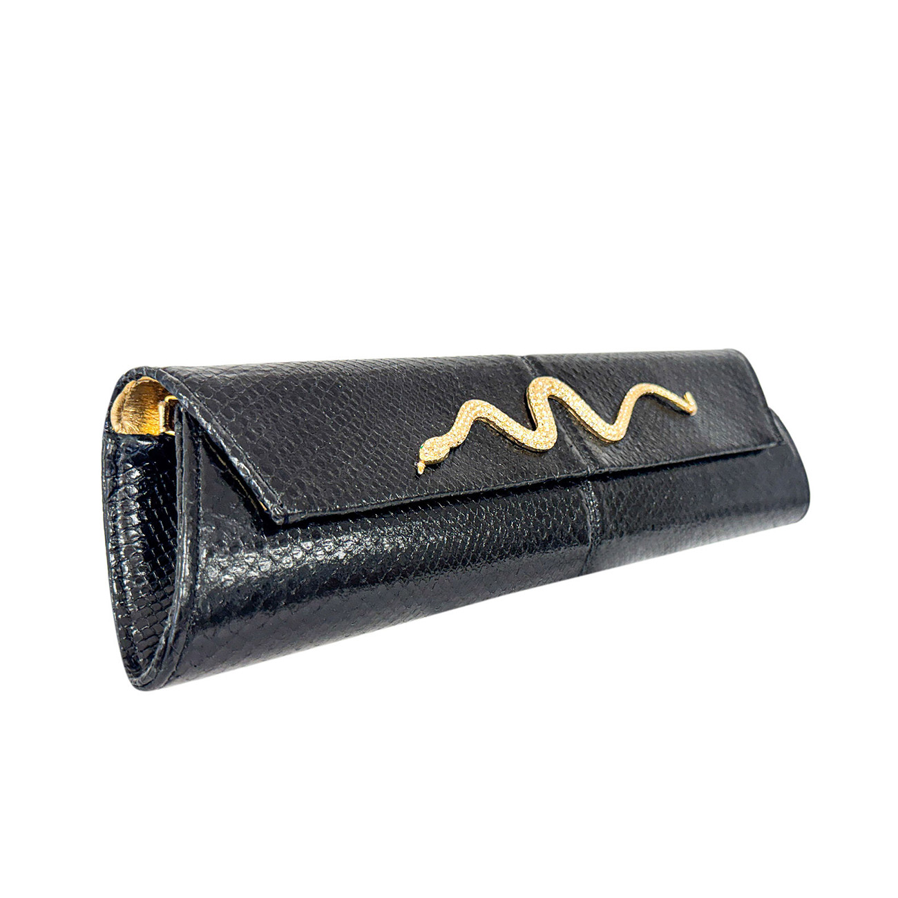 At its center rests a 50-year-old vintage Kenneth Jay Lane gold serpentine brooch, exquisitely handset with brilliant crystals, coiling across the clutch as a symbol of power, protection, and enduring allure. The sculptural serpent brings a sense of movement and heritage, seamlessly merging iconic design with modern luxury.