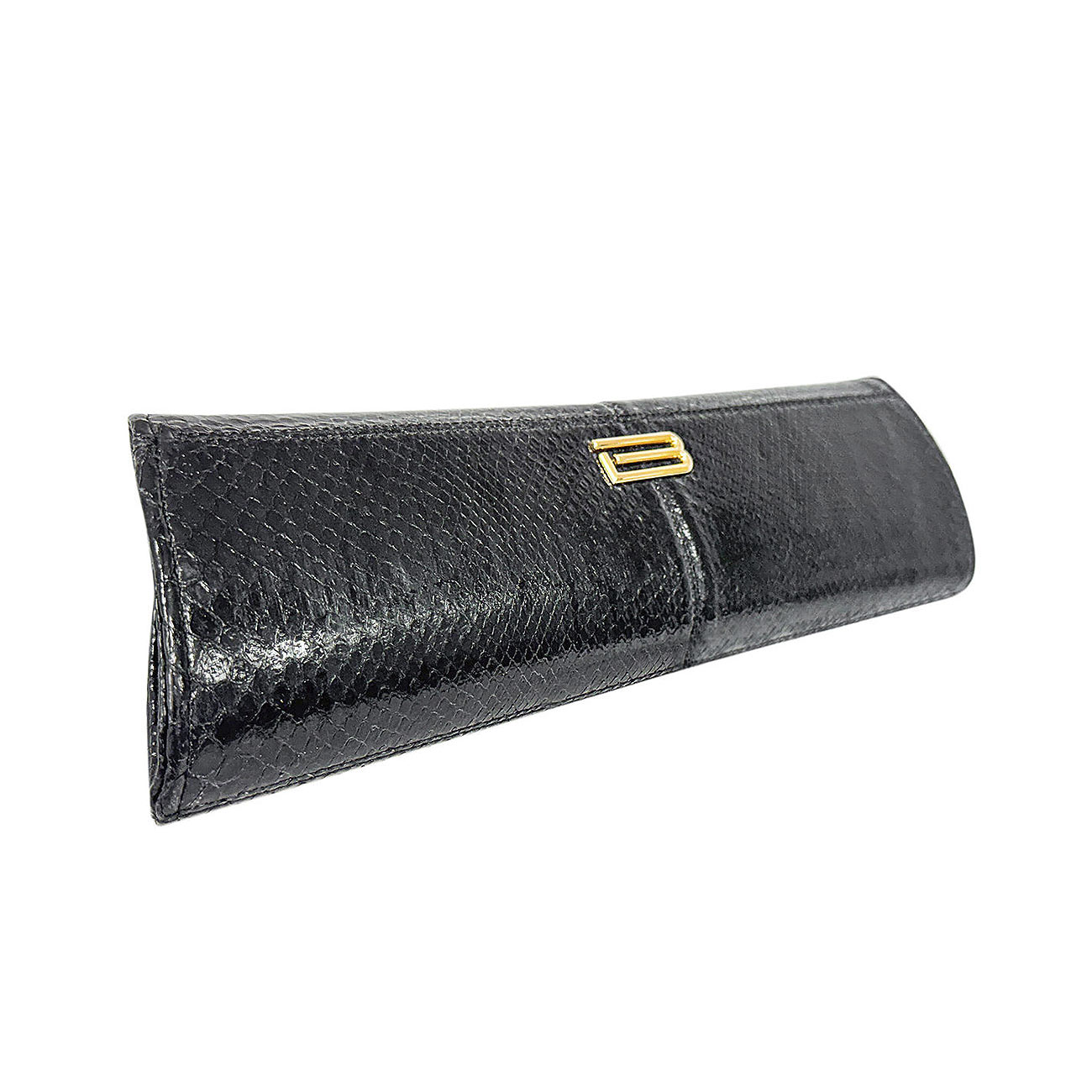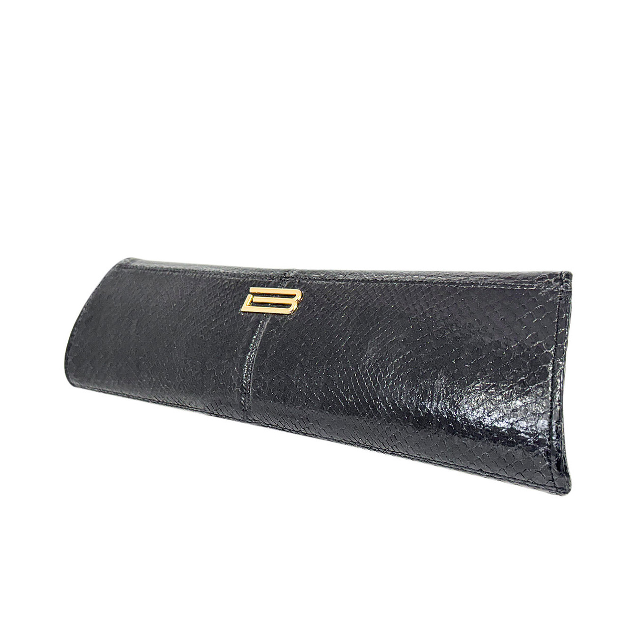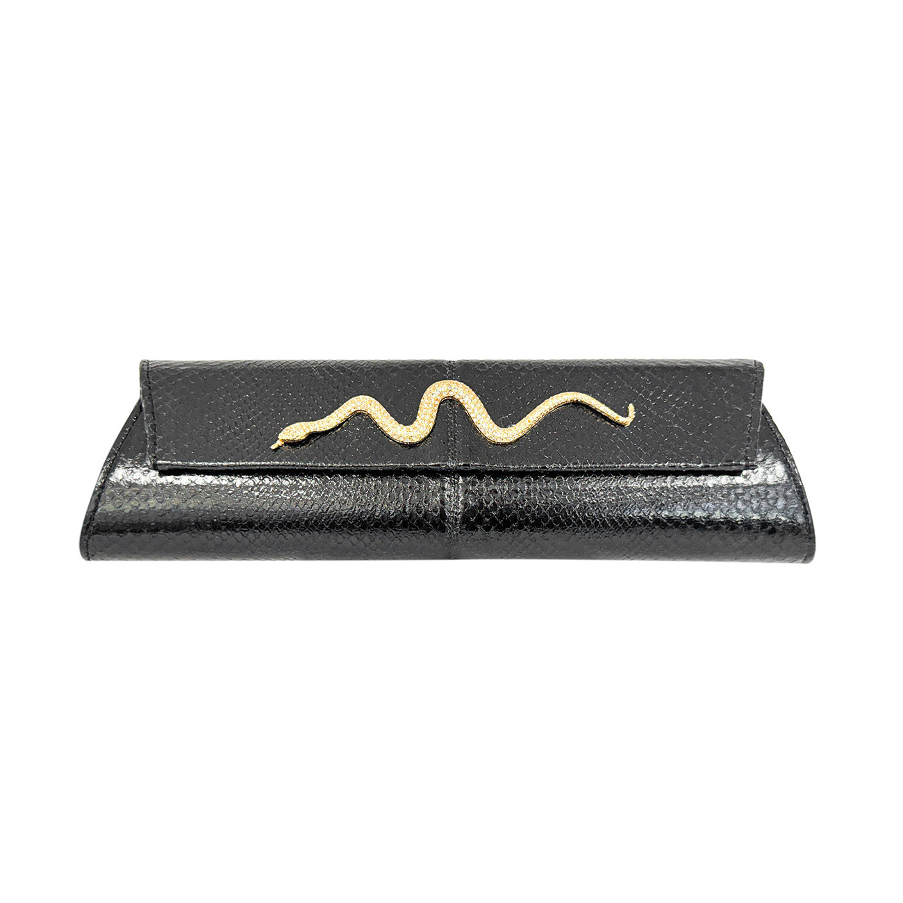 The BSWANKY Wisteria Serpentine in Ebony Python Clutch is a study in timeless seduction, handcrafted in ebony python, its polished scales revealing a deep, lustrous black with subtle dimension and quiet brilliance. Sleek and architectural in silhouette, the Wisteria serves as a refined canvas for an extraordinary adornment drawn from fashion history.