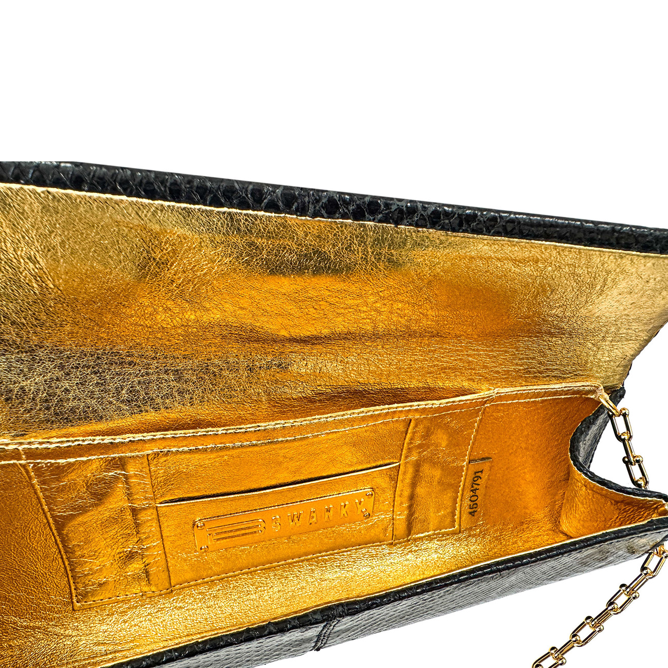 The interior is lined in luminous metallic gold lambskin, offering a sumptuous contrast to the dramatic exterior, while a 24-karat gold-plated chain allows for effortless versatility from clutch to shoulder wear. Designed as a true collector’s piece, the Wisteria Serpentine in Ebony Python Clutch transcends accessory-standing as a wearable work of art meant to be treasured, admired, and passed through generations.